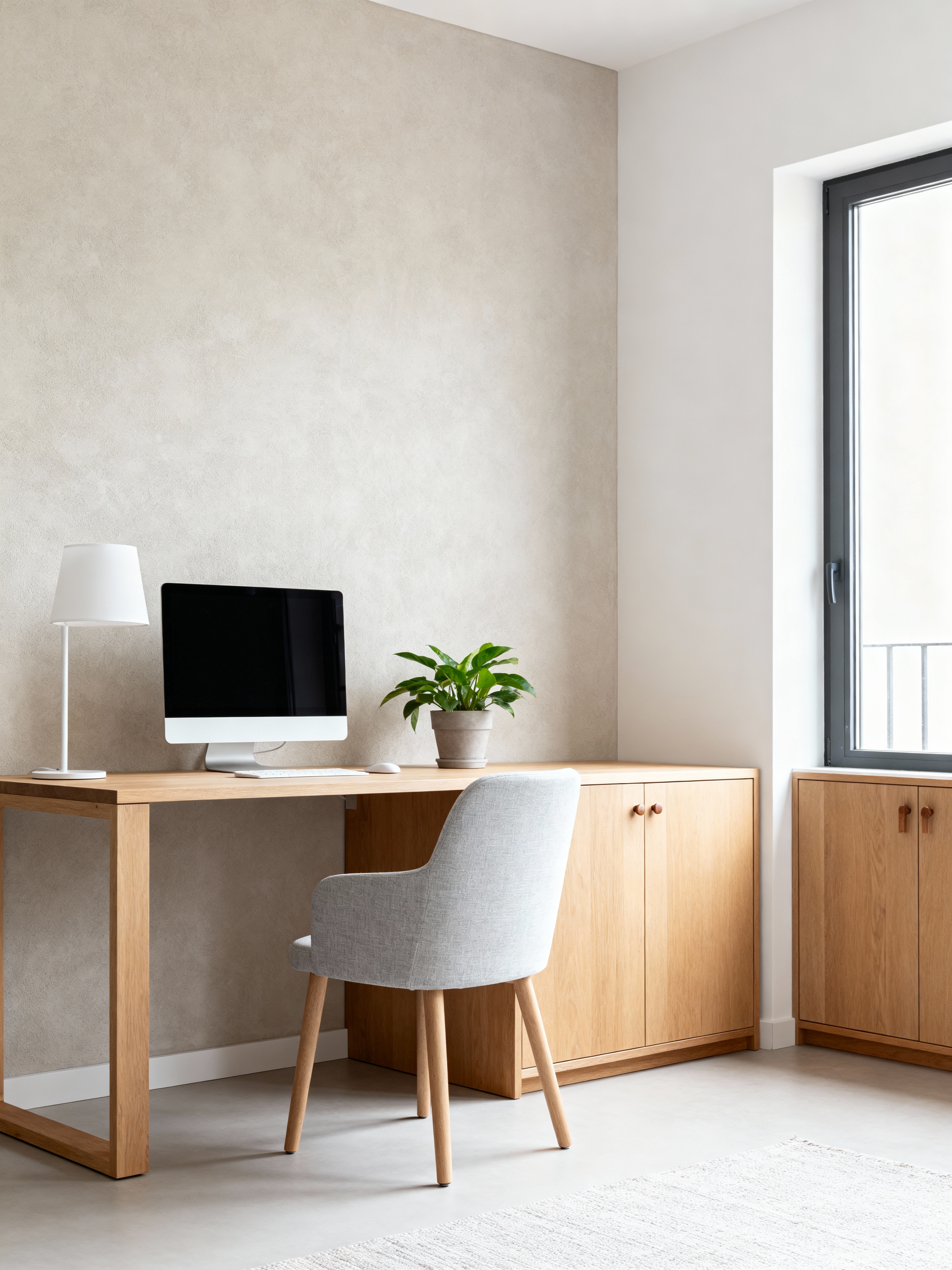 home office with airbnb style with computer desk and desk lamp and cabinets and plant and office chair and computer desk. . with scandinavian style and simple color palette and simple, clean lines and simplistic furniture and practicality and functionality and neutral walls and textures and open and natural lighting and natural materials and elements and scandinavian style