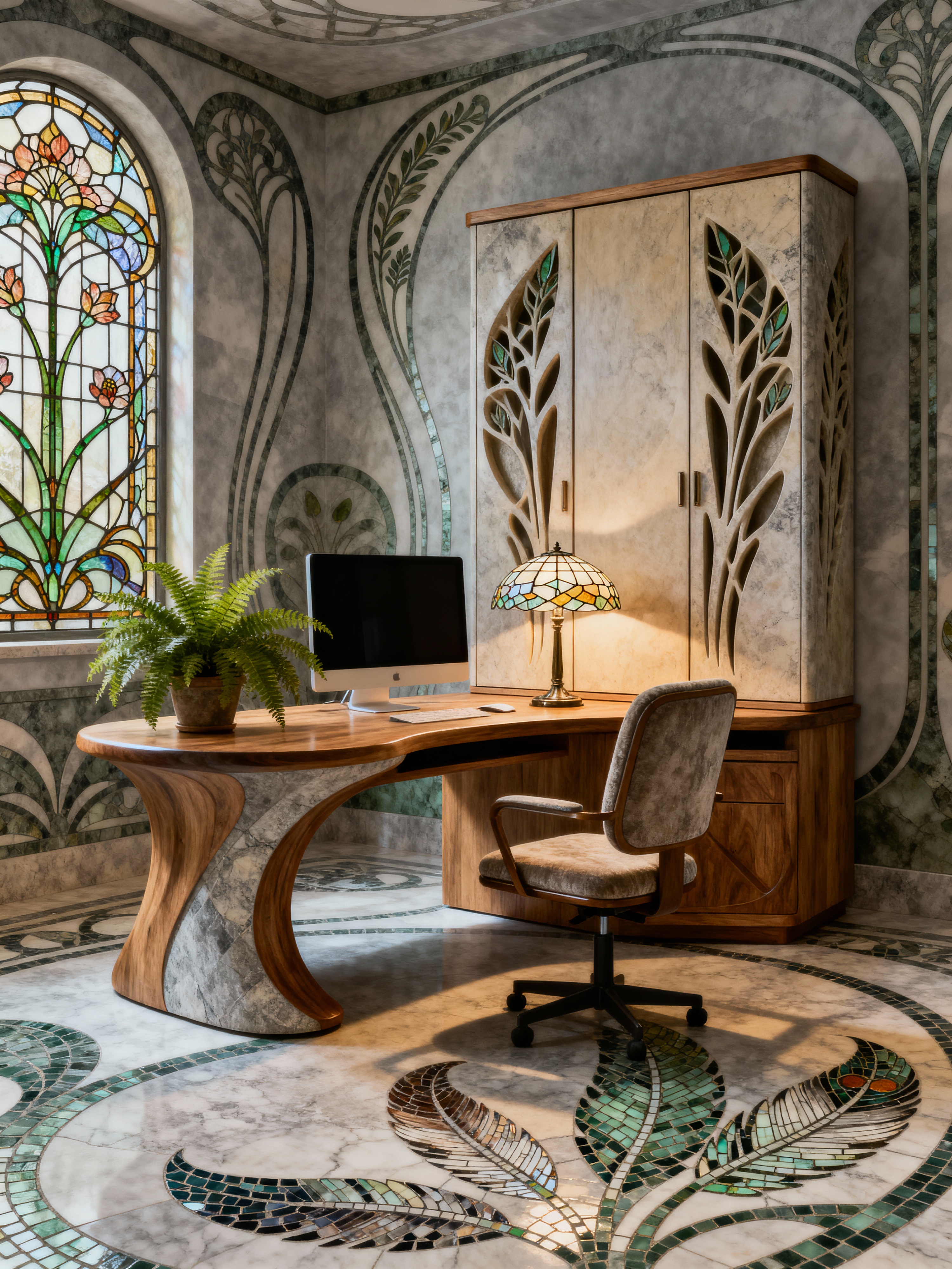 home office with art nouveau style with computer desk and cabinets and plant and desk lamp and office chair and computer desk. . with mosaics and wallpaper patterns of feathers and stained glass and curving, plant-like embellishments and asymmetrical shapes and stained glass and natural materials and ashy colors