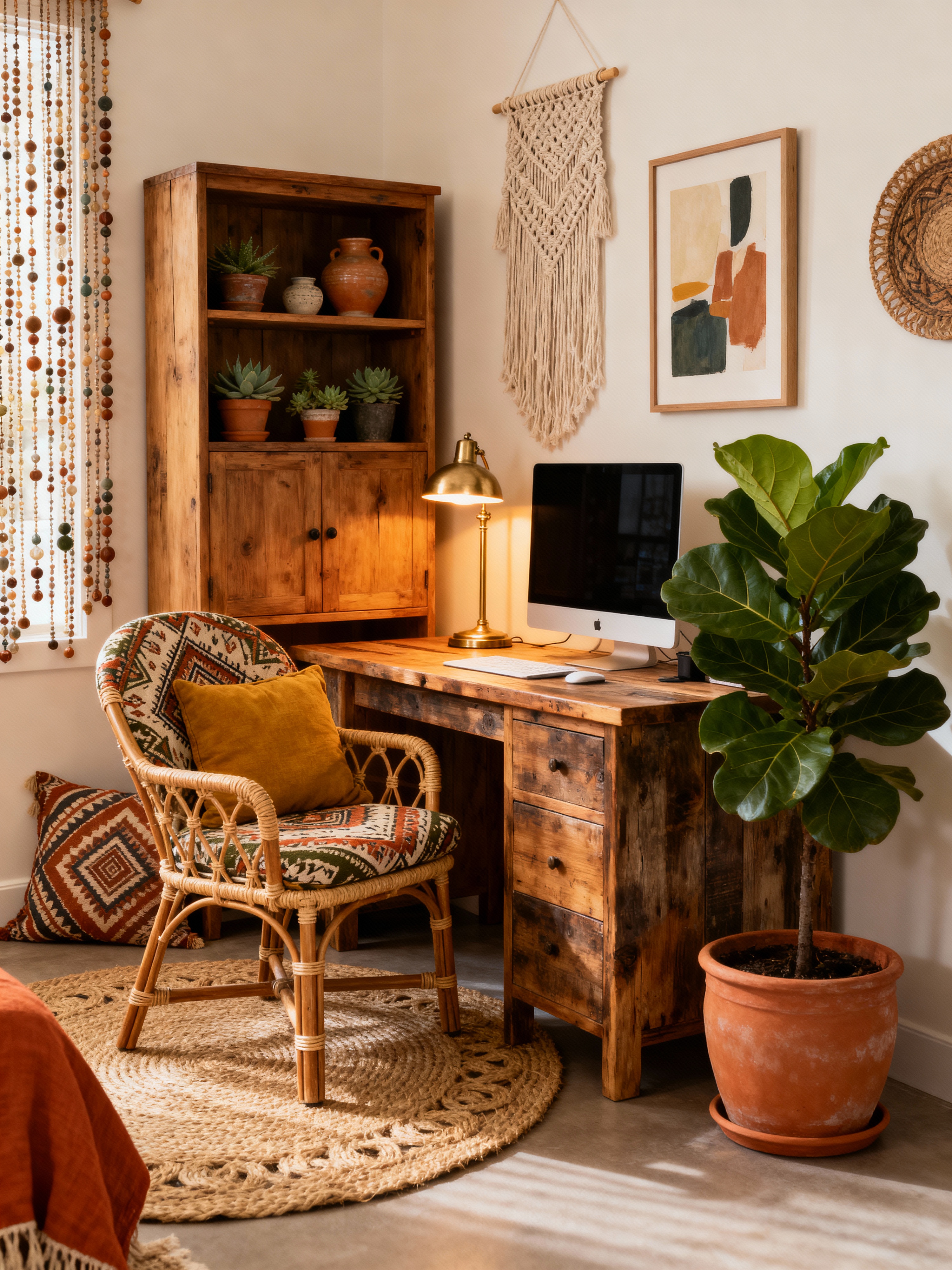 home office with boho-chic style with office chair and cabinets and computer desk and plant and desk lamp and office chair. . with relaxed atmosphere and artistic touches and earthy colors and layered textiles and free-spirited and eclectic mix and bohemian flair and natural materials