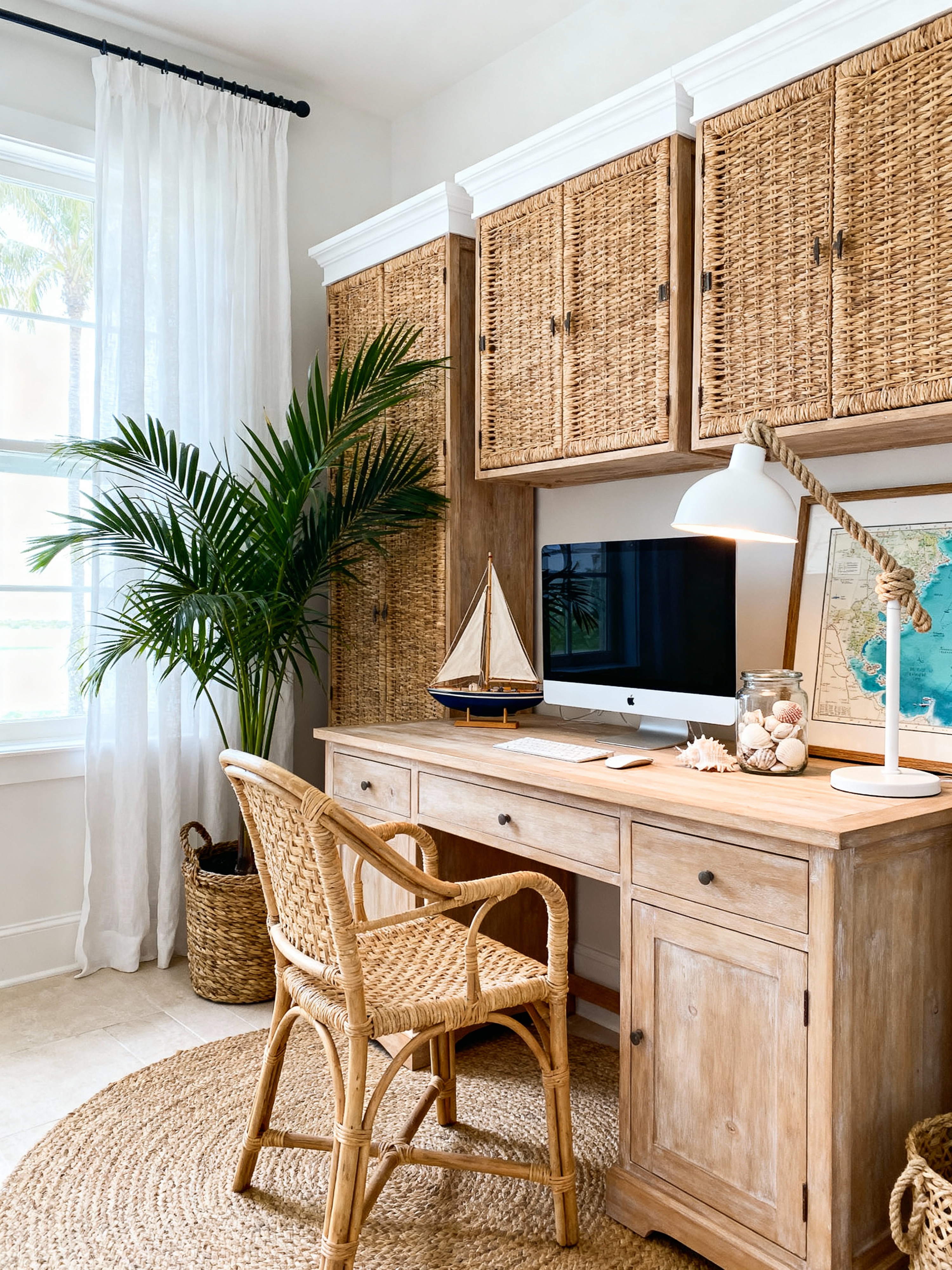 home office with coastal style with office chair and cabinets and computer desk and plant and desk lamp and office chair. . with nautical decor and wicker furniture and ocean-inspired and natural materials and relaxed style and sand tones and white decor and seaside colors