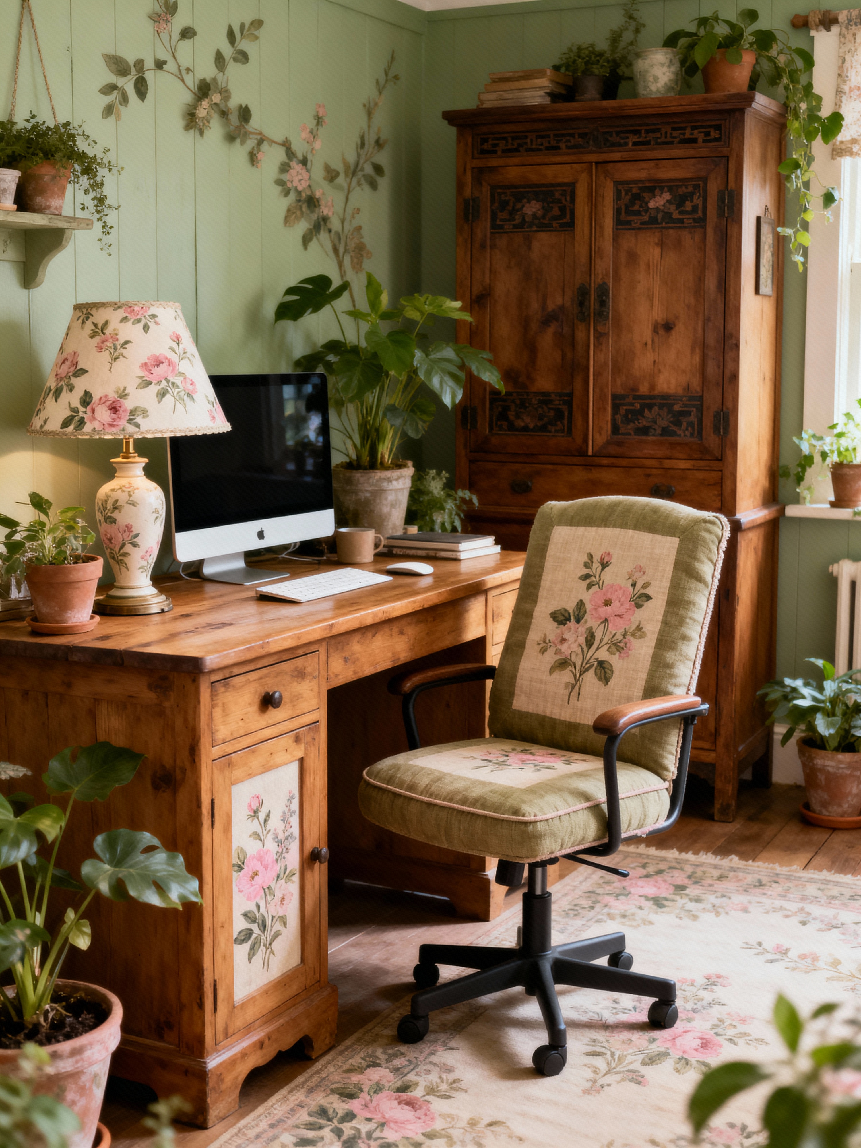 home office with cottagecore style with plant and computer desk and office chair and desk lamp and cabinets and plant. . with cottage style and floral patterns and traditional and earthy and organic and rustic and country style and muted colors