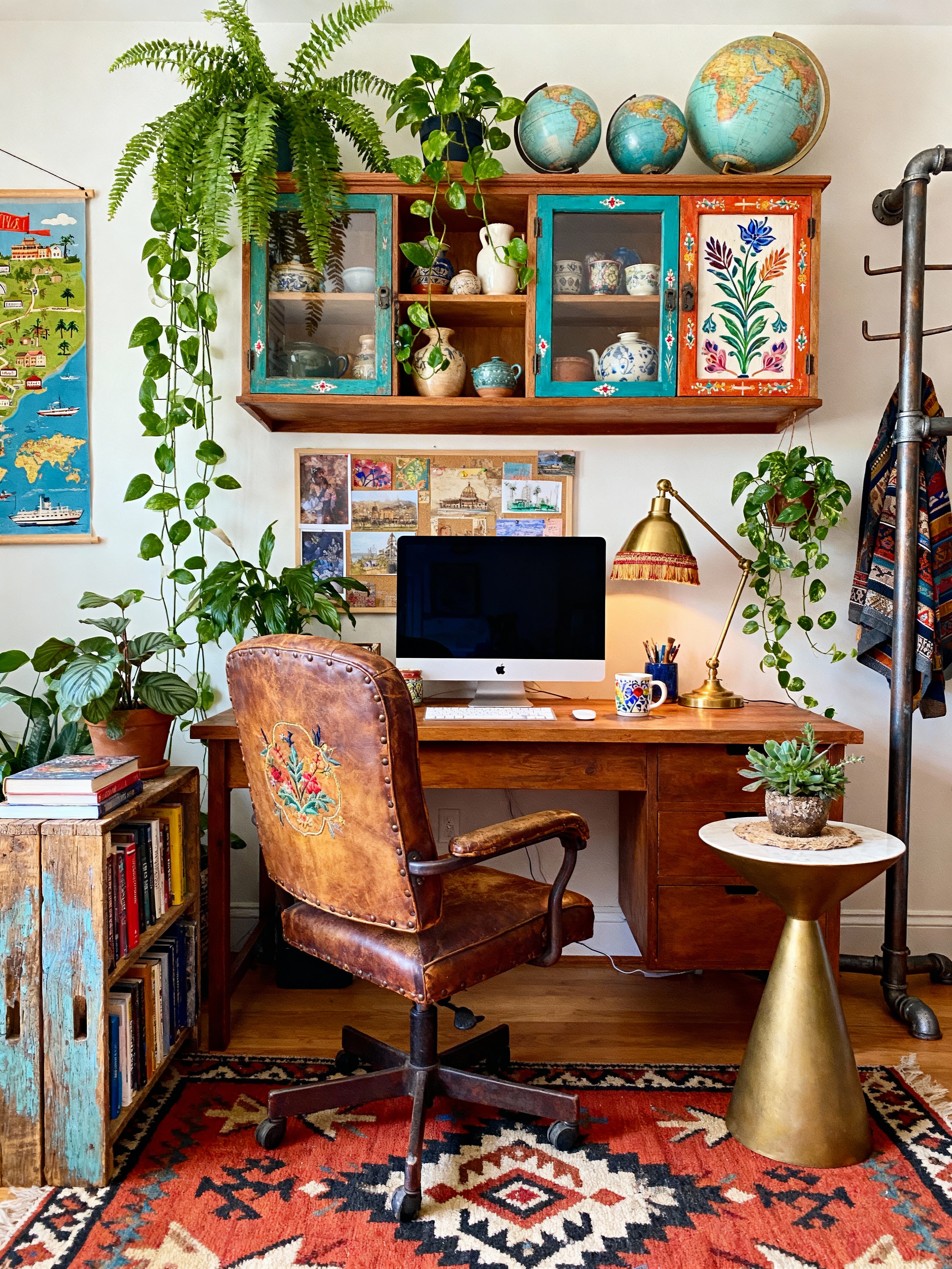 home office with eclectic style with plant and office chair and desk lamp and cabinets and computer desk and plant. . with personal expression and global influences and colorful palette and vintage finds and unexpected elements and unique pieces and layered textures and creative freedom