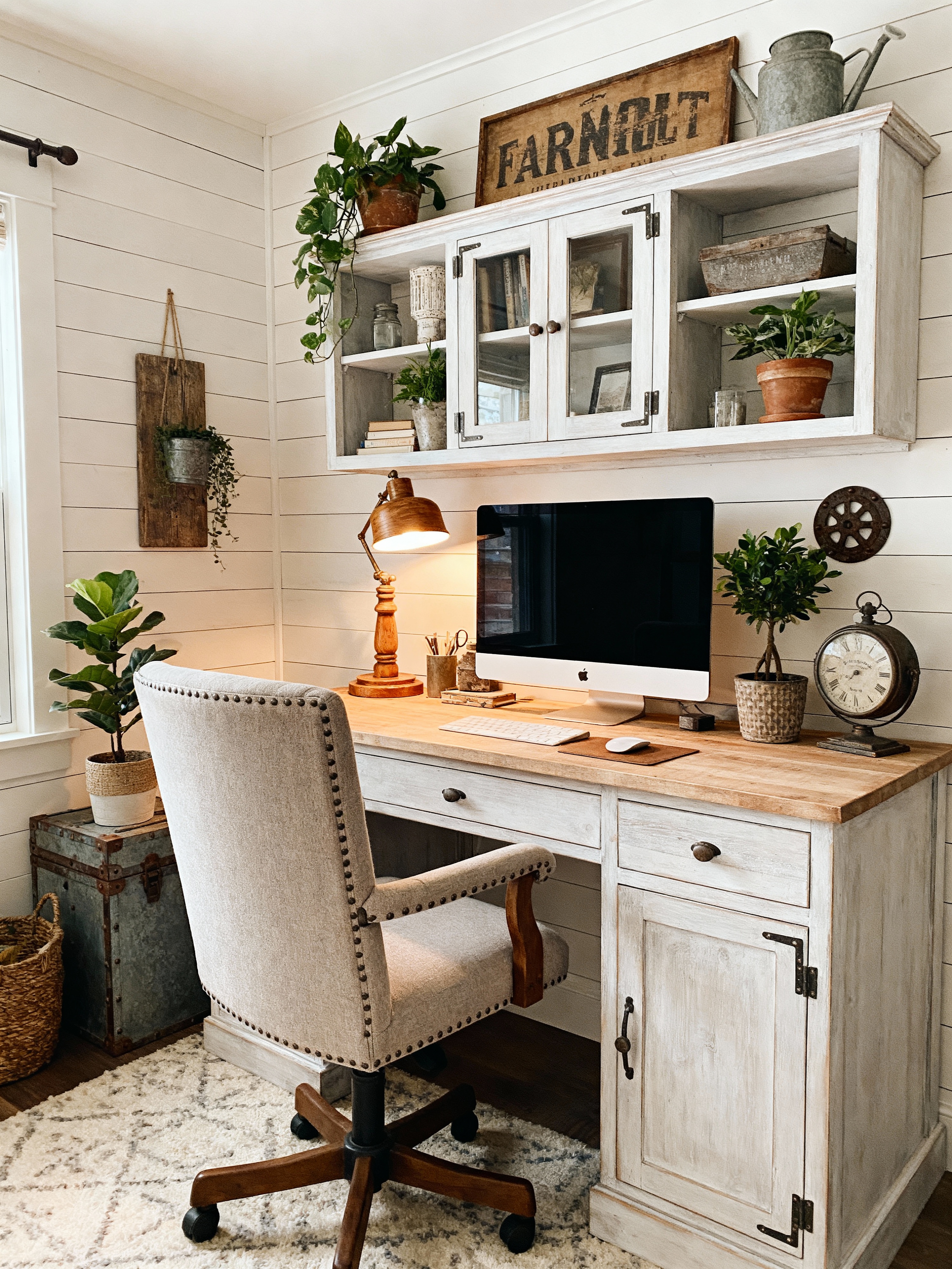 home office with farmhouse style with desk lamp and office chair and cabinets and computer desk and plant and desk lamp. . with cozy feel and open shelving and natural textures and vintage decor and country style and neutral tones and industrial accents and shiplap walls