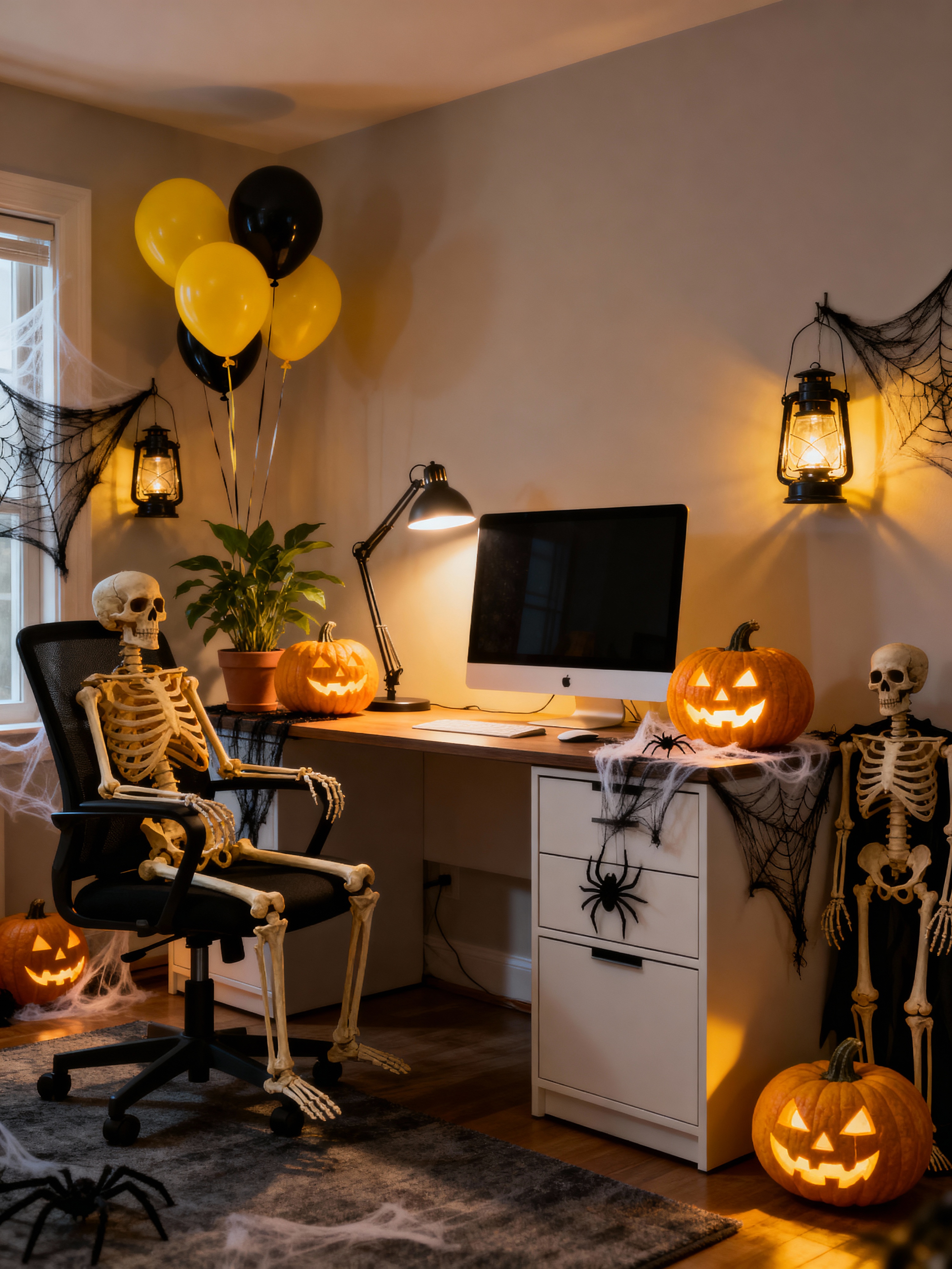 home office with halloween style with computer desk and cabinets and desk lamp and office chair and plant and computer desk. . with glowing pumpkins and skeletons sitting and standing and yellow black balloons and lanterns and cobwebs and spiderwebs and cobwebs and lanterns