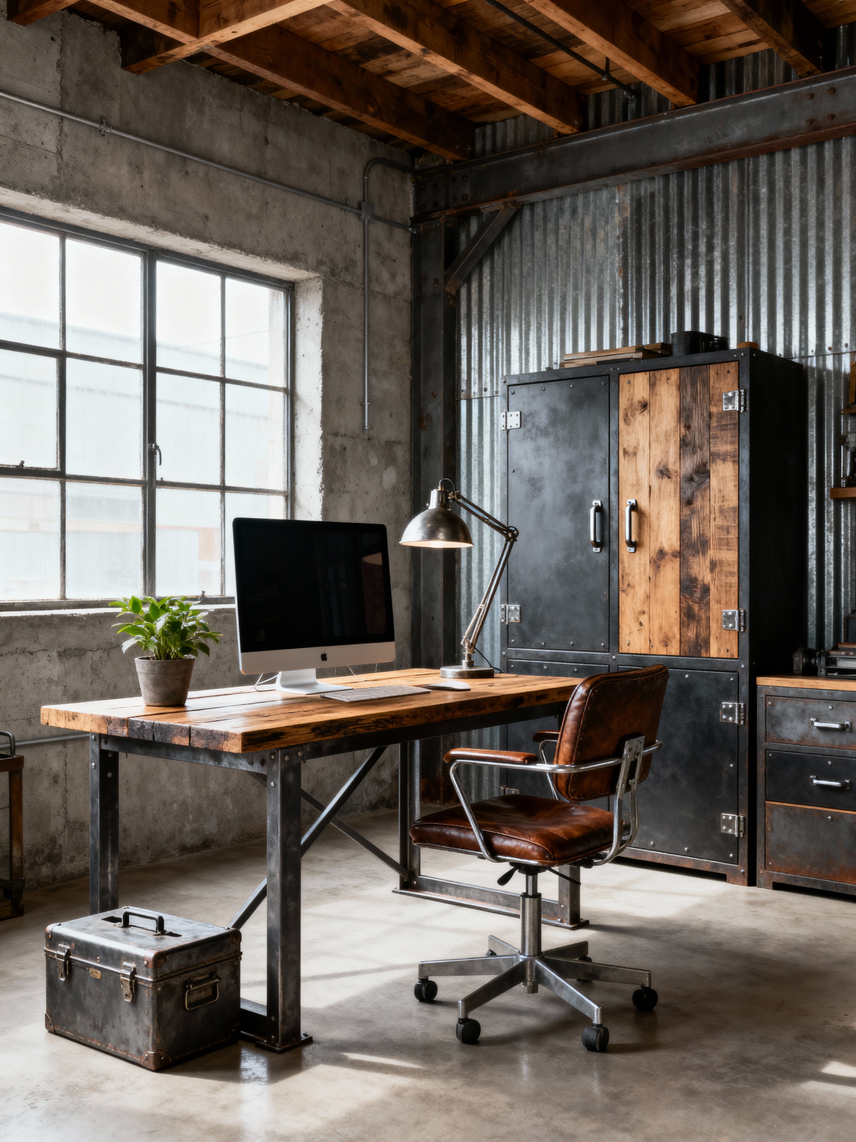 home office with industrial style with cabinets and office chair and computer desk and desk lamp and plant and cabinets. . with raw aesthetic and metal panels and reclaimed wood and exposed concrete and exposed rafters and factory style and utilitarian objects and open floorplan
