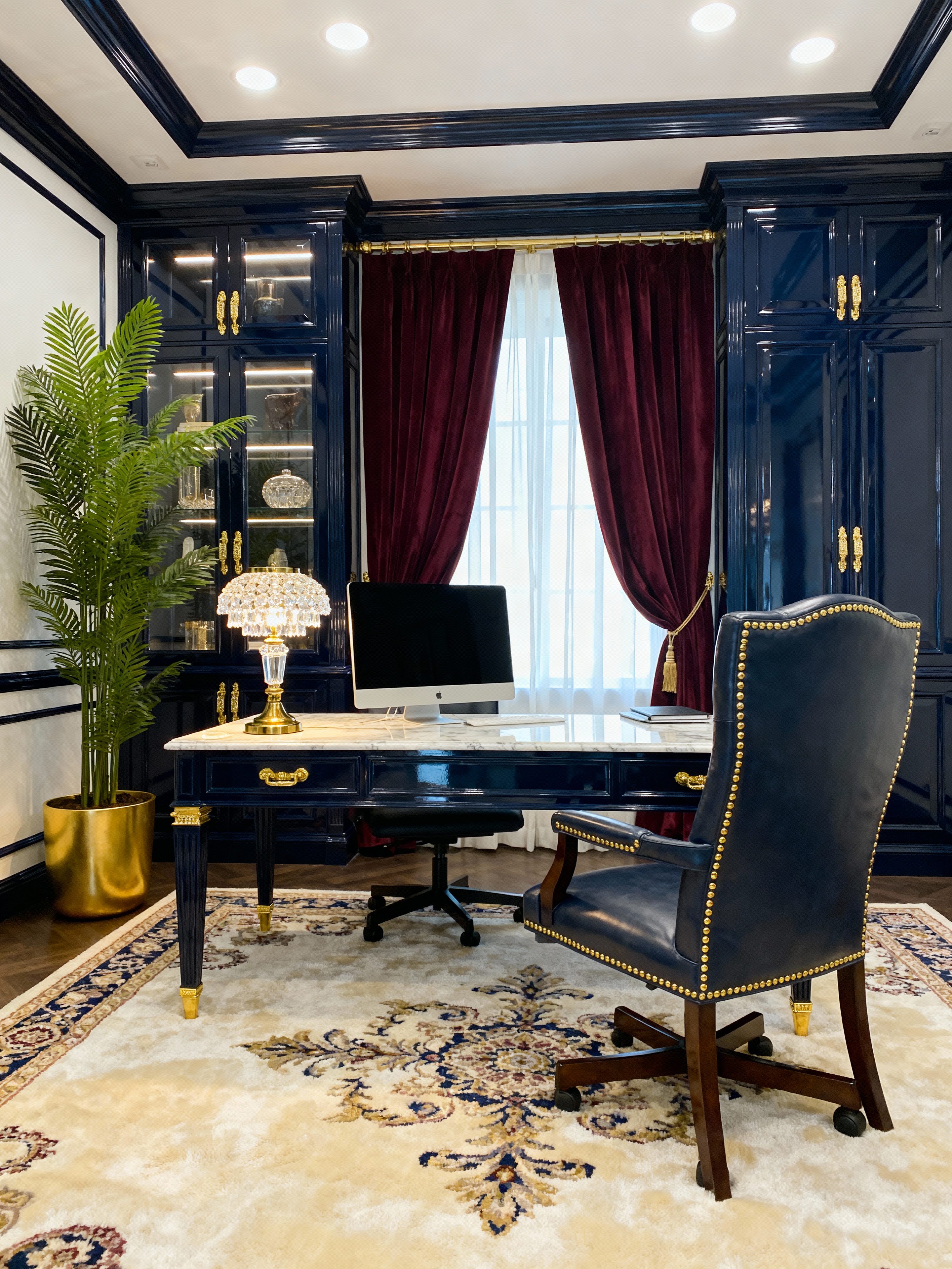 home office with luxury style with cabinets and office chair and computer desk and desk lamp and plant and cabinets. . with premium finishes and exclusive design and lavish comfort and opulent details and designer furniture and sophisticated style and expensive fabrics and elegant lighting