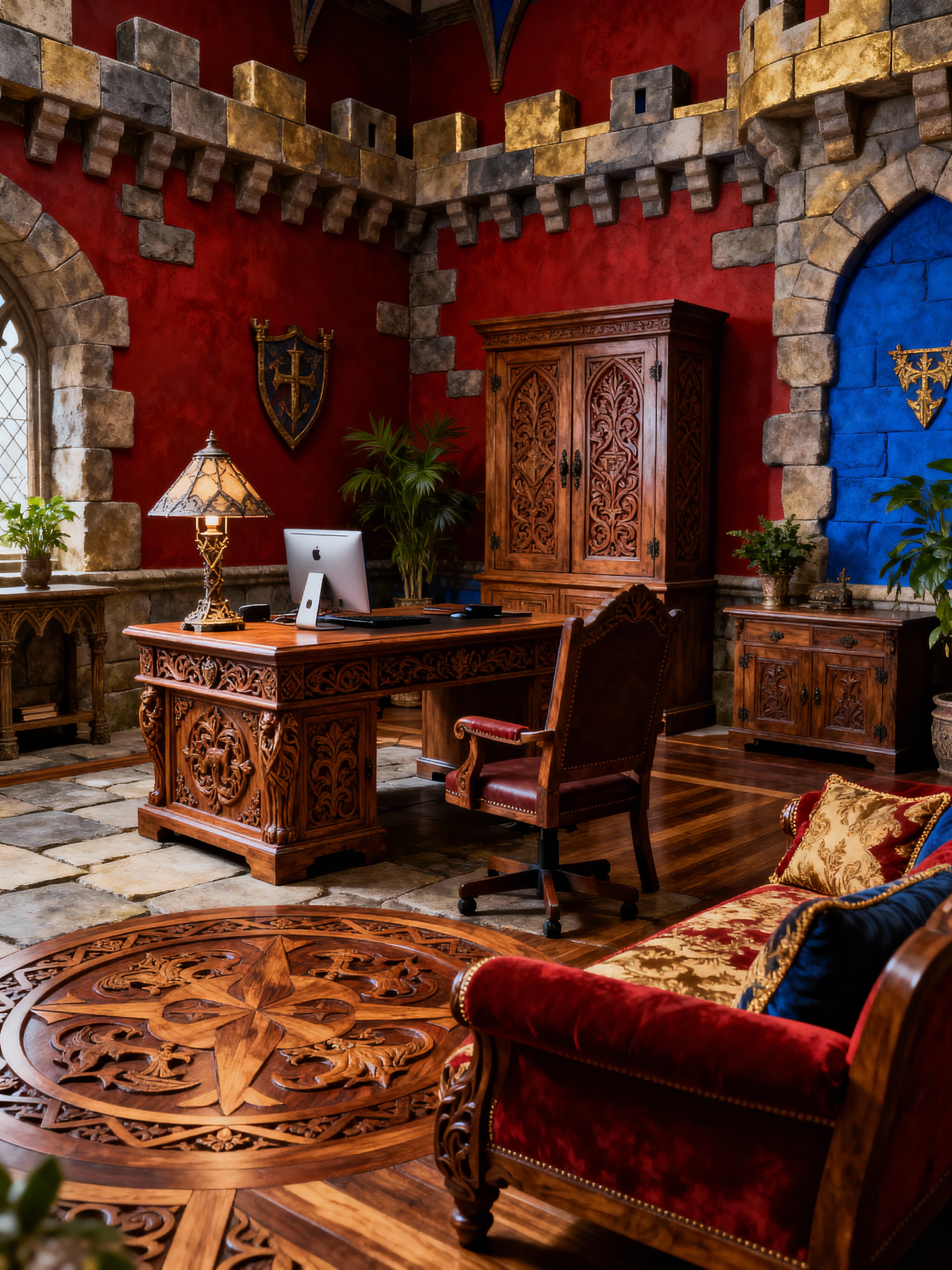 home office with medieval style with plant and cabinets and desk lamp and computer desk and office chair and plant. . with stone or wooden floor and intricate wooden inlay designs and carvings and heavy furniture pieces and stone walls and castle interior and deep colors like red, gold, or blue and upholstery on chairs and sofas and carved wooden tables