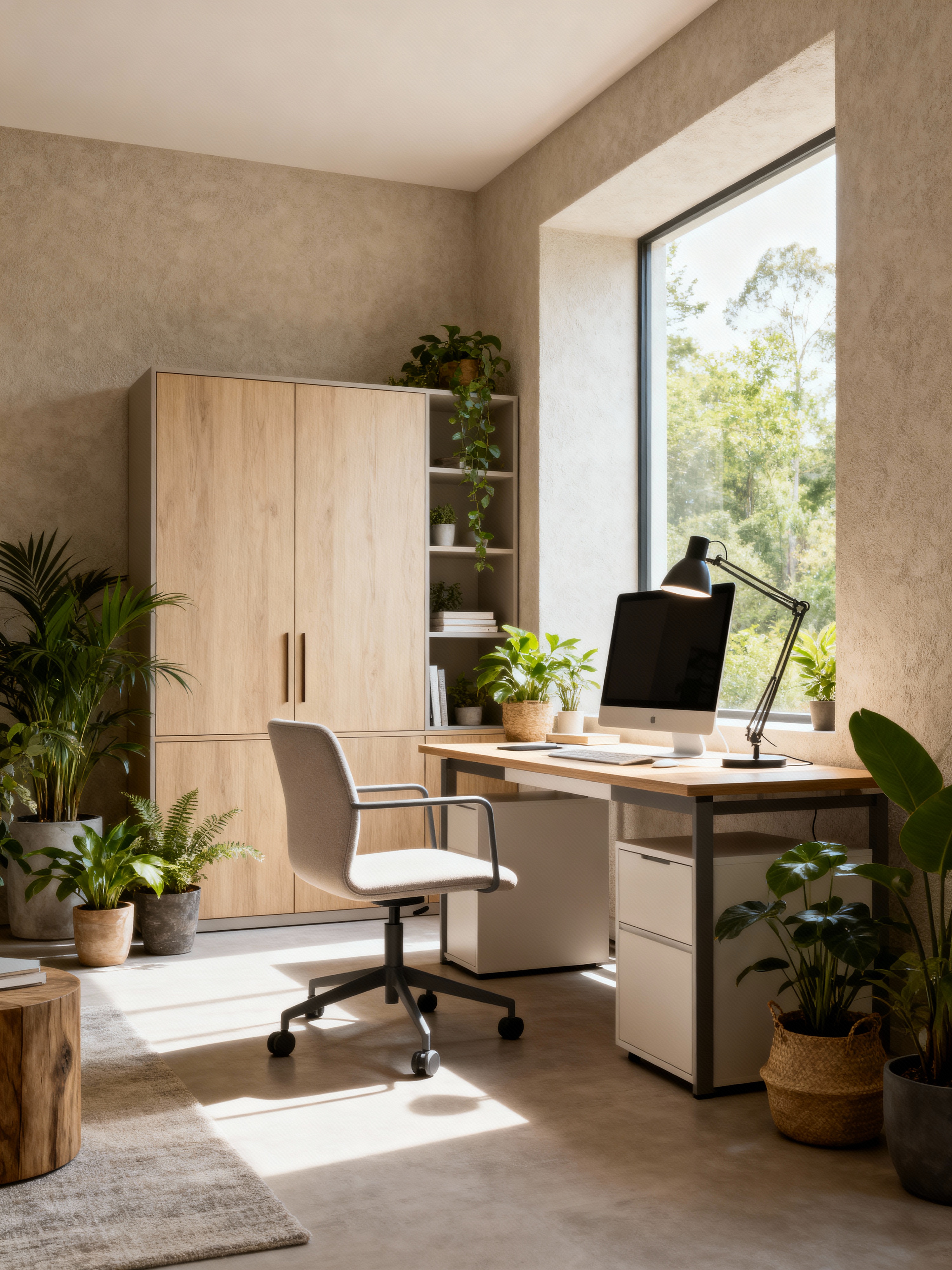 home office with modern style with plant and office chair and cabinets and computer desk and desk lamp and plant. . with open and natural lighting and neutral walls and textures and practicality and functionality and simple, clean lines and simplistic furniture and natural materials and elements and open and natural lighting