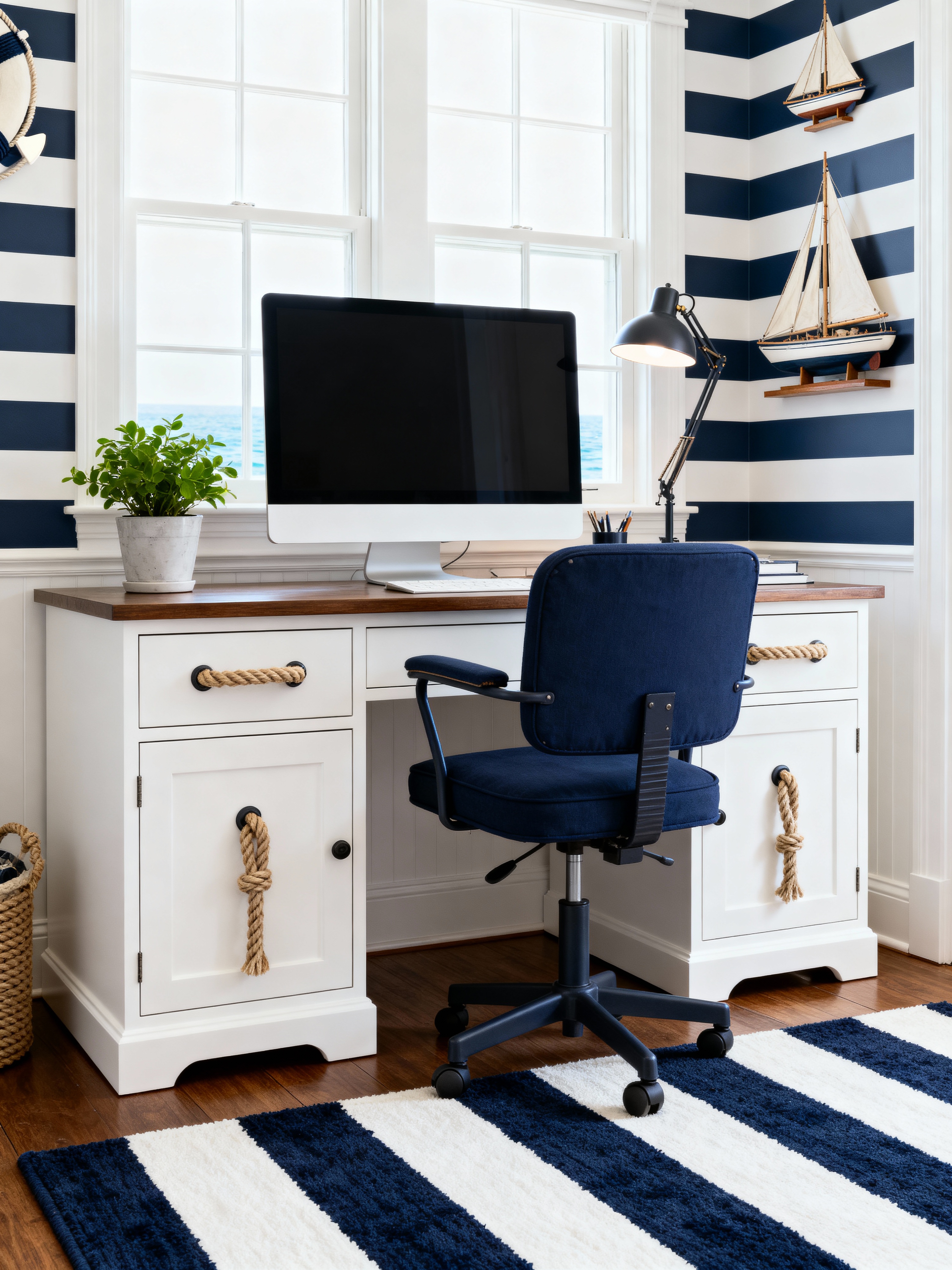 home office with nautical style with cabinets and plant and desk lamp and office chair and computer desk and cabinets. . with coastal vibes and striped patterns and rope details and navy blue and crisp white and sailboat elements and maritime decor and ocean inspiration