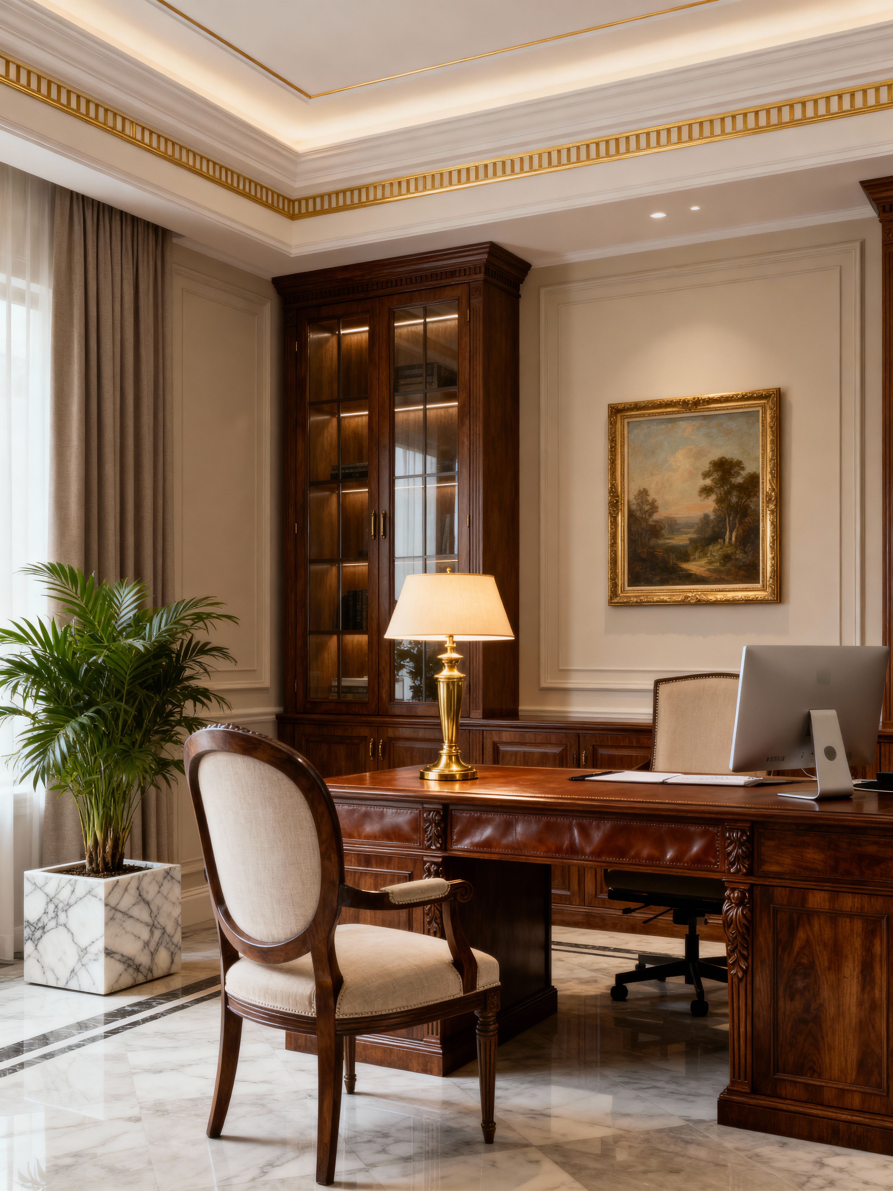 home office with neoclassic style with office chair and plant and desk lamp and cabinets and computer desk and office chair. . with timeless furniture and elegant and sophisticated and geometric decorative elements and symmetric layouts and thoughtful minimalism and high ceilings and timeless artwork and emphasized horizontal and vertical lines