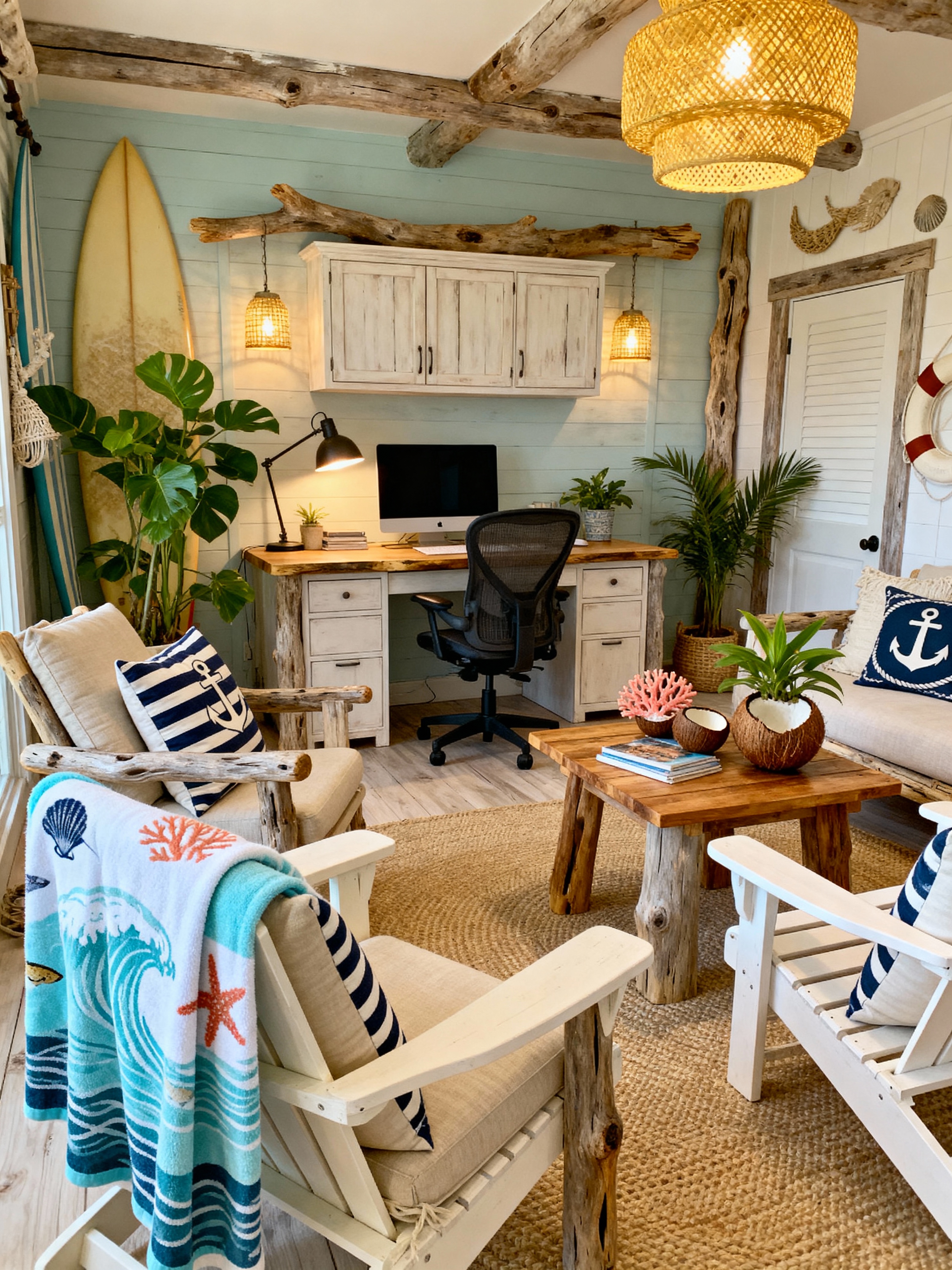 home office with surf shack style with office chair and plant and desk lamp and computer desk and cabinets and office chair. . with coastal lighting and beachy throw pillows and beach towels and ocean-inspired colors and driftwood furniture and beach chairs and casual dining and coconut decor