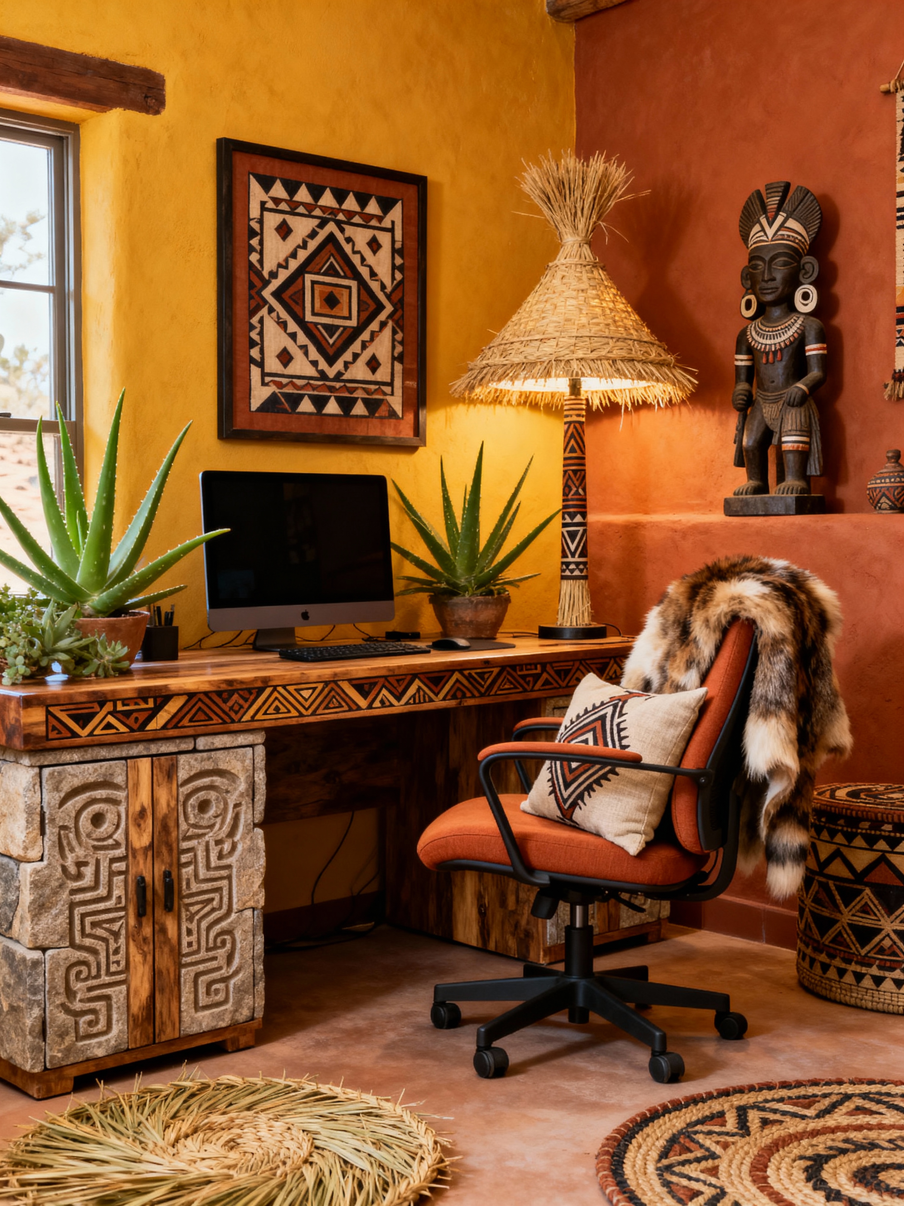 home office with tribal style with computer desk and plant and office chair and desk lamp and cabinets and computer desk. . with tribal patterns and exuberant splashes of colour and sculptures and artworks and animal furslinen and intricate grass weaving and planks of stone and tribal revival and desert colours