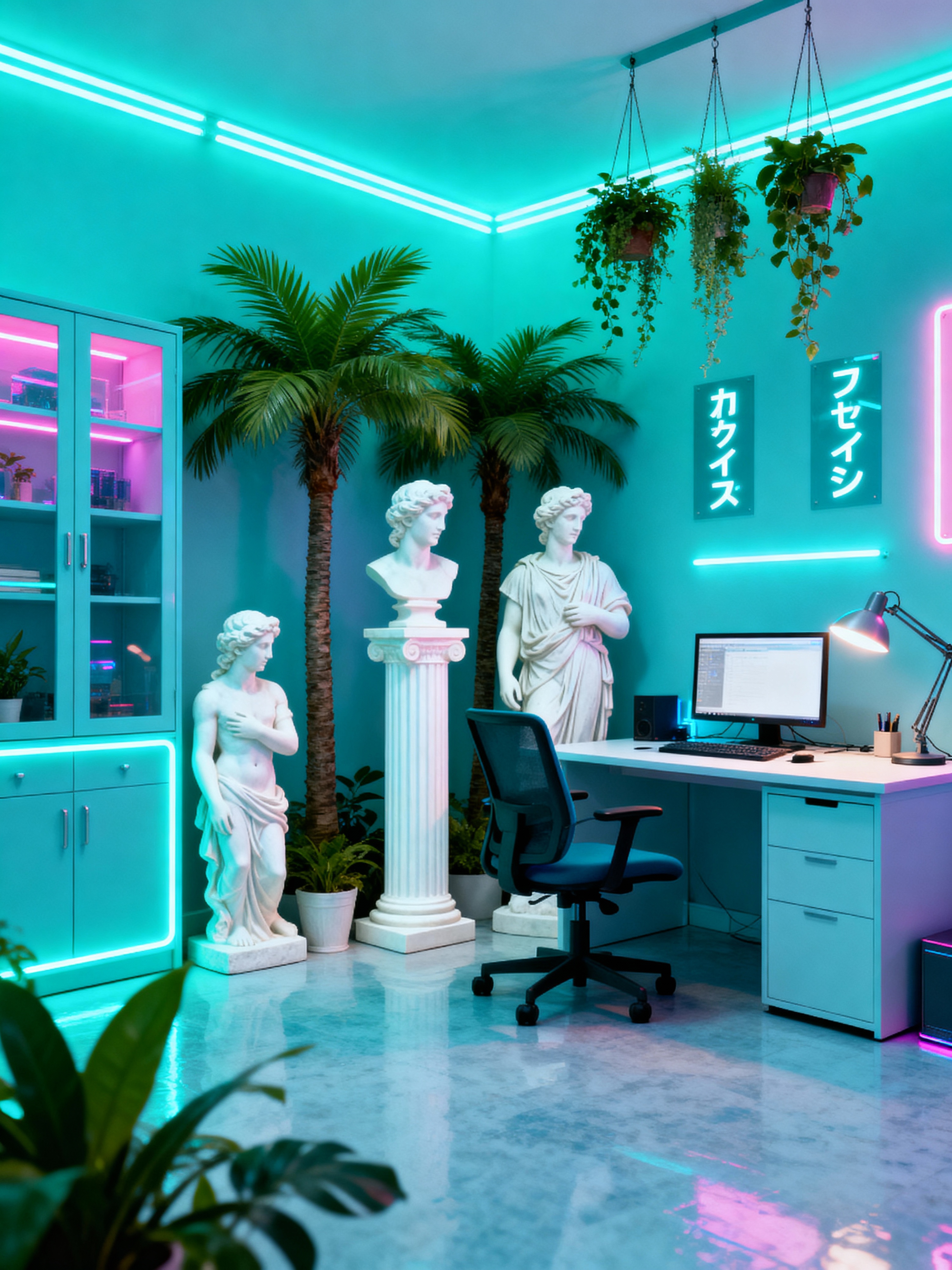 home office with vaporwave style with cabinets and office chair and computer desk and desk lamp and plant and cabinets. . with palm trees and white roman statues, white roman sculptures, white roman columns, white roman pillars in the center of the room, and teal colors and hanging plants and neon glow and baby blue and japanese letters on wall and japanese letters on wall