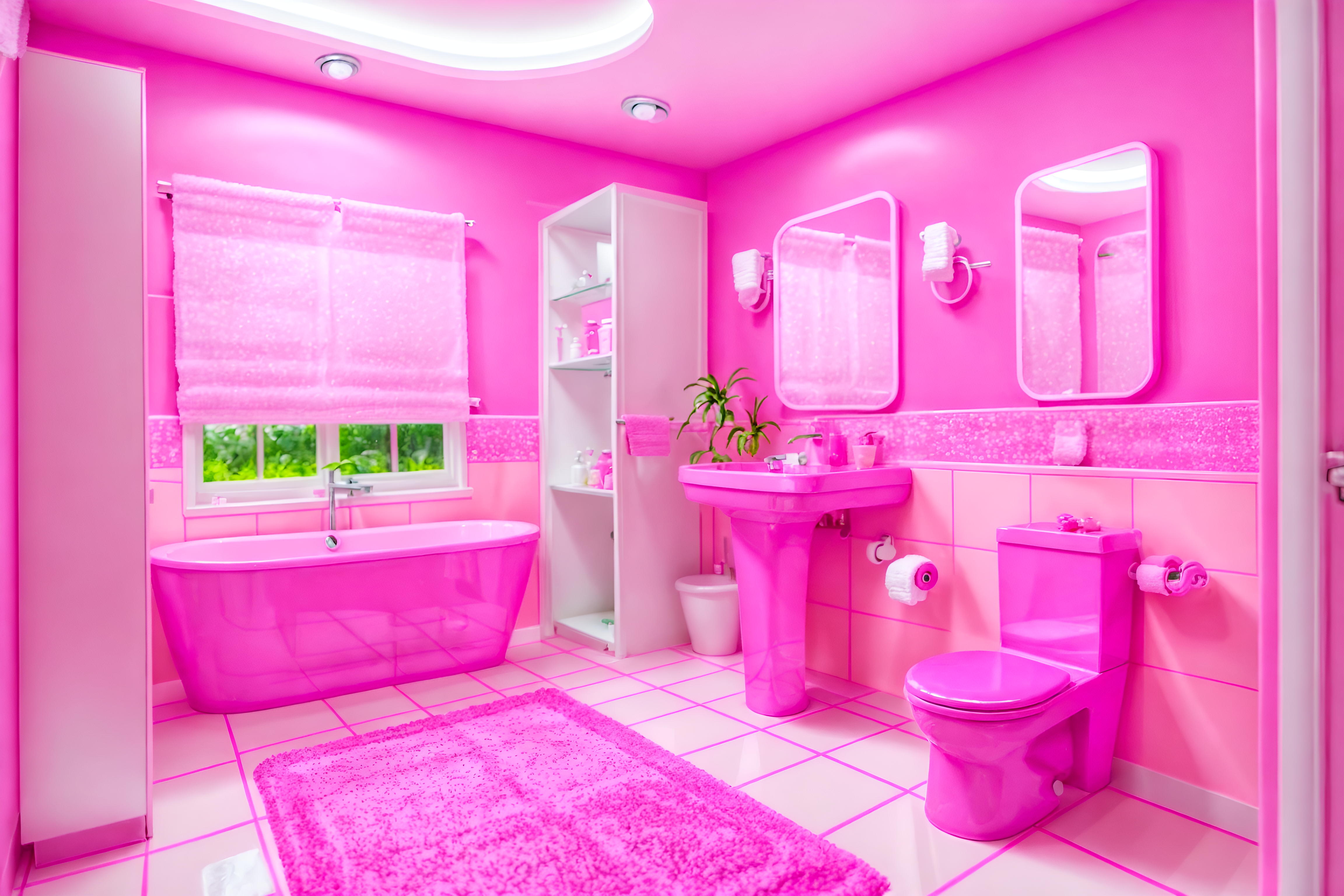 photo from pinterest of hot pink-style interior designed (bathroom interior) with toilet seat and bathroom cabinet and waste basket and shower and bath towel and bathtub and mirror and plant. . with barbie sofa and barbie chairs and barbie closet and hot pink barbie colors and barbie plastic interior and barbie style interior and barbie bold rosy hues like fuchsia and magenta and barbie glitter and sparkle. . cinematic photo, highly detailed, cinematic lighting, ultra-detailed, ultrarealistic, photorealism, 8k. trending on pinterest. hot pink interior design style. masterpiece, cinematic light, ultrarealistic+, photorealistic+, 8k, raw photo, realistic, sharp focus on eyes, (symmetrical eyes), (intact eyes), hyperrealistic, highest quality, best quality, , highly detailed, masterpiece, best quality, extremely detailed 8k wallpaper, masterpiece, best quality, ultra-detailed, best shadow, detailed background, detailed face, detailed eyes, high contrast, best illumination, detailed face, dulux, caustic, dynamic angle, detailed glow. dramatic lighting. highly detailed, insanely detailed hair, symmetrical, intricate details, professionally retouched, 8k high definition. strong bokeh. award winning photo.