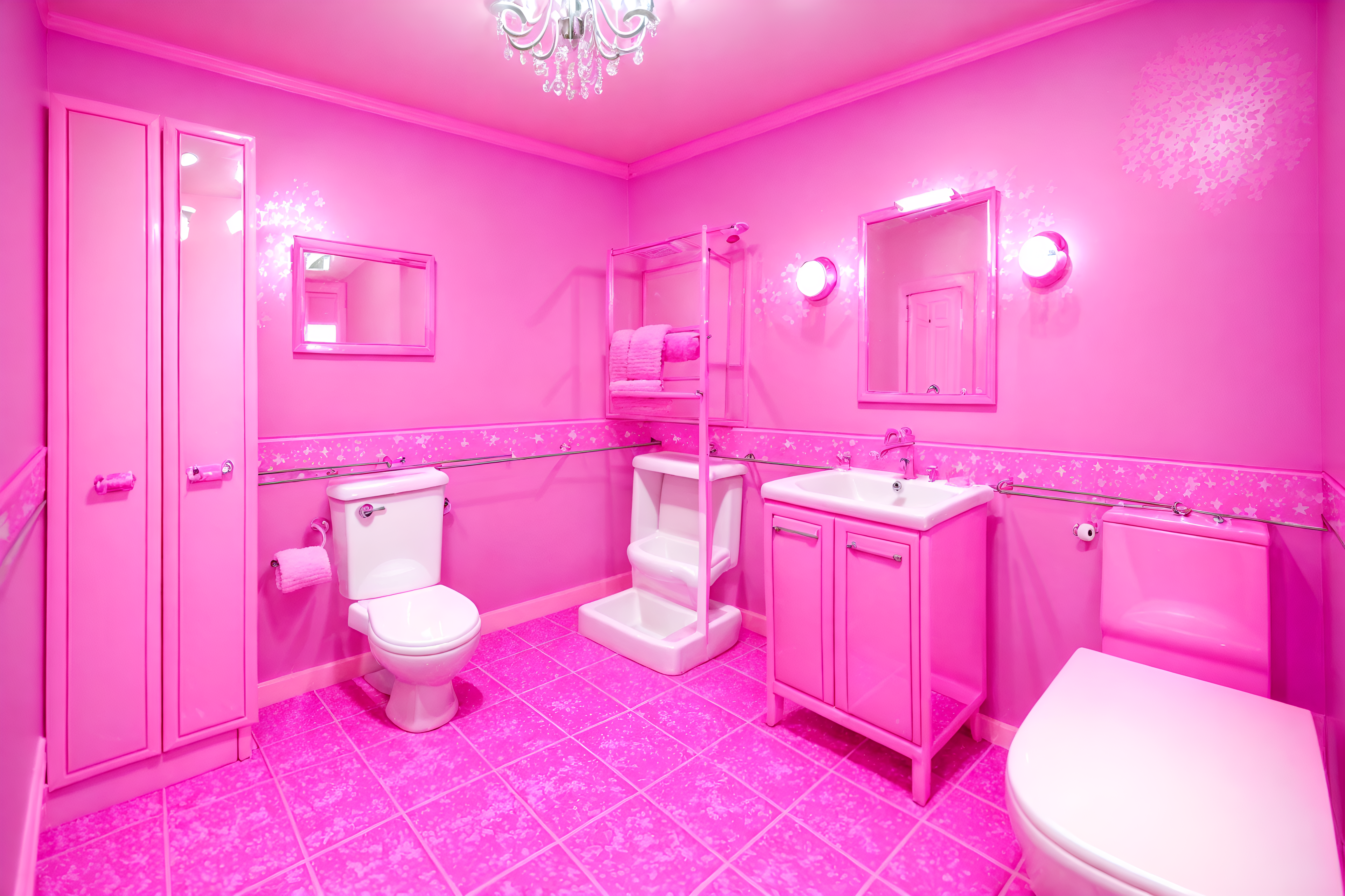 photo from pinterest of hot pink-style interior designed (bathroom interior) with toilet seat and bathroom cabinet and waste basket and shower and bath towel and bathtub and mirror and plant. . with barbie sofa and barbie chairs and barbie closet and hot pink barbie colors and barbie plastic interior and barbie style interior and barbie bold rosy hues like fuchsia and magenta and barbie glitter and sparkle. . cinematic photo, highly detailed, cinematic lighting, ultra-detailed, ultrarealistic, photorealism, 8k. trending on pinterest. hot pink interior design style. masterpiece, cinematic light, ultrarealistic+, photorealistic+, 8k, raw photo, realistic, sharp focus on eyes, (symmetrical eyes), (intact eyes), hyperrealistic, highest quality, best quality, , highly detailed, masterpiece, best quality, extremely detailed 8k wallpaper, masterpiece, best quality, ultra-detailed, best shadow, detailed background, detailed face, detailed eyes, high contrast, best illumination, detailed face, dulux, caustic, dynamic angle, detailed glow. dramatic lighting. highly detailed, insanely detailed hair, symmetrical, intricate details, professionally retouched, 8k high definition. strong bokeh. award winning photo.