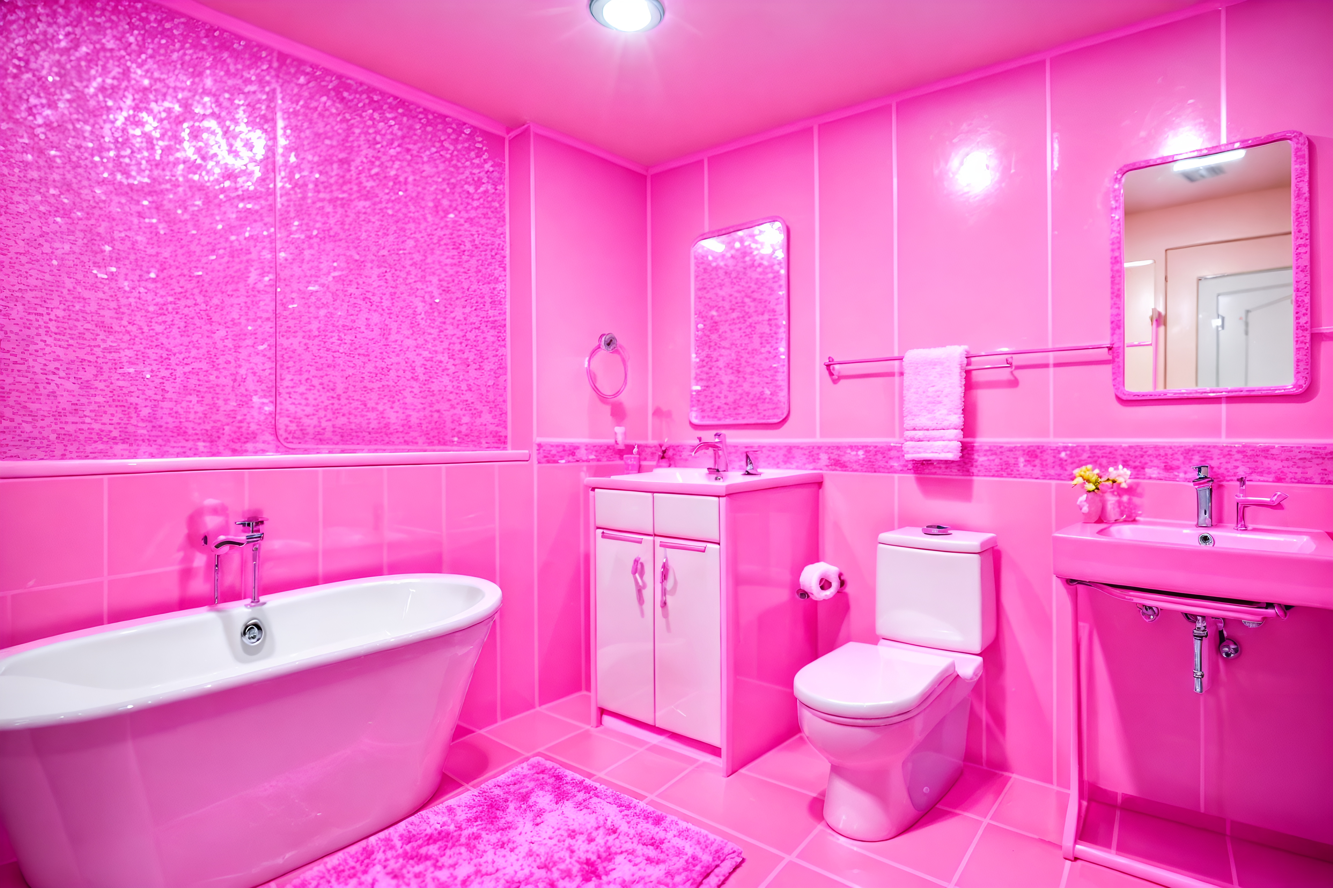photo from pinterest of hot pink-style interior designed (bathroom interior) with toilet seat and bathroom cabinet and waste basket and shower and bath towel and bathtub and mirror and plant. . with barbie sofa and barbie chairs and barbie closet and hot pink barbie colors and barbie plastic interior and barbie style interior and barbie bold rosy hues like fuchsia and magenta and barbie glitter and sparkle. . cinematic photo, highly detailed, cinematic lighting, ultra-detailed, ultrarealistic, photorealism, 8k. trending on pinterest. hot pink interior design style. masterpiece, cinematic light, ultrarealistic+, photorealistic+, 8k, raw photo, realistic, sharp focus on eyes, (symmetrical eyes), (intact eyes), hyperrealistic, highest quality, best quality, , highly detailed, masterpiece, best quality, extremely detailed 8k wallpaper, masterpiece, best quality, ultra-detailed, best shadow, detailed background, detailed face, detailed eyes, high contrast, best illumination, detailed face, dulux, caustic, dynamic angle, detailed glow. dramatic lighting. highly detailed, insanely detailed hair, symmetrical, intricate details, professionally retouched, 8k high definition. strong bokeh. award winning photo.