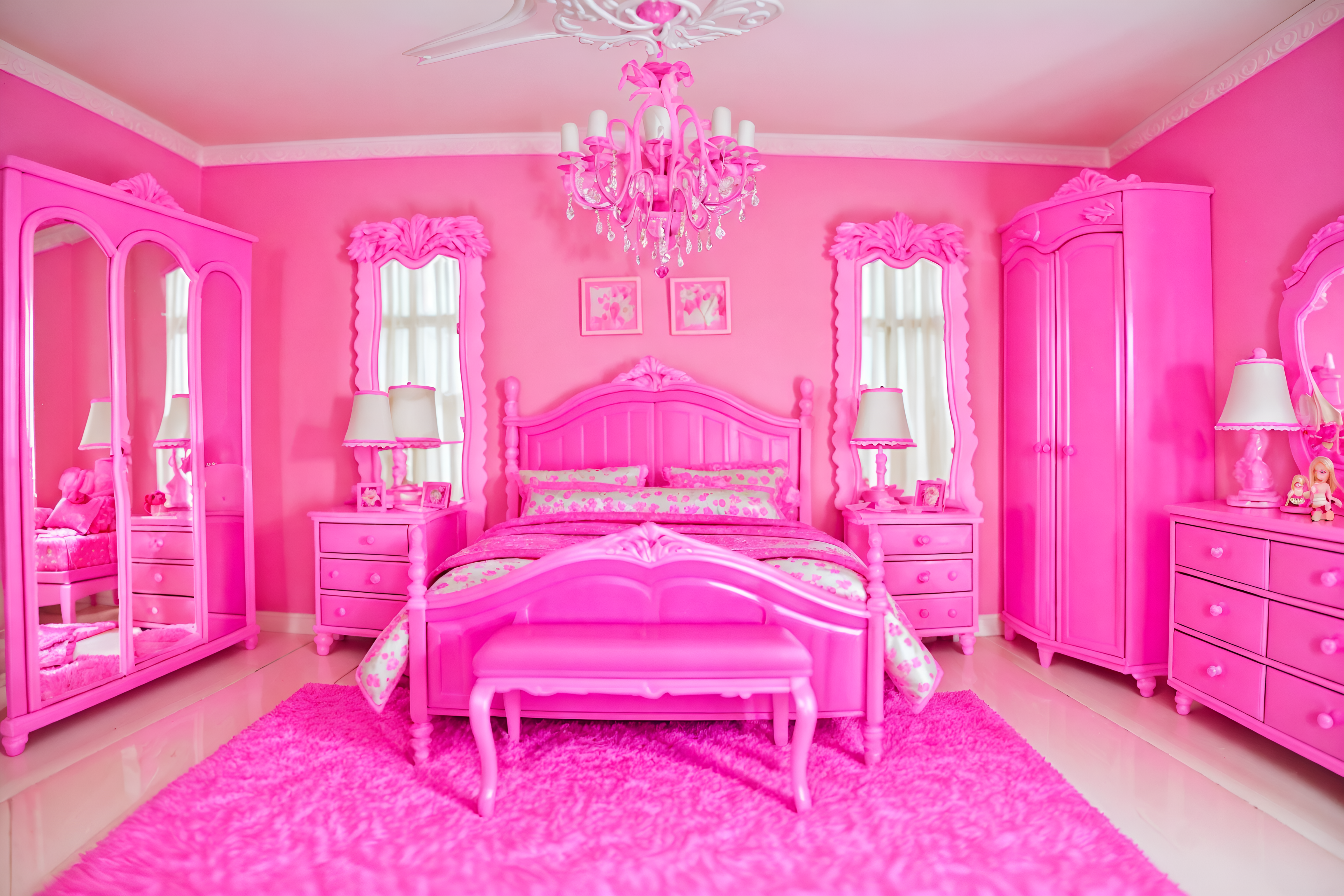 photo from pinterest of hot pink-style interior designed (bedroom interior) with plant and bed and dresser closet and bedside table or night stand and mirror and night light and accent chair and headboard. . with barbie plastic interior and barbie bold rosy hues like fuchsia and magenta and barbie style interior and barbie chairs and barbie glitter and sparkle and barbie sofa and hot pink barbie walls and hot pink barbie colors. . cinematic photo, highly detailed, cinematic lighting, ultra-detailed, ultrarealistic, photorealism, 8k. trending on pinterest. hot pink interior design style. masterpiece, cinematic light, ultrarealistic+, photorealistic+, 8k, raw photo, realistic, sharp focus on eyes, (symmetrical eyes), (intact eyes), hyperrealistic, highest quality, best quality, , highly detailed, masterpiece, best quality, extremely detailed 8k wallpaper, masterpiece, best quality, ultra-detailed, best shadow, detailed background, detailed face, detailed eyes, high contrast, best illumination, detailed face, dulux, caustic, dynamic angle, detailed glow. dramatic lighting. highly detailed, insanely detailed hair, symmetrical, intricate details, professionally retouched, 8k high definition. strong bokeh. award winning photo.