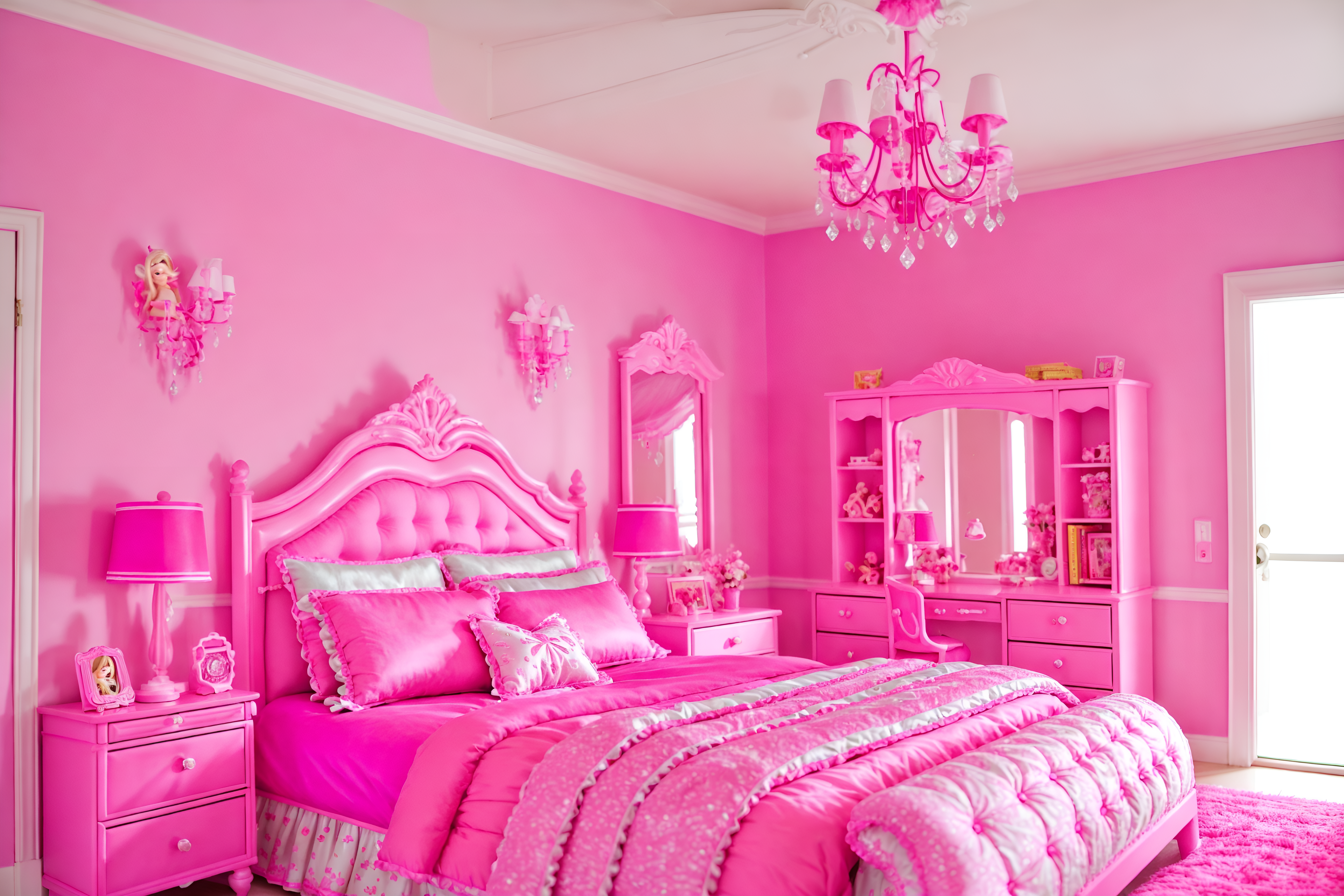photo from pinterest of hot pink-style interior designed (bedroom interior) with plant and bed and dresser closet and bedside table or night stand and mirror and night light and accent chair and headboard. . with barbie plastic interior and barbie bold rosy hues like fuchsia and magenta and barbie style interior and barbie chairs and barbie glitter and sparkle and barbie sofa and hot pink barbie walls and hot pink barbie colors. . cinematic photo, highly detailed, cinematic lighting, ultra-detailed, ultrarealistic, photorealism, 8k. trending on pinterest. hot pink interior design style. masterpiece, cinematic light, ultrarealistic+, photorealistic+, 8k, raw photo, realistic, sharp focus on eyes, (symmetrical eyes), (intact eyes), hyperrealistic, highest quality, best quality, , highly detailed, masterpiece, best quality, extremely detailed 8k wallpaper, masterpiece, best quality, ultra-detailed, best shadow, detailed background, detailed face, detailed eyes, high contrast, best illumination, detailed face, dulux, caustic, dynamic angle, detailed glow. dramatic lighting. highly detailed, insanely detailed hair, symmetrical, intricate details, professionally retouched, 8k high definition. strong bokeh. award winning photo.
