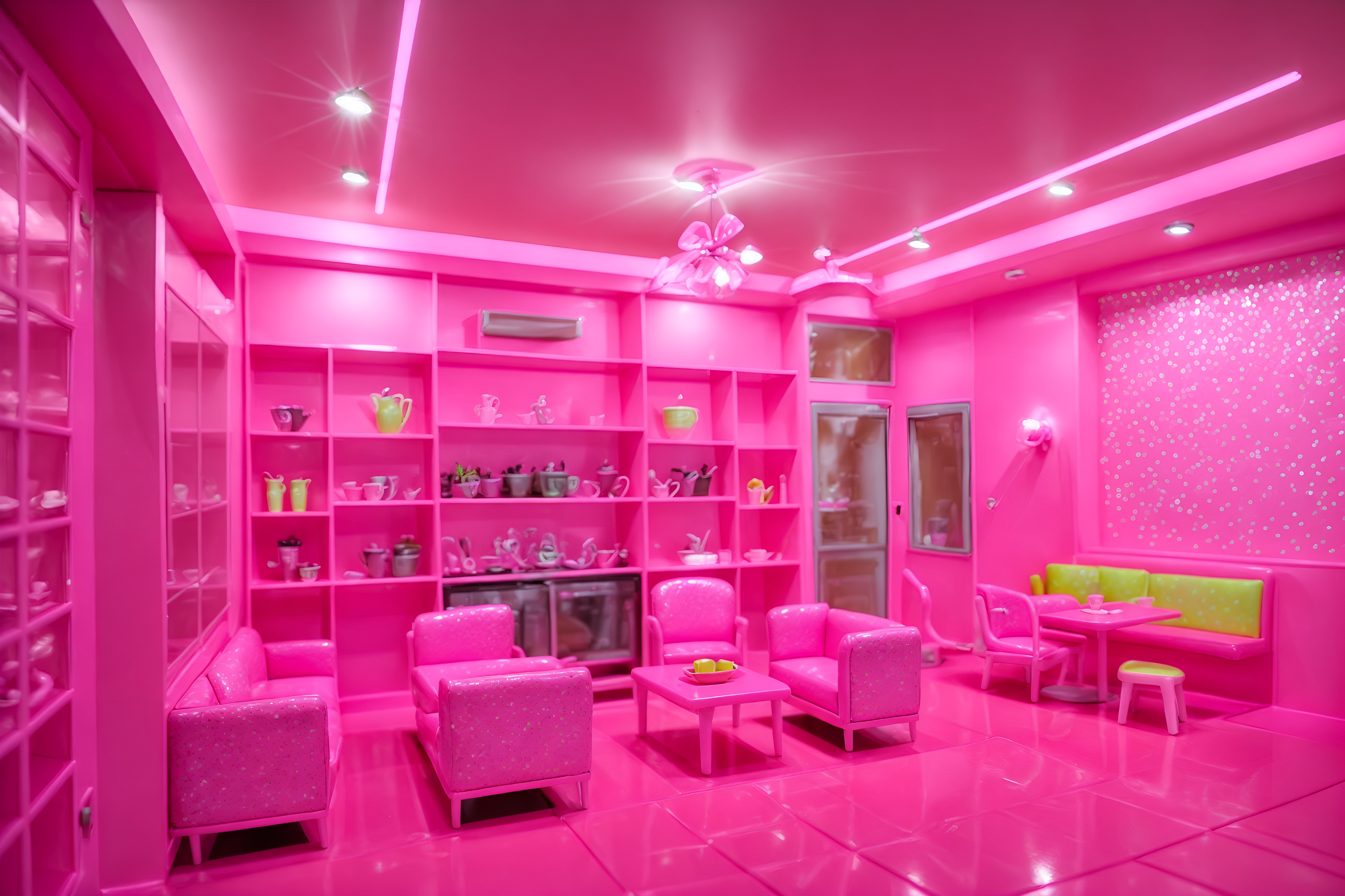 photo from pinterest of hot pink-style interior designed (coffee shop interior) . with barbie sofa and barbie closet and barbie bold rosy hues like fuchsia and magenta and barbie plastic interior and hot pink barbie colors and barbie style interior and hot pink barbie walls and barbie glitter and sparkle. . cinematic photo, highly detailed, cinematic lighting, ultra-detailed, ultrarealistic, photorealism, 8k. trending on pinterest. hot pink interior design style. masterpiece, cinematic light, ultrarealistic+, photorealistic+, 8k, raw photo, realistic, sharp focus on eyes, (symmetrical eyes), (intact eyes), hyperrealistic, highest quality, best quality, , highly detailed, masterpiece, best quality, extremely detailed 8k wallpaper, masterpiece, best quality, ultra-detailed, best shadow, detailed background, detailed face, detailed eyes, high contrast, best illumination, detailed face, dulux, caustic, dynamic angle, detailed glow. dramatic lighting. highly detailed, insanely detailed hair, symmetrical, intricate details, professionally retouched, 8k high definition. strong bokeh. award winning photo.