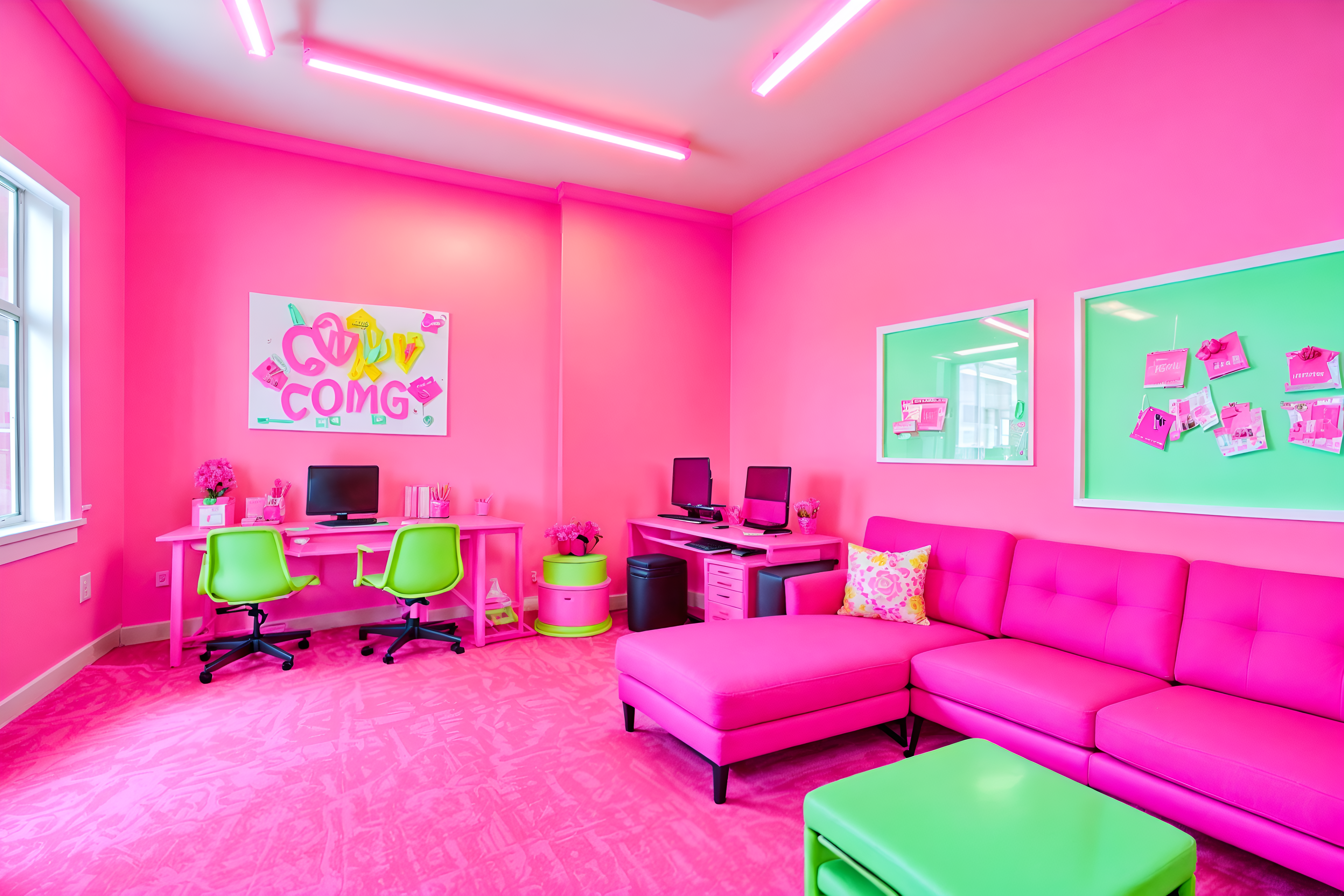 hot pink coworking spacesinterior decorate this coworking space with hot pink style. . . with seating area with sofa and office chairs and office desks and lounge chairs and seating area with sofa. . with barbie closet and hot pink barbie walls and barbie sofa and barbie style interior and barbie plastic interior and barbie chairs and barbie bold rosy hues like fuchsia and magenta and hot pink barbie colors. . .