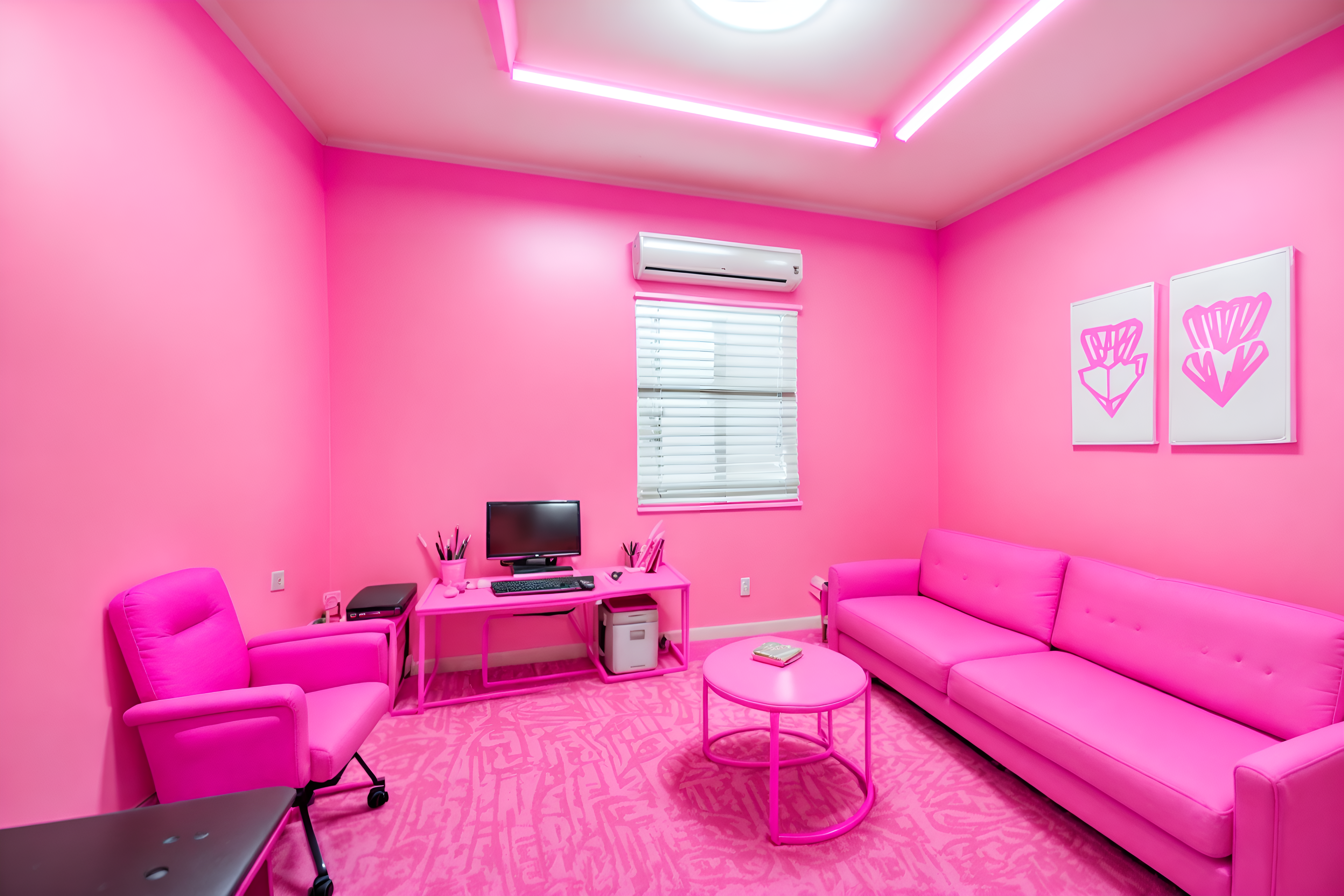 hot pink coworking spacesinterior decorate this coworking space with hot pink style. . . with seating area with sofa and office chairs and office desks and lounge chairs and seating area with sofa. . with barbie closet and hot pink barbie walls and barbie sofa and barbie style interior and barbie plastic interior and barbie chairs and barbie bold rosy hues like fuchsia and magenta and hot pink barbie colors. . .