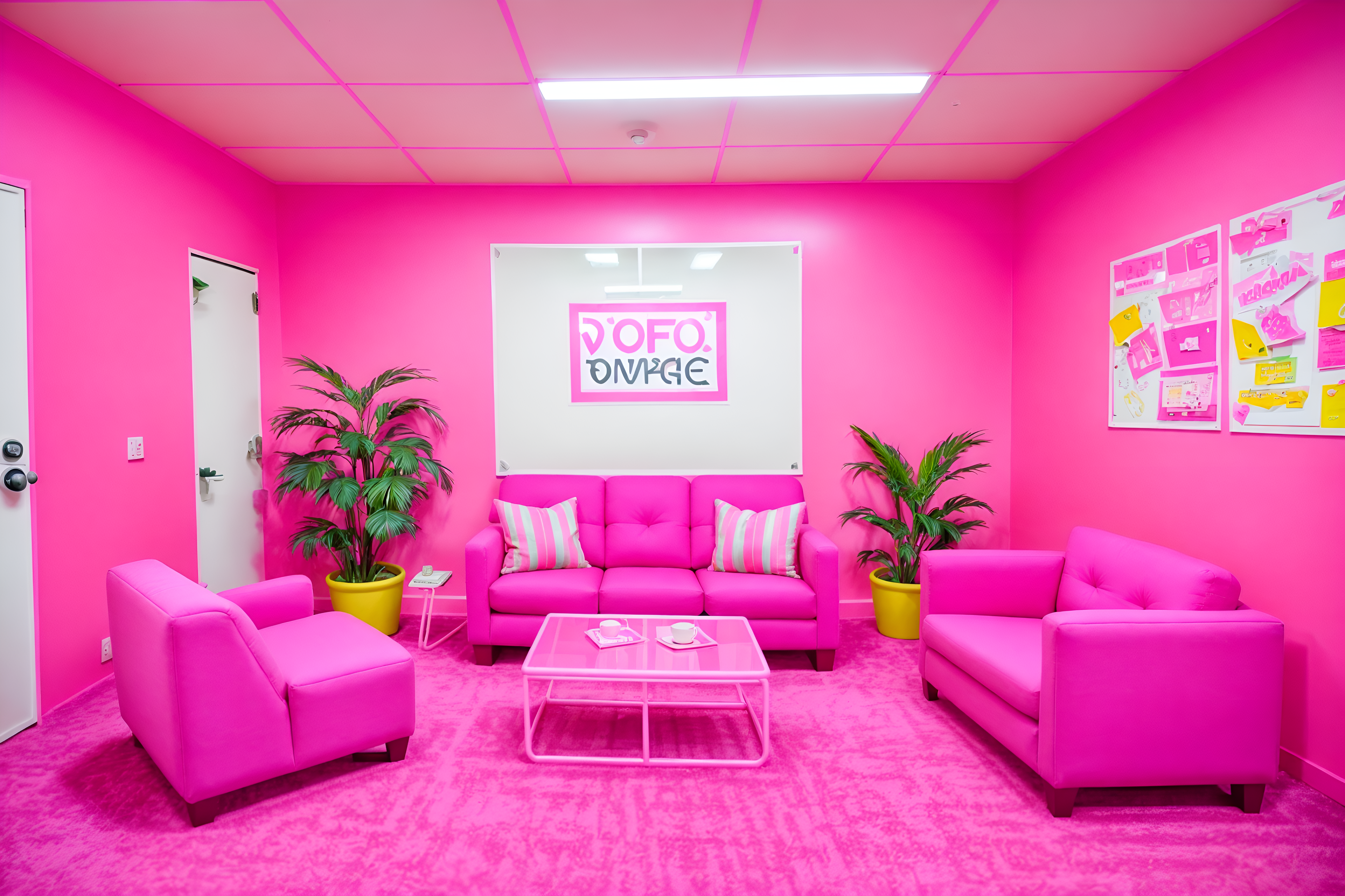 hot pink coworking spacesinterior decorate this coworking space with hot pink style. . . with seating area with sofa and office chairs and office desks and lounge chairs and seating area with sofa. . with barbie closet and hot pink barbie walls and barbie sofa and barbie style interior and barbie plastic interior and barbie chairs and barbie bold rosy hues like fuchsia and magenta and hot pink barbie colors. . .