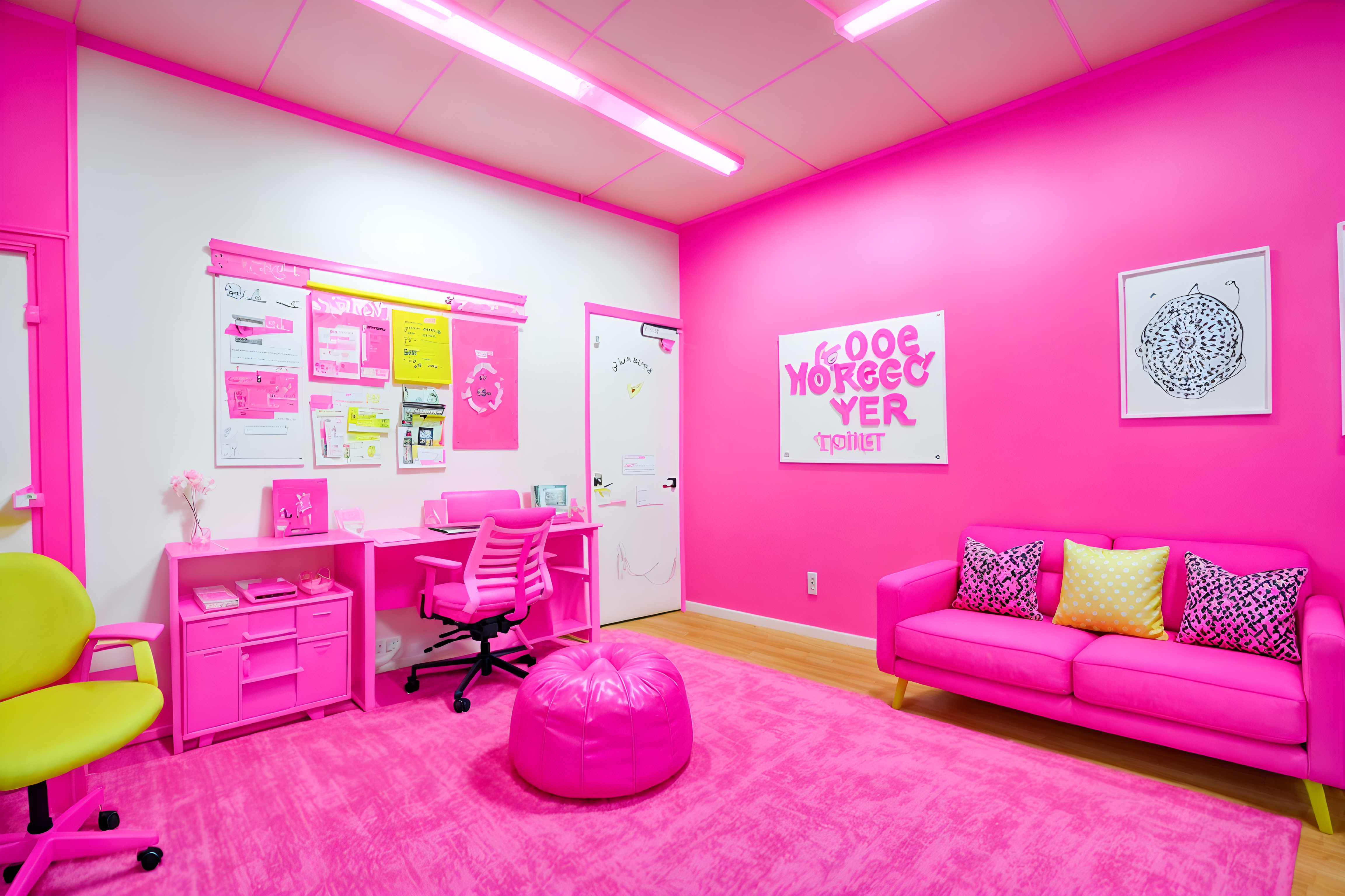 photo from pinterest of hot pink-style interior designed (coworking space interior) with office chairs and lounge chairs and office desks and seating area with sofa and office chairs. . with barbie sofa and barbie plastic interior and barbie chairs and barbie bold rosy hues like fuchsia and magenta and barbie closet and hot pink barbie colors and barbie glitter and sparkle and hot pink barbie walls. . cinematic photo, highly detailed, cinematic lighting, ultra-detailed, ultrarealistic, photorealism, 8k. trending on pinterest. hot pink interior design style. masterpiece, cinematic light, ultrarealistic+, photorealistic+, 8k, raw photo, realistic, sharp focus on eyes, (symmetrical eyes), (intact eyes), hyperrealistic, highest quality, best quality, , highly detailed, masterpiece, best quality, extremely detailed 8k wallpaper, masterpiece, best quality, ultra-detailed, best shadow, detailed background, detailed face, detailed eyes, high contrast, best illumination, detailed face, dulux, caustic, dynamic angle, detailed glow. dramatic lighting. highly detailed, insanely detailed hair, symmetrical, intricate details, professionally retouched, 8k high definition. strong bokeh. award winning photo.