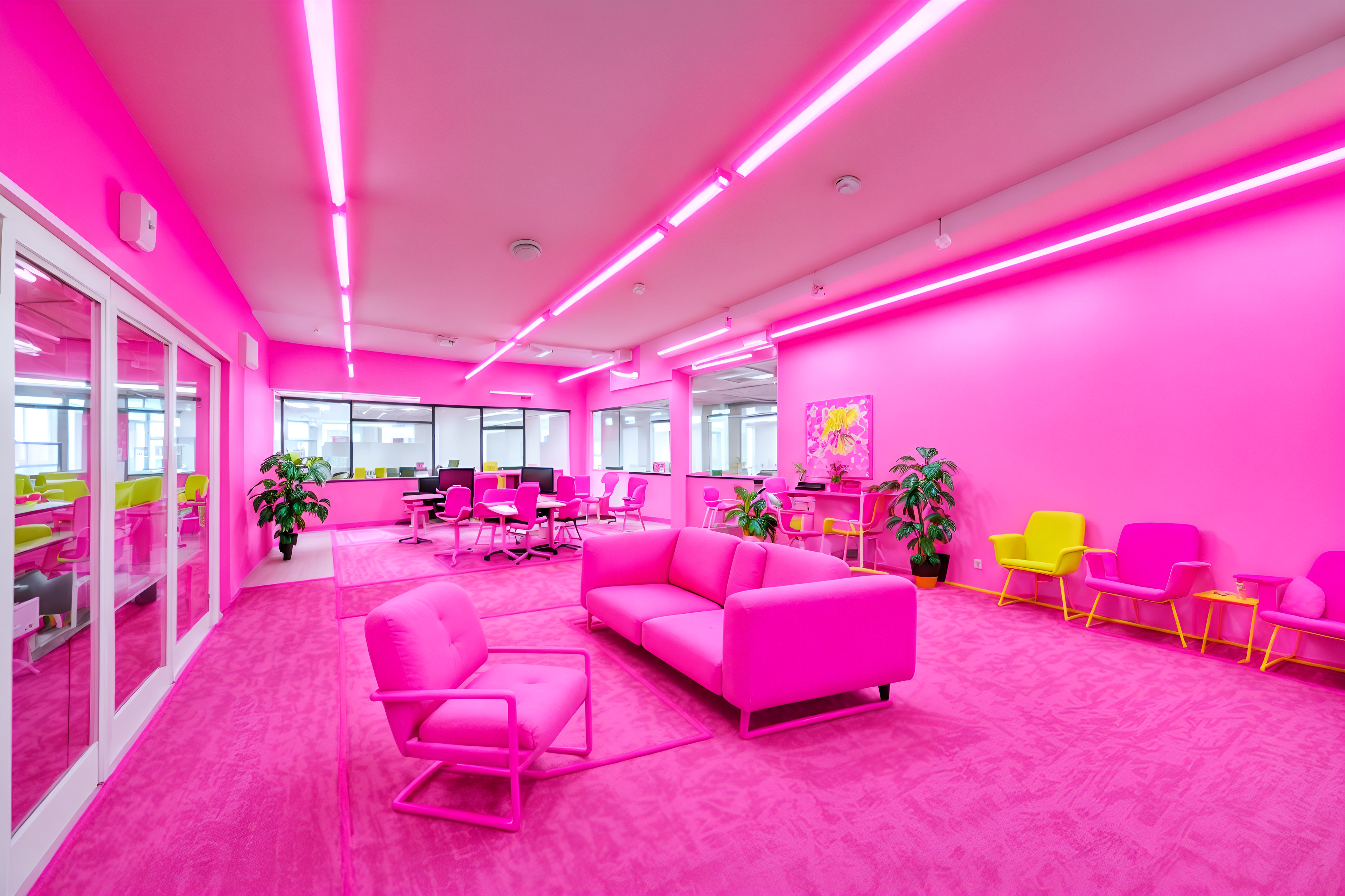 photo from pinterest of hot pink-style interior designed (coworking space interior) with office chairs and lounge chairs and office desks and seating area with sofa and office chairs. . with barbie sofa and barbie plastic interior and barbie chairs and barbie bold rosy hues like fuchsia and magenta and barbie closet and hot pink barbie colors and barbie glitter and sparkle and hot pink barbie walls. . cinematic photo, highly detailed, cinematic lighting, ultra-detailed, ultrarealistic, photorealism, 8k. trending on pinterest. hot pink interior design style. masterpiece, cinematic light, ultrarealistic+, photorealistic+, 8k, raw photo, realistic, sharp focus on eyes, (symmetrical eyes), (intact eyes), hyperrealistic, highest quality, best quality, , highly detailed, masterpiece, best quality, extremely detailed 8k wallpaper, masterpiece, best quality, ultra-detailed, best shadow, detailed background, detailed face, detailed eyes, high contrast, best illumination, detailed face, dulux, caustic, dynamic angle, detailed glow. dramatic lighting. highly detailed, insanely detailed hair, symmetrical, intricate details, professionally retouched, 8k high definition. strong bokeh. award winning photo.