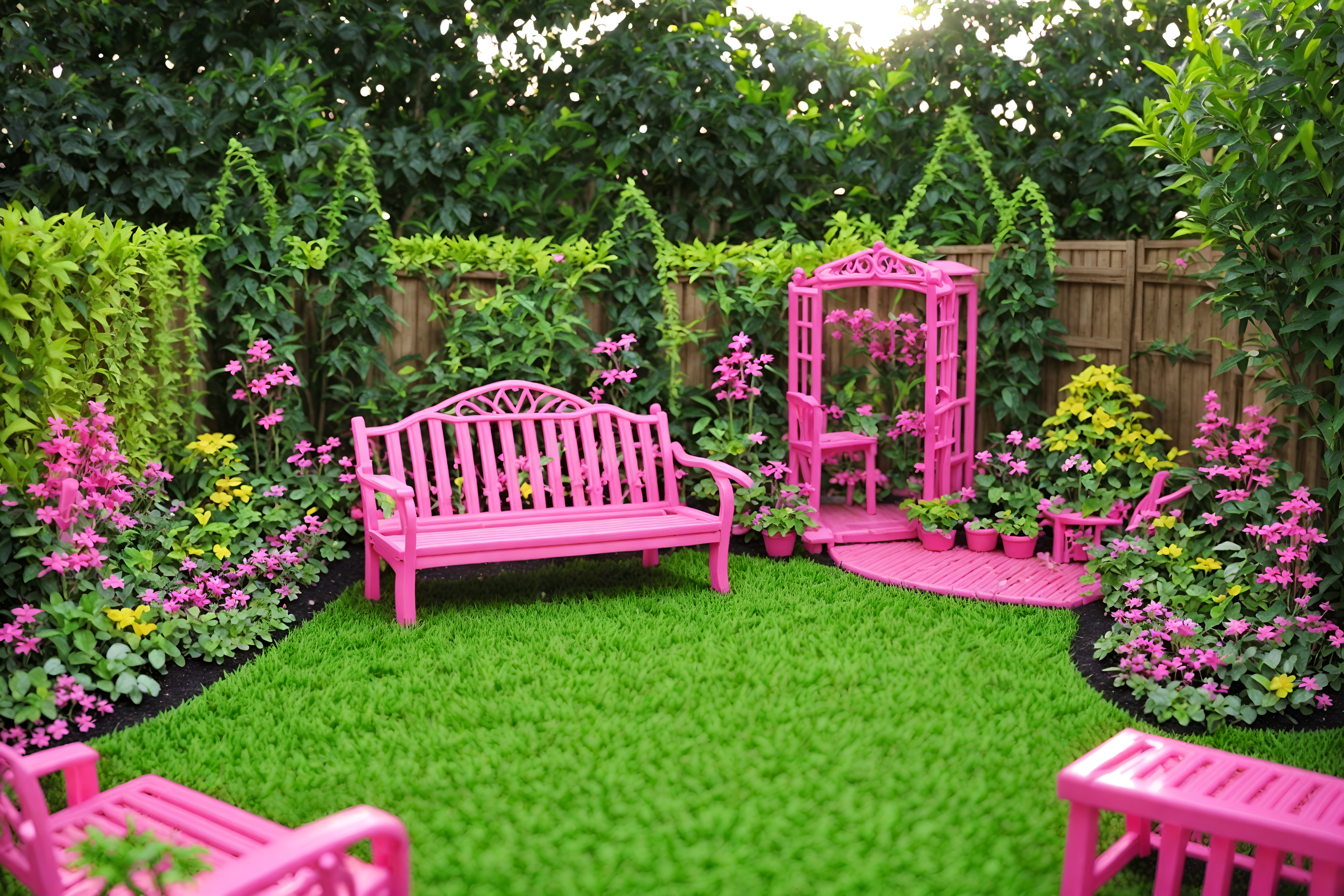hot pink outdoor gardensinterior decorate this outdoor garden with hot pink style. . . with grass and garden tree and garden plants and grass. . with hot pink barbie walls and barbie closet and barbie plastic and hot pink barbie colors and barbie style and barbie sofa and barbie bold rosy hues like fuchsia and magenta and barbie glitter and sparkle. . .