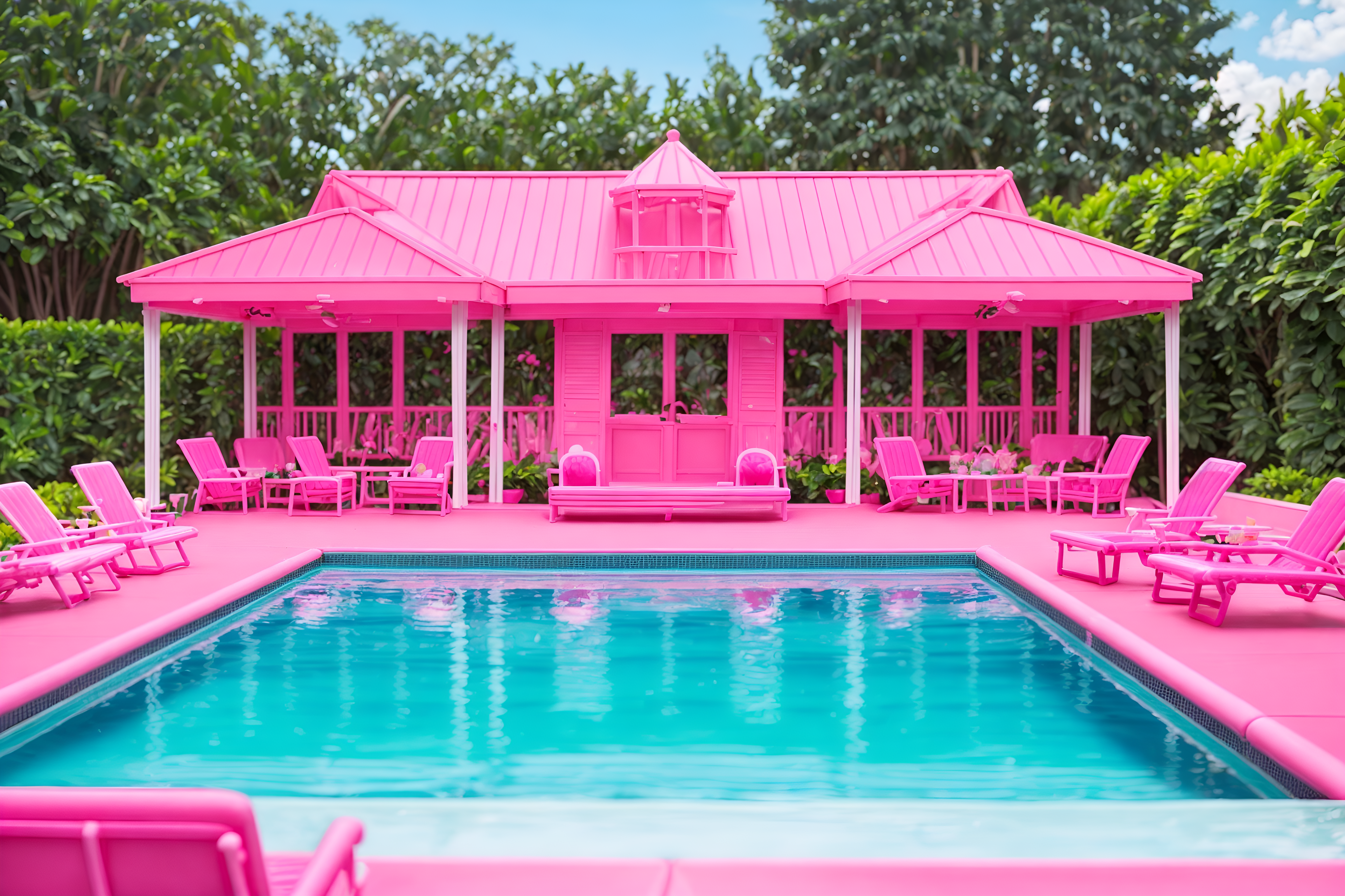 photo from pinterest of hot pink-style designed (outdoor pool area ) with pool lounge chairs and pool and pool lights and pool lounge chairs. . with barbie chairs and barbie style and barbie closet and hot pink barbie walls and barbie bold rosy hues like fuchsia and magenta and hot pink barbie colors and barbie plastic and barbie glitter and sparkle. . cinematic photo, highly detailed, cinematic lighting, ultra-detailed, ultrarealistic, photorealism, 8k. trending on pinterest. hot pink design style. masterpiece, cinematic light, ultrarealistic+, photorealistic+, 8k, raw photo, realistic, sharp focus on eyes, (symmetrical eyes), (intact eyes), hyperrealistic, highest quality, best quality, , highly detailed, masterpiece, best quality, extremely detailed 8k wallpaper, masterpiece, best quality, ultra-detailed, best shadow, detailed background, detailed face, detailed eyes, high contrast, best illumination, detailed face, dulux, caustic, dynamic angle, detailed glow. dramatic lighting. highly detailed, insanely detailed hair, symmetrical, intricate details, professionally retouched, 8k high definition. strong bokeh. award winning photo.