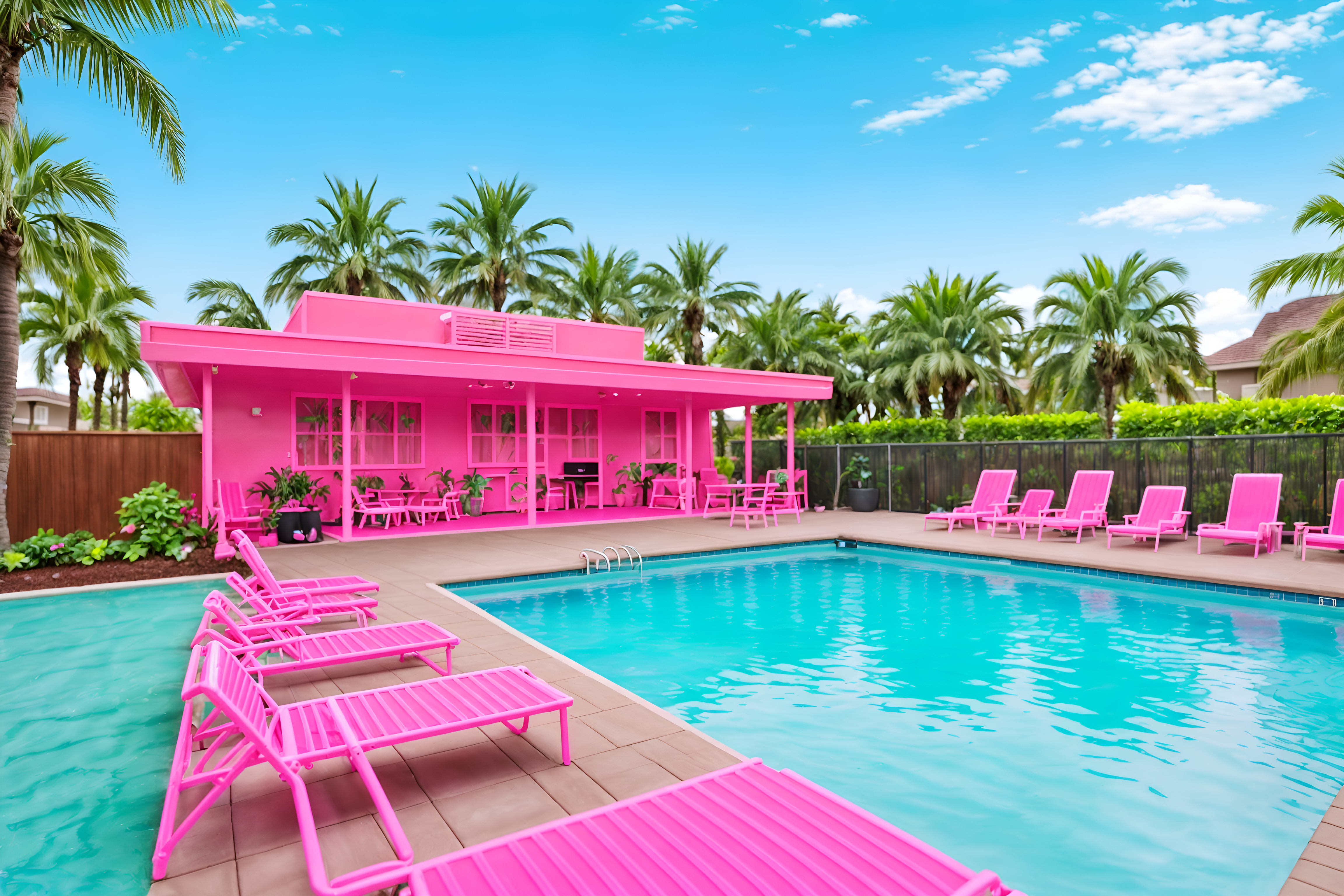 photo from pinterest of hot pink-style designed (outdoor pool area ) with pool lounge chairs and pool and pool lights and pool lounge chairs. . with barbie chairs and barbie style and barbie closet and hot pink barbie walls and barbie bold rosy hues like fuchsia and magenta and hot pink barbie colors and barbie plastic and barbie glitter and sparkle. . cinematic photo, highly detailed, cinematic lighting, ultra-detailed, ultrarealistic, photorealism, 8k. trending on pinterest. hot pink design style. masterpiece, cinematic light, ultrarealistic+, photorealistic+, 8k, raw photo, realistic, sharp focus on eyes, (symmetrical eyes), (intact eyes), hyperrealistic, highest quality, best quality, , highly detailed, masterpiece, best quality, extremely detailed 8k wallpaper, masterpiece, best quality, ultra-detailed, best shadow, detailed background, detailed face, detailed eyes, high contrast, best illumination, detailed face, dulux, caustic, dynamic angle, detailed glow. dramatic lighting. highly detailed, insanely detailed hair, symmetrical, intricate details, professionally retouched, 8k high definition. strong bokeh. award winning photo.