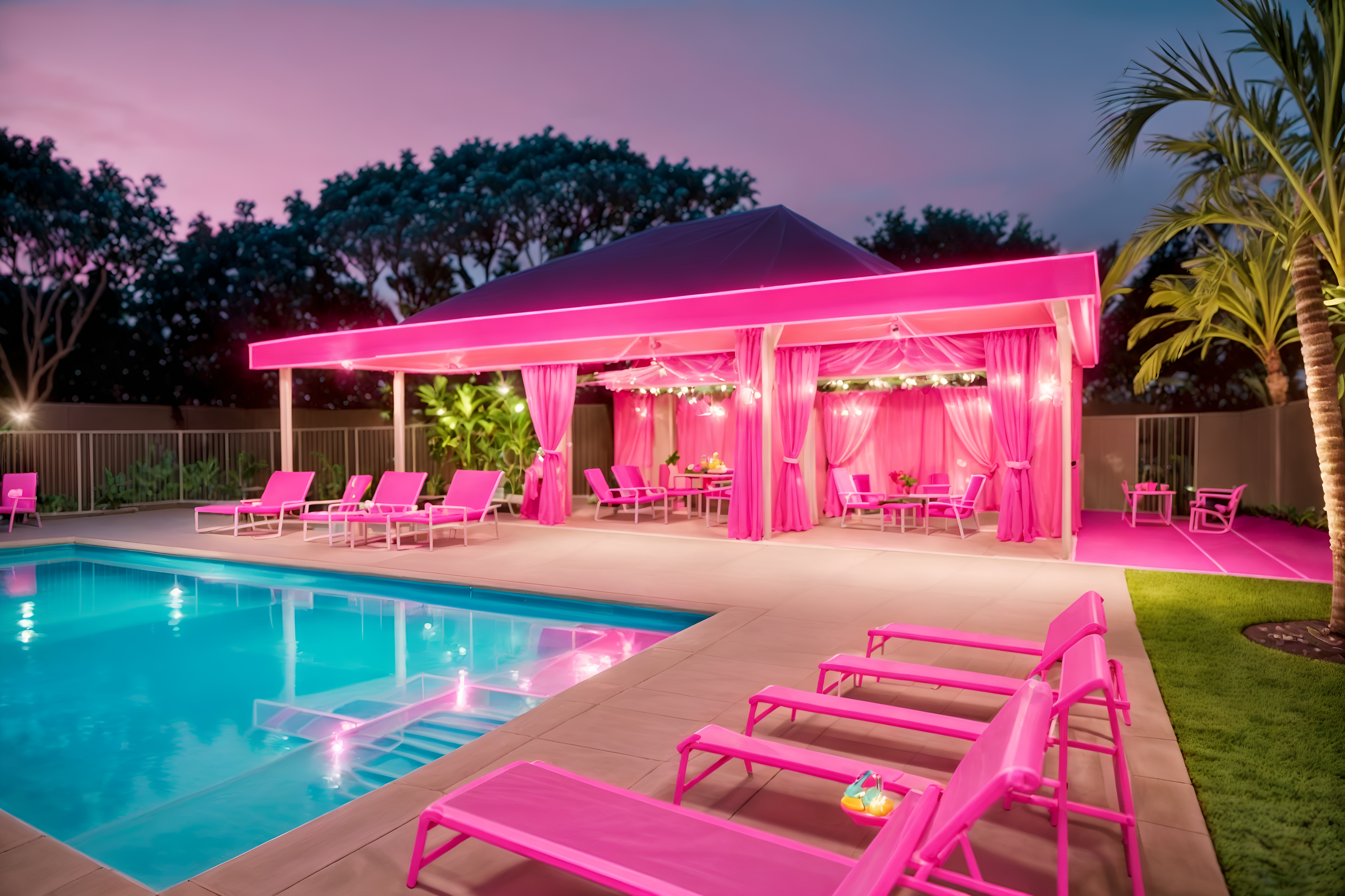 hot pink outdoor pool areasinterior decorate this outdoor pool area with hot pink style. . . with pool lounge chairs and pool lights and pool and pool lounge chairs. . with hot pink barbie colors and barbie closet and barbie glitter and sparkle and barbie plastic and barbie sofa and barbie style and hot pink barbie walls and barbie chairs. . .