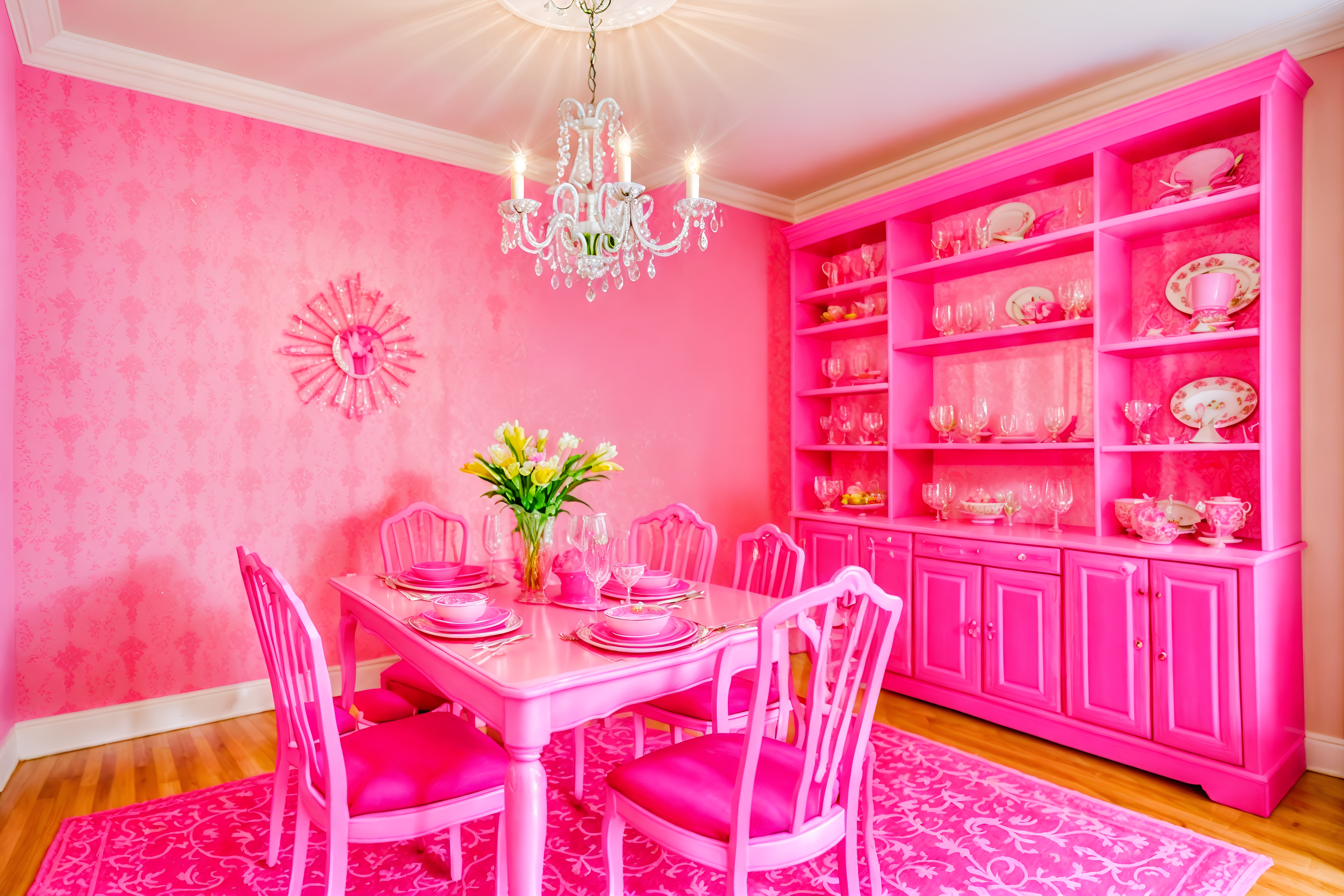 photo from pinterest of hot pink-style interior designed (dining room interior) with plates, cutlery and glasses on dining table and plant and bookshelves and dining table chairs and painting or photo on wall and vase and light or chandelier and dining table. . with hot pink barbie walls and hot pink barbie colors and barbie style interior and barbie glitter and sparkle and barbie sofa and barbie chairs and barbie bold rosy hues like fuchsia and magenta and barbie closet. . cinematic photo, highly detailed, cinematic lighting, ultra-detailed, ultrarealistic, photorealism, 8k. trending on pinterest. hot pink interior design style. masterpiece, cinematic light, ultrarealistic+, photorealistic+, 8k, raw photo, realistic, sharp focus on eyes, (symmetrical eyes), (intact eyes), hyperrealistic, highest quality, best quality, , highly detailed, masterpiece, best quality, extremely detailed 8k wallpaper, masterpiece, best quality, ultra-detailed, best shadow, detailed background, detailed face, detailed eyes, high contrast, best illumination, detailed face, dulux, caustic, dynamic angle, detailed glow. dramatic lighting. highly detailed, insanely detailed hair, symmetrical, intricate details, professionally retouched, 8k high definition. strong bokeh. award winning photo.