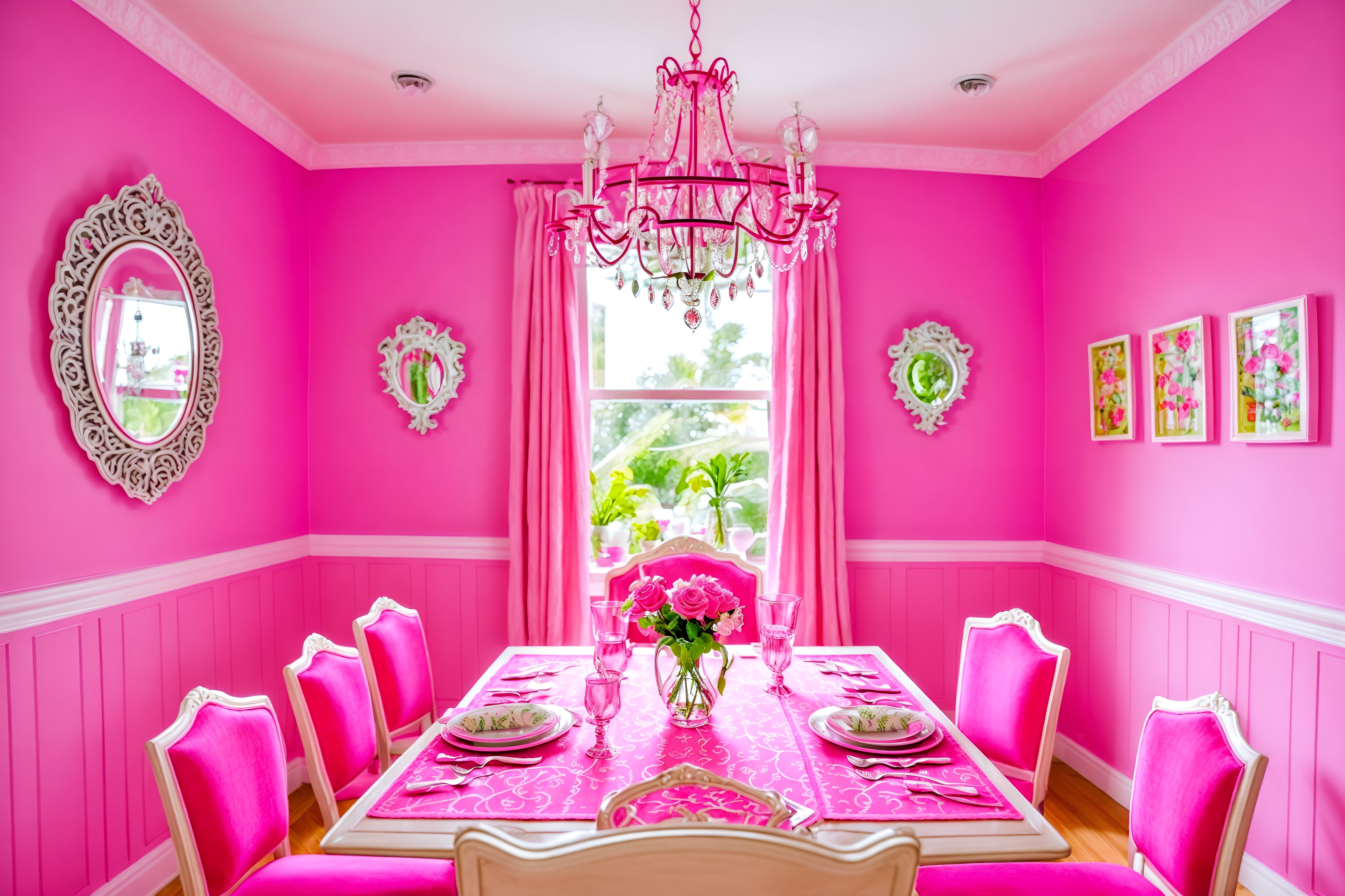 photo from pinterest of hot pink-style interior designed (dining room interior) with plates, cutlery and glasses on dining table and plant and bookshelves and dining table chairs and painting or photo on wall and vase and light or chandelier and dining table. . with hot pink barbie walls and hot pink barbie colors and barbie style interior and barbie glitter and sparkle and barbie sofa and barbie chairs and barbie bold rosy hues like fuchsia and magenta and barbie closet. . cinematic photo, highly detailed, cinematic lighting, ultra-detailed, ultrarealistic, photorealism, 8k. trending on pinterest. hot pink interior design style. masterpiece, cinematic light, ultrarealistic+, photorealistic+, 8k, raw photo, realistic, sharp focus on eyes, (symmetrical eyes), (intact eyes), hyperrealistic, highest quality, best quality, , highly detailed, masterpiece, best quality, extremely detailed 8k wallpaper, masterpiece, best quality, ultra-detailed, best shadow, detailed background, detailed face, detailed eyes, high contrast, best illumination, detailed face, dulux, caustic, dynamic angle, detailed glow. dramatic lighting. highly detailed, insanely detailed hair, symmetrical, intricate details, professionally retouched, 8k high definition. strong bokeh. award winning photo.