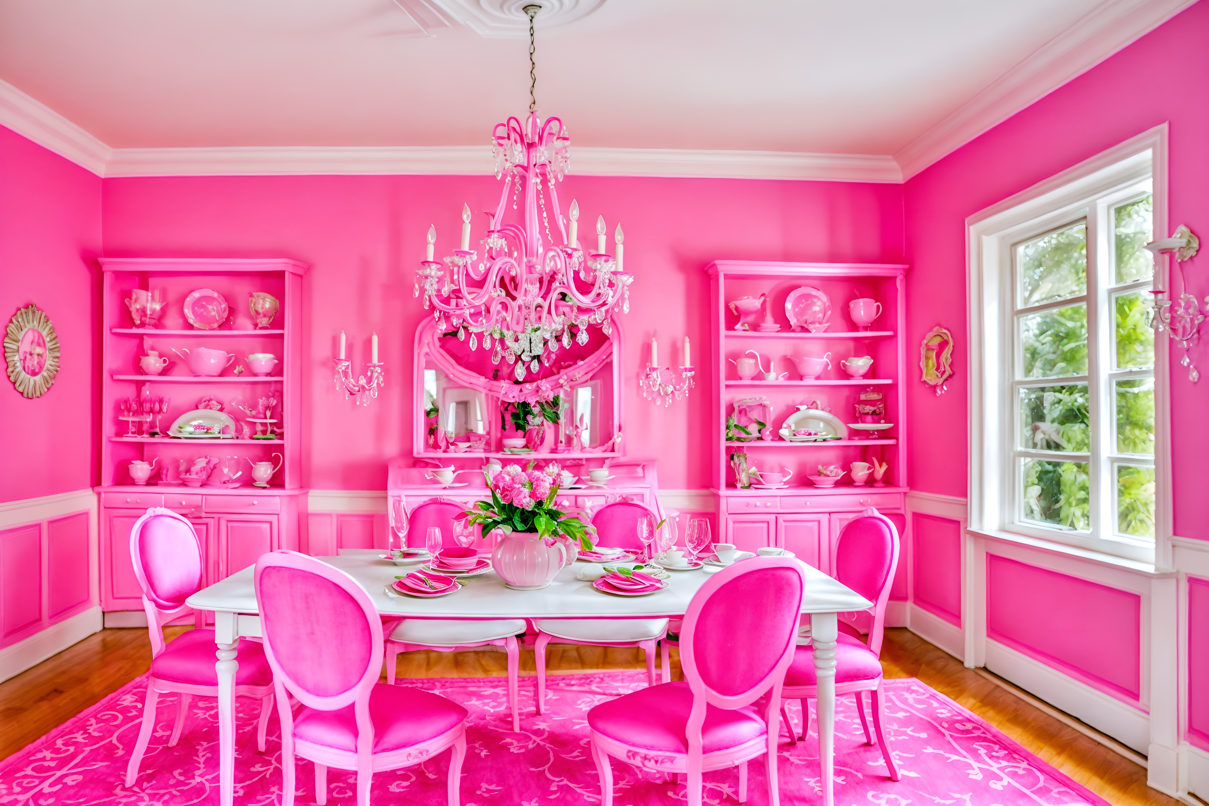 photo from pinterest of hot pink-style interior designed (dining room interior) with plates, cutlery and glasses on dining table and plant and bookshelves and dining table chairs and painting or photo on wall and vase and light or chandelier and dining table. . with hot pink barbie walls and hot pink barbie colors and barbie style interior and barbie glitter and sparkle and barbie sofa and barbie chairs and barbie bold rosy hues like fuchsia and magenta and barbie closet. . cinematic photo, highly detailed, cinematic lighting, ultra-detailed, ultrarealistic, photorealism, 8k. trending on pinterest. hot pink interior design style. masterpiece, cinematic light, ultrarealistic+, photorealistic+, 8k, raw photo, realistic, sharp focus on eyes, (symmetrical eyes), (intact eyes), hyperrealistic, highest quality, best quality, , highly detailed, masterpiece, best quality, extremely detailed 8k wallpaper, masterpiece, best quality, ultra-detailed, best shadow, detailed background, detailed face, detailed eyes, high contrast, best illumination, detailed face, dulux, caustic, dynamic angle, detailed glow. dramatic lighting. highly detailed, insanely detailed hair, symmetrical, intricate details, professionally retouched, 8k high definition. strong bokeh. award winning photo.