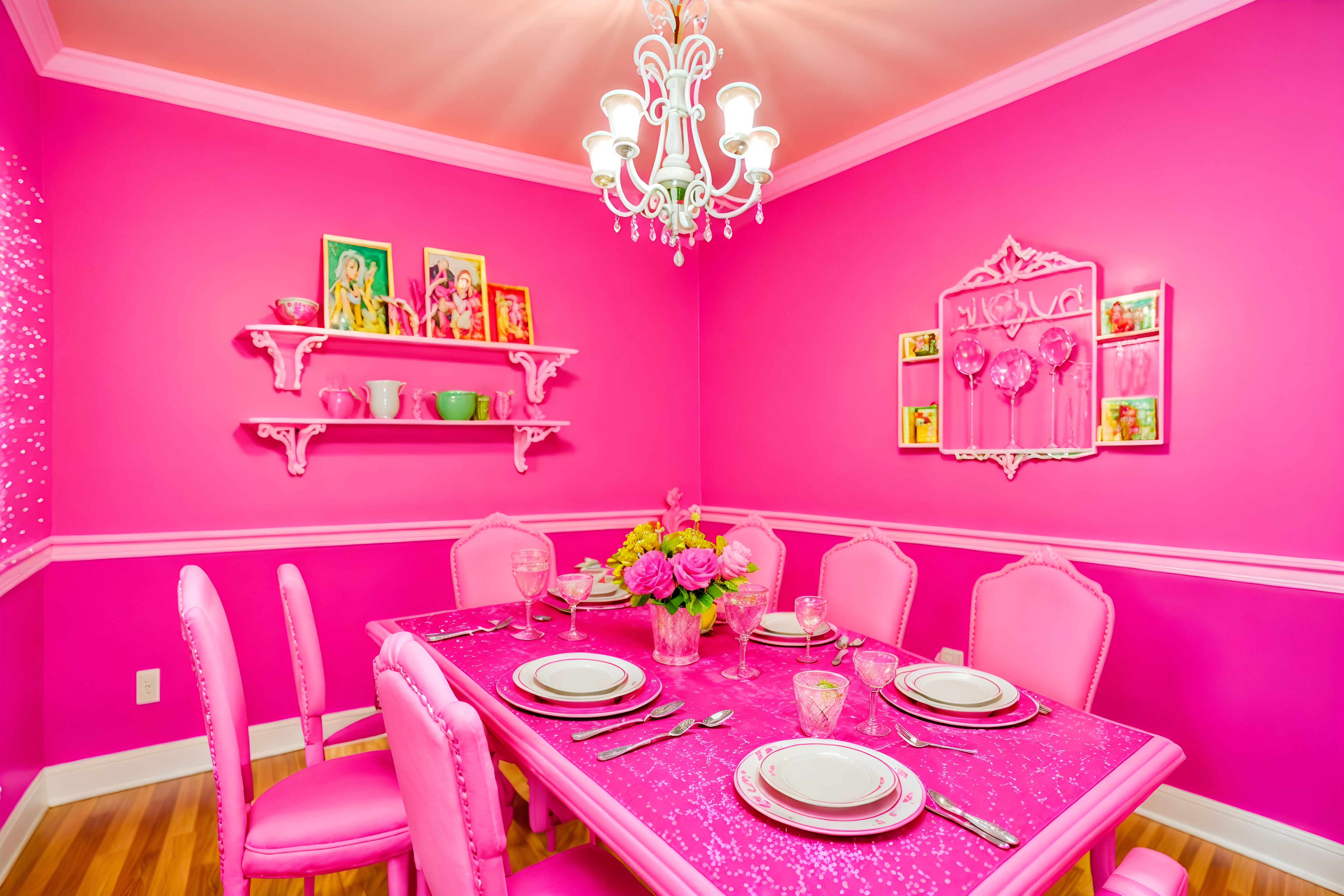 photo from pinterest of hot pink-style interior designed (dining room interior) with plates, cutlery and glasses on dining table and plant and bookshelves and dining table chairs and painting or photo on wall and vase and light or chandelier and dining table. . with hot pink barbie walls and hot pink barbie colors and barbie style interior and barbie glitter and sparkle and barbie sofa and barbie chairs and barbie bold rosy hues like fuchsia and magenta and barbie closet. . cinematic photo, highly detailed, cinematic lighting, ultra-detailed, ultrarealistic, photorealism, 8k. trending on pinterest. hot pink interior design style. masterpiece, cinematic light, ultrarealistic+, photorealistic+, 8k, raw photo, realistic, sharp focus on eyes, (symmetrical eyes), (intact eyes), hyperrealistic, highest quality, best quality, , highly detailed, masterpiece, best quality, extremely detailed 8k wallpaper, masterpiece, best quality, ultra-detailed, best shadow, detailed background, detailed face, detailed eyes, high contrast, best illumination, detailed face, dulux, caustic, dynamic angle, detailed glow. dramatic lighting. highly detailed, insanely detailed hair, symmetrical, intricate details, professionally retouched, 8k high definition. strong bokeh. award winning photo.