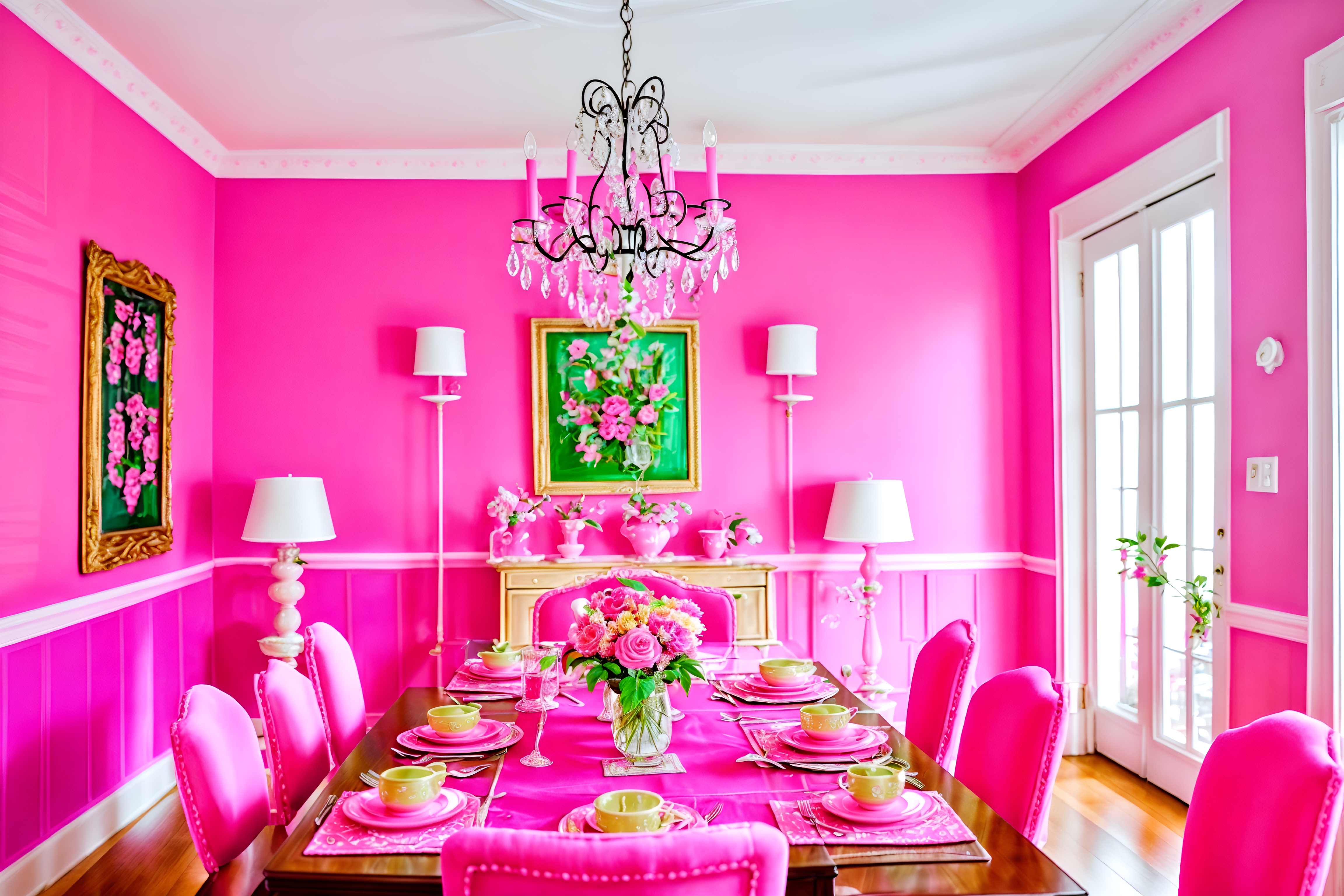 photo from pinterest of hot pink-style interior designed (dining room interior) with plates, cutlery and glasses on dining table and plant and bookshelves and dining table chairs and painting or photo on wall and vase and light or chandelier and dining table. . with hot pink barbie walls and hot pink barbie colors and barbie style interior and barbie glitter and sparkle and barbie sofa and barbie chairs and barbie bold rosy hues like fuchsia and magenta and barbie closet. . cinematic photo, highly detailed, cinematic lighting, ultra-detailed, ultrarealistic, photorealism, 8k. trending on pinterest. hot pink interior design style. masterpiece, cinematic light, ultrarealistic+, photorealistic+, 8k, raw photo, realistic, sharp focus on eyes, (symmetrical eyes), (intact eyes), hyperrealistic, highest quality, best quality, , highly detailed, masterpiece, best quality, extremely detailed 8k wallpaper, masterpiece, best quality, ultra-detailed, best shadow, detailed background, detailed face, detailed eyes, high contrast, best illumination, detailed face, dulux, caustic, dynamic angle, detailed glow. dramatic lighting. highly detailed, insanely detailed hair, symmetrical, intricate details, professionally retouched, 8k high definition. strong bokeh. award winning photo.
