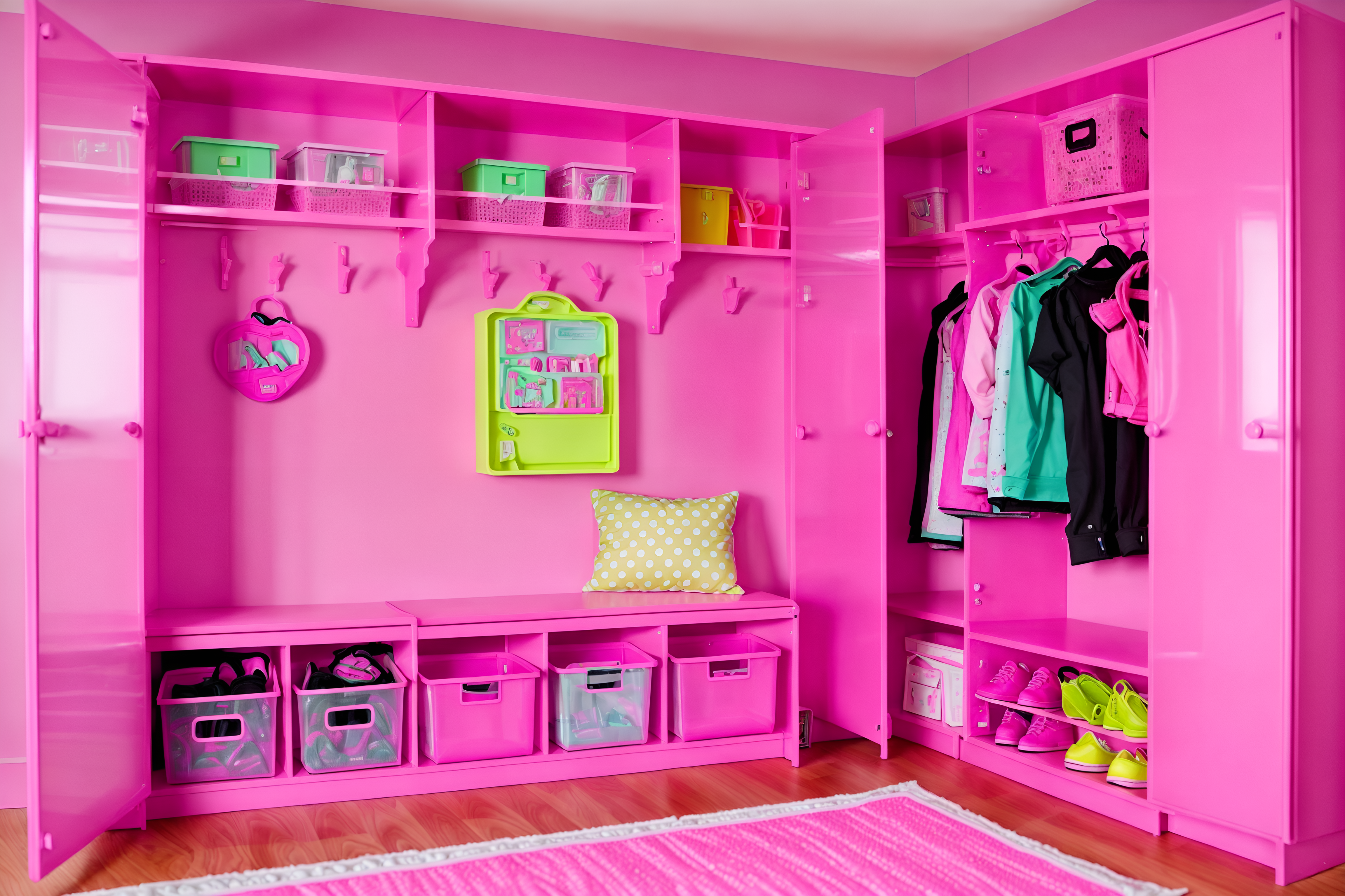 photo from pinterest of hot pink-style interior designed (drop zone interior) with shelves for shoes and lockers and a bench and high up storage and storage drawers and storage baskets and wall hooks for coats and cabinets. . with barbie plastic interior and hot pink barbie colors and hot pink barbie walls and barbie closet and barbie sofa and barbie bold rosy hues like fuchsia and magenta and barbie glitter and sparkle and barbie chairs. . cinematic photo, highly detailed, cinematic lighting, ultra-detailed, ultrarealistic, photorealism, 8k. trending on pinterest. hot pink interior design style. masterpiece, cinematic light, ultrarealistic+, photorealistic+, 8k, raw photo, realistic, sharp focus on eyes, (symmetrical eyes), (intact eyes), hyperrealistic, highest quality, best quality, , highly detailed, masterpiece, best quality, extremely detailed 8k wallpaper, masterpiece, best quality, ultra-detailed, best shadow, detailed background, detailed face, detailed eyes, high contrast, best illumination, detailed face, dulux, caustic, dynamic angle, detailed glow. dramatic lighting. highly detailed, insanely detailed hair, symmetrical, intricate details, professionally retouched, 8k high definition. strong bokeh. award winning photo.