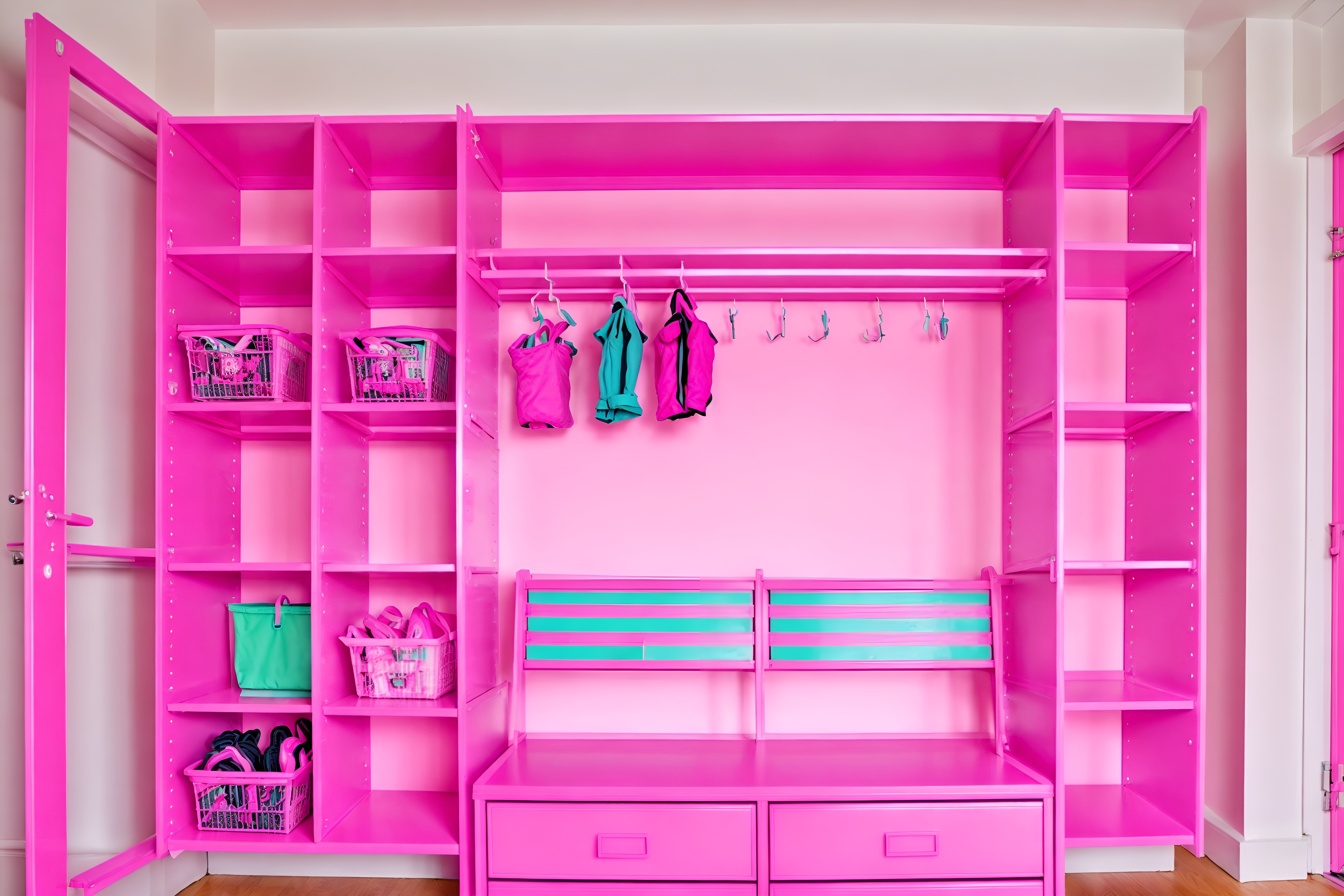 photo from pinterest of hot pink-style interior designed (drop zone interior) with shelves for shoes and lockers and a bench and high up storage and storage drawers and storage baskets and wall hooks for coats and cabinets. . with barbie plastic interior and hot pink barbie colors and hot pink barbie walls and barbie closet and barbie sofa and barbie bold rosy hues like fuchsia and magenta and barbie glitter and sparkle and barbie chairs. . cinematic photo, highly detailed, cinematic lighting, ultra-detailed, ultrarealistic, photorealism, 8k. trending on pinterest. hot pink interior design style. masterpiece, cinematic light, ultrarealistic+, photorealistic+, 8k, raw photo, realistic, sharp focus on eyes, (symmetrical eyes), (intact eyes), hyperrealistic, highest quality, best quality, , highly detailed, masterpiece, best quality, extremely detailed 8k wallpaper, masterpiece, best quality, ultra-detailed, best shadow, detailed background, detailed face, detailed eyes, high contrast, best illumination, detailed face, dulux, caustic, dynamic angle, detailed glow. dramatic lighting. highly detailed, insanely detailed hair, symmetrical, intricate details, professionally retouched, 8k high definition. strong bokeh. award winning photo.