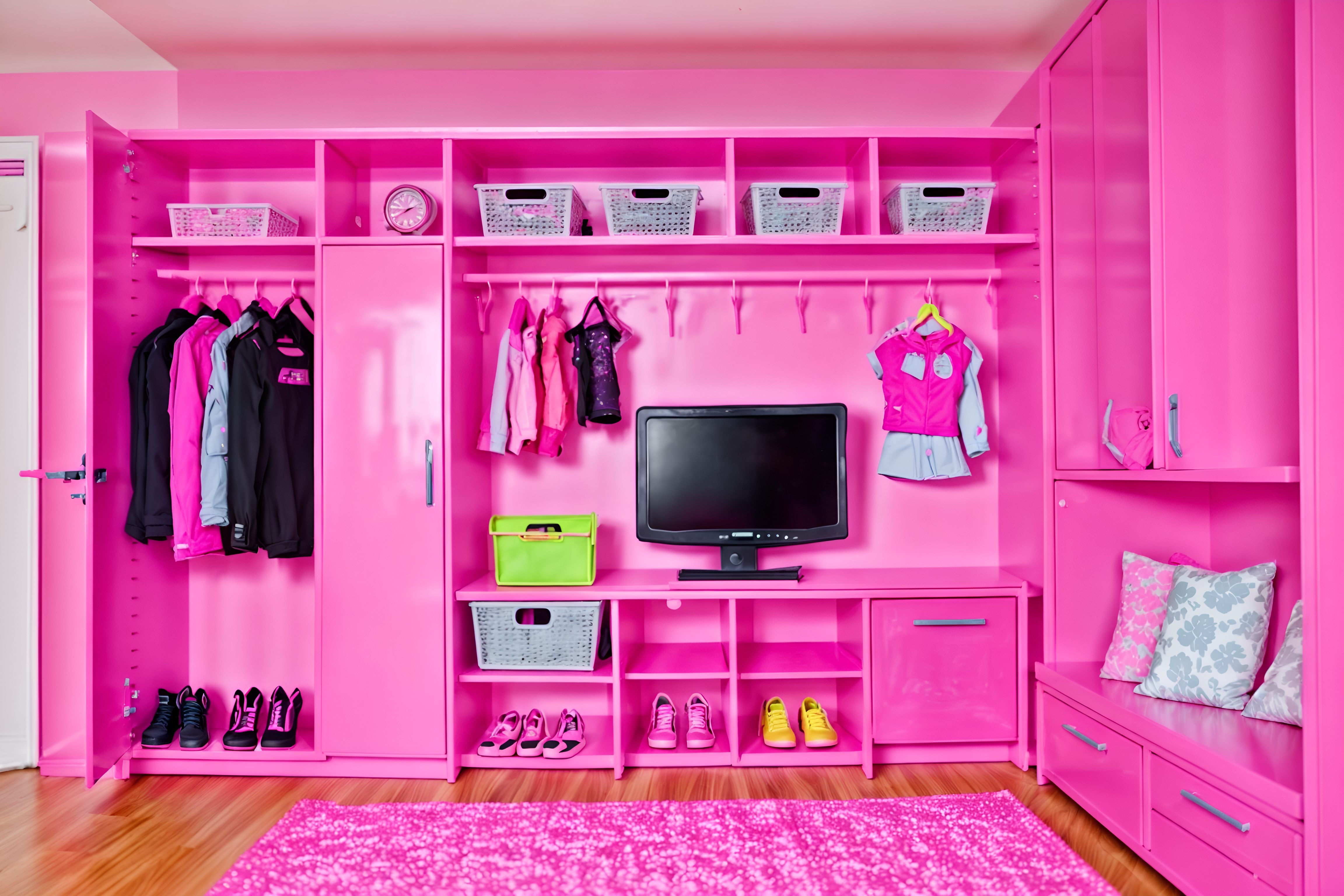 photo from pinterest of hot pink-style interior designed (drop zone interior) with shelves for shoes and lockers and a bench and high up storage and storage drawers and storage baskets and wall hooks for coats and cabinets. . with barbie plastic interior and hot pink barbie colors and hot pink barbie walls and barbie closet and barbie sofa and barbie bold rosy hues like fuchsia and magenta and barbie glitter and sparkle and barbie chairs. . cinematic photo, highly detailed, cinematic lighting, ultra-detailed, ultrarealistic, photorealism, 8k. trending on pinterest. hot pink interior design style. masterpiece, cinematic light, ultrarealistic+, photorealistic+, 8k, raw photo, realistic, sharp focus on eyes, (symmetrical eyes), (intact eyes), hyperrealistic, highest quality, best quality, , highly detailed, masterpiece, best quality, extremely detailed 8k wallpaper, masterpiece, best quality, ultra-detailed, best shadow, detailed background, detailed face, detailed eyes, high contrast, best illumination, detailed face, dulux, caustic, dynamic angle, detailed glow. dramatic lighting. highly detailed, insanely detailed hair, symmetrical, intricate details, professionally retouched, 8k high definition. strong bokeh. award winning photo.