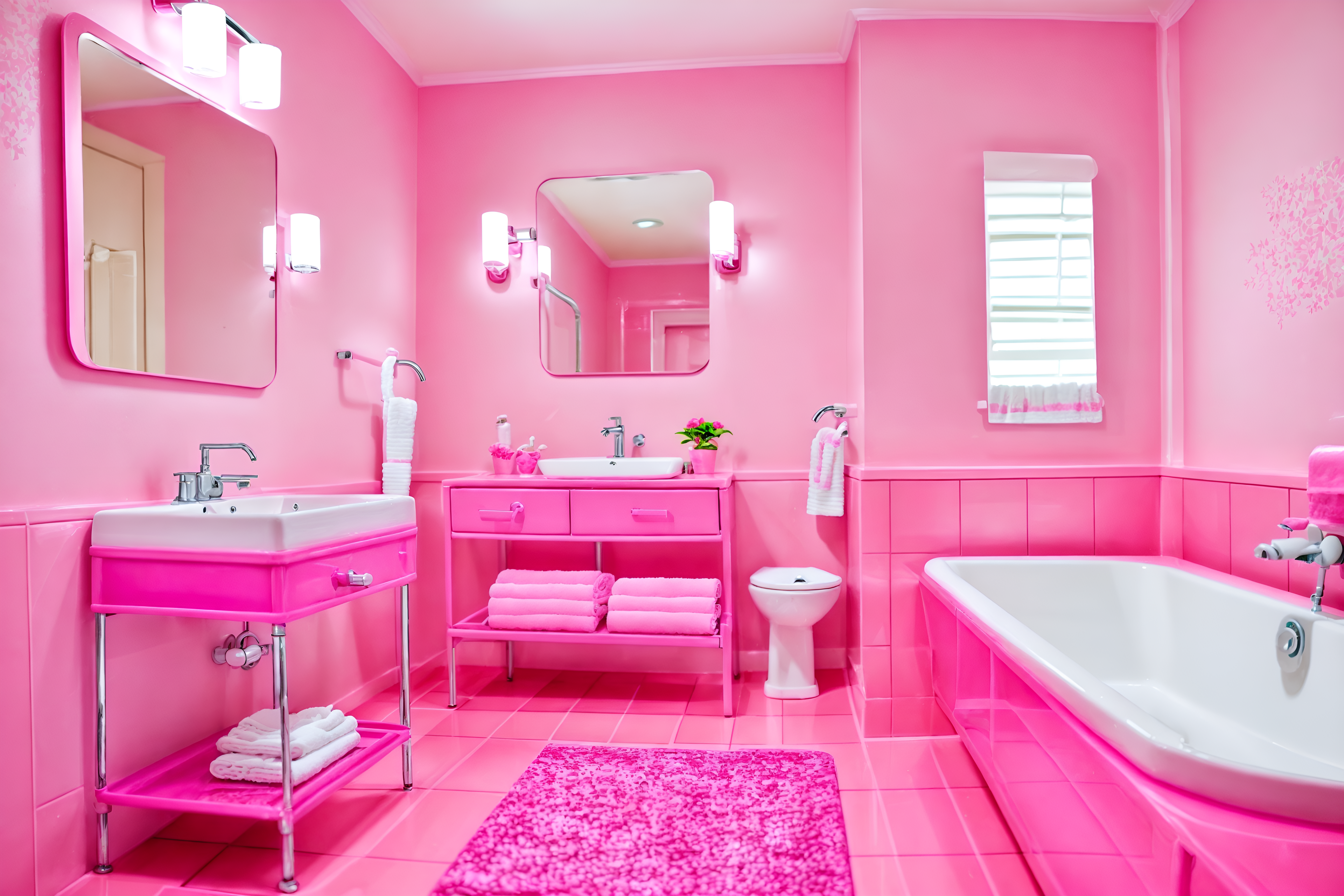 photo from pinterest of hot pink-style interior designed (hotel bathroom interior) with bathroom sink with faucet and plant and shower and bathtub and mirror and bath rail and toilet seat and waste basket. . with hot pink barbie colors and barbie chairs and barbie bold rosy hues like fuchsia and magenta and barbie sofa and barbie style interior and barbie glitter and sparkle and barbie plastic interior and hot pink barbie walls. . cinematic photo, highly detailed, cinematic lighting, ultra-detailed, ultrarealistic, photorealism, 8k. trending on pinterest. hot pink interior design style. masterpiece, cinematic light, ultrarealistic+, photorealistic+, 8k, raw photo, realistic, sharp focus on eyes, (symmetrical eyes), (intact eyes), hyperrealistic, highest quality, best quality, , highly detailed, masterpiece, best quality, extremely detailed 8k wallpaper, masterpiece, best quality, ultra-detailed, best shadow, detailed background, detailed face, detailed eyes, high contrast, best illumination, detailed face, dulux, caustic, dynamic angle, detailed glow. dramatic lighting. highly detailed, insanely detailed hair, symmetrical, intricate details, professionally retouched, 8k high definition. strong bokeh. award winning photo.