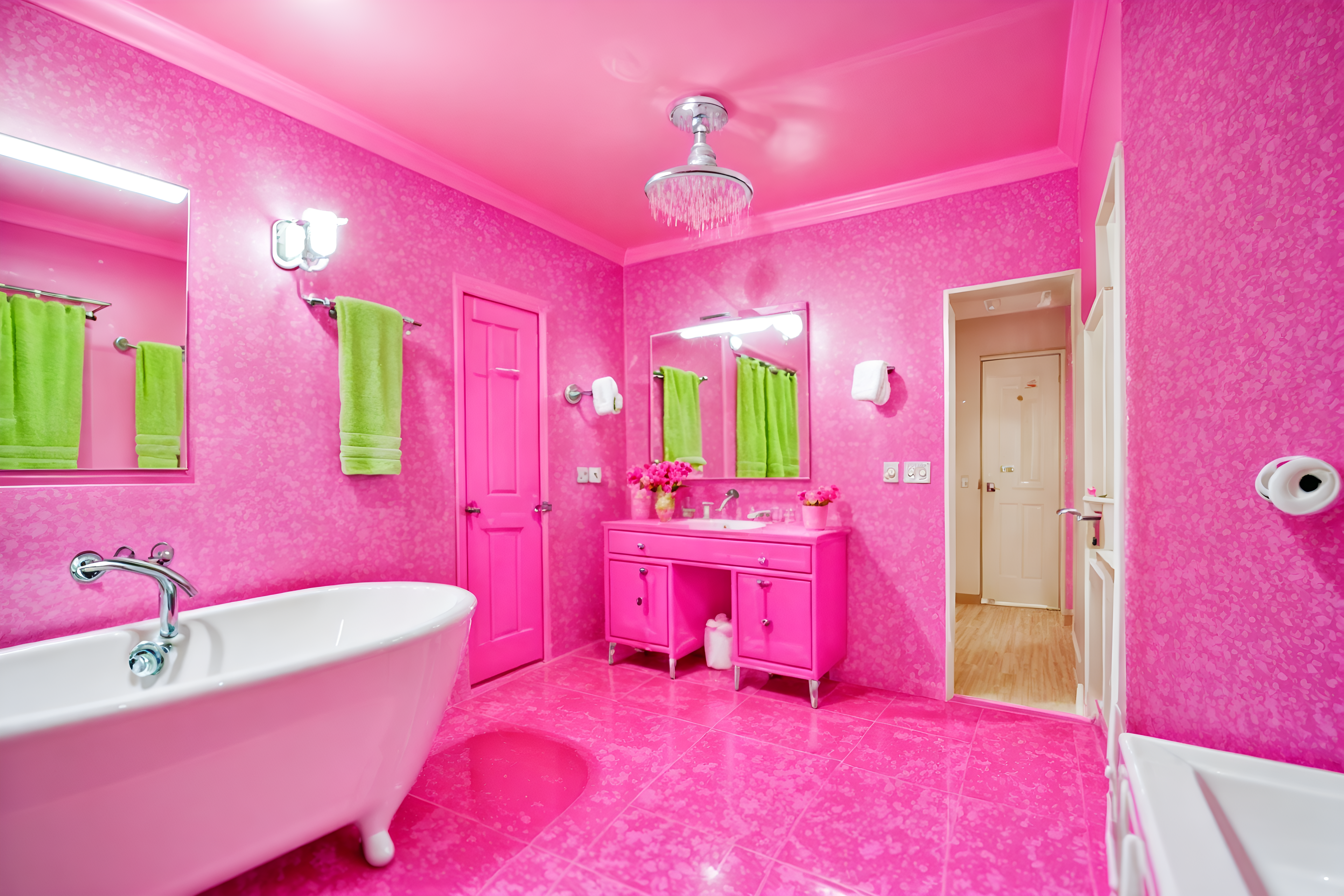 photo from pinterest of hot pink-style interior designed (hotel bathroom interior) with bathroom sink with faucet and plant and shower and bathtub and mirror and bath rail and toilet seat and waste basket. . with hot pink barbie colors and barbie chairs and barbie bold rosy hues like fuchsia and magenta and barbie sofa and barbie style interior and barbie glitter and sparkle and barbie plastic interior and hot pink barbie walls. . cinematic photo, highly detailed, cinematic lighting, ultra-detailed, ultrarealistic, photorealism, 8k. trending on pinterest. hot pink interior design style. masterpiece, cinematic light, ultrarealistic+, photorealistic+, 8k, raw photo, realistic, sharp focus on eyes, (symmetrical eyes), (intact eyes), hyperrealistic, highest quality, best quality, , highly detailed, masterpiece, best quality, extremely detailed 8k wallpaper, masterpiece, best quality, ultra-detailed, best shadow, detailed background, detailed face, detailed eyes, high contrast, best illumination, detailed face, dulux, caustic, dynamic angle, detailed glow. dramatic lighting. highly detailed, insanely detailed hair, symmetrical, intricate details, professionally retouched, 8k high definition. strong bokeh. award winning photo.