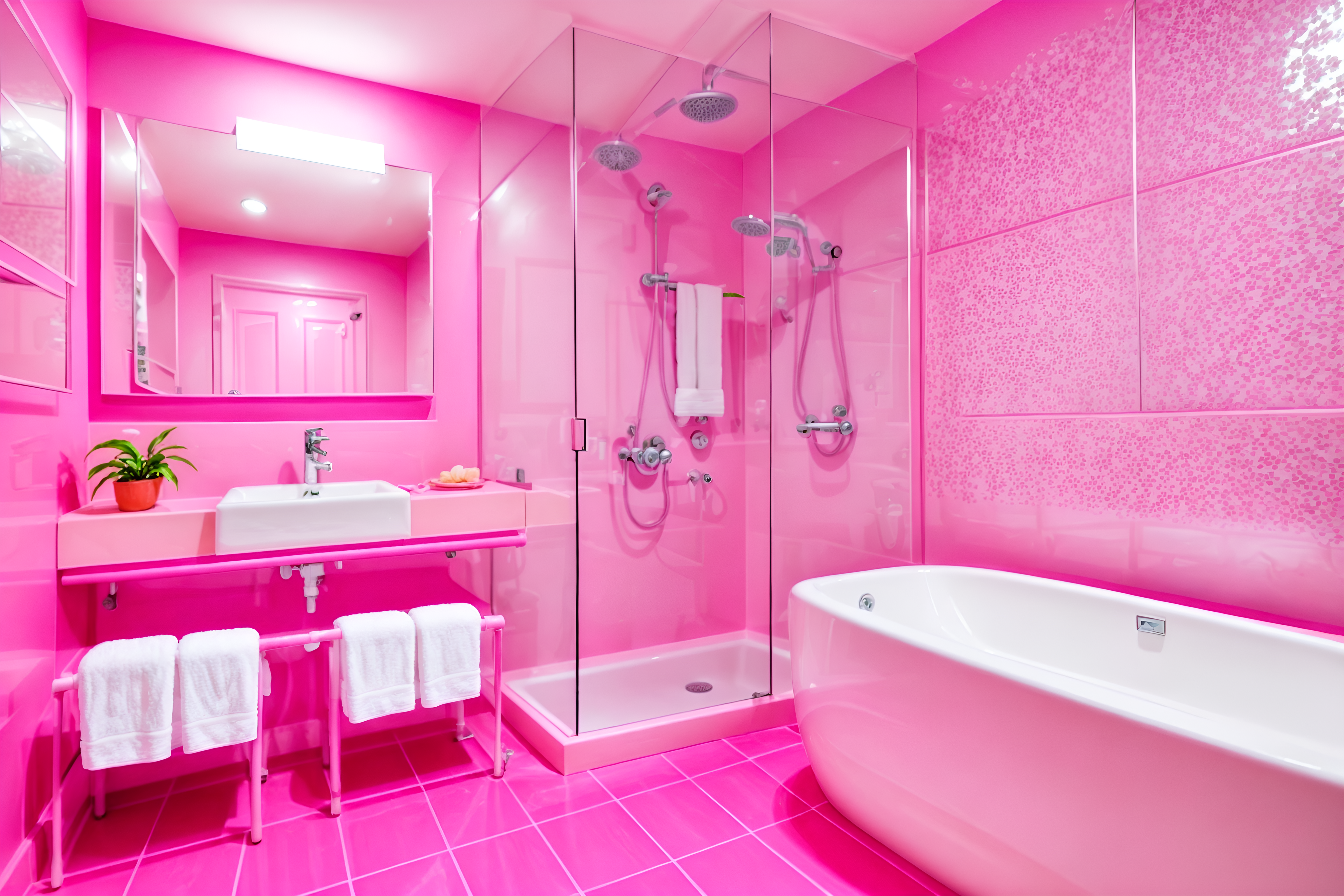 photo from pinterest of hot pink-style interior designed (hotel bathroom interior) with bathroom sink with faucet and plant and shower and bathtub and mirror and bath rail and toilet seat and waste basket. . with hot pink barbie colors and barbie chairs and barbie bold rosy hues like fuchsia and magenta and barbie sofa and barbie style interior and barbie glitter and sparkle and barbie plastic interior and hot pink barbie walls. . cinematic photo, highly detailed, cinematic lighting, ultra-detailed, ultrarealistic, photorealism, 8k. trending on pinterest. hot pink interior design style. masterpiece, cinematic light, ultrarealistic+, photorealistic+, 8k, raw photo, realistic, sharp focus on eyes, (symmetrical eyes), (intact eyes), hyperrealistic, highest quality, best quality, , highly detailed, masterpiece, best quality, extremely detailed 8k wallpaper, masterpiece, best quality, ultra-detailed, best shadow, detailed background, detailed face, detailed eyes, high contrast, best illumination, detailed face, dulux, caustic, dynamic angle, detailed glow. dramatic lighting. highly detailed, insanely detailed hair, symmetrical, intricate details, professionally retouched, 8k high definition. strong bokeh. award winning photo.