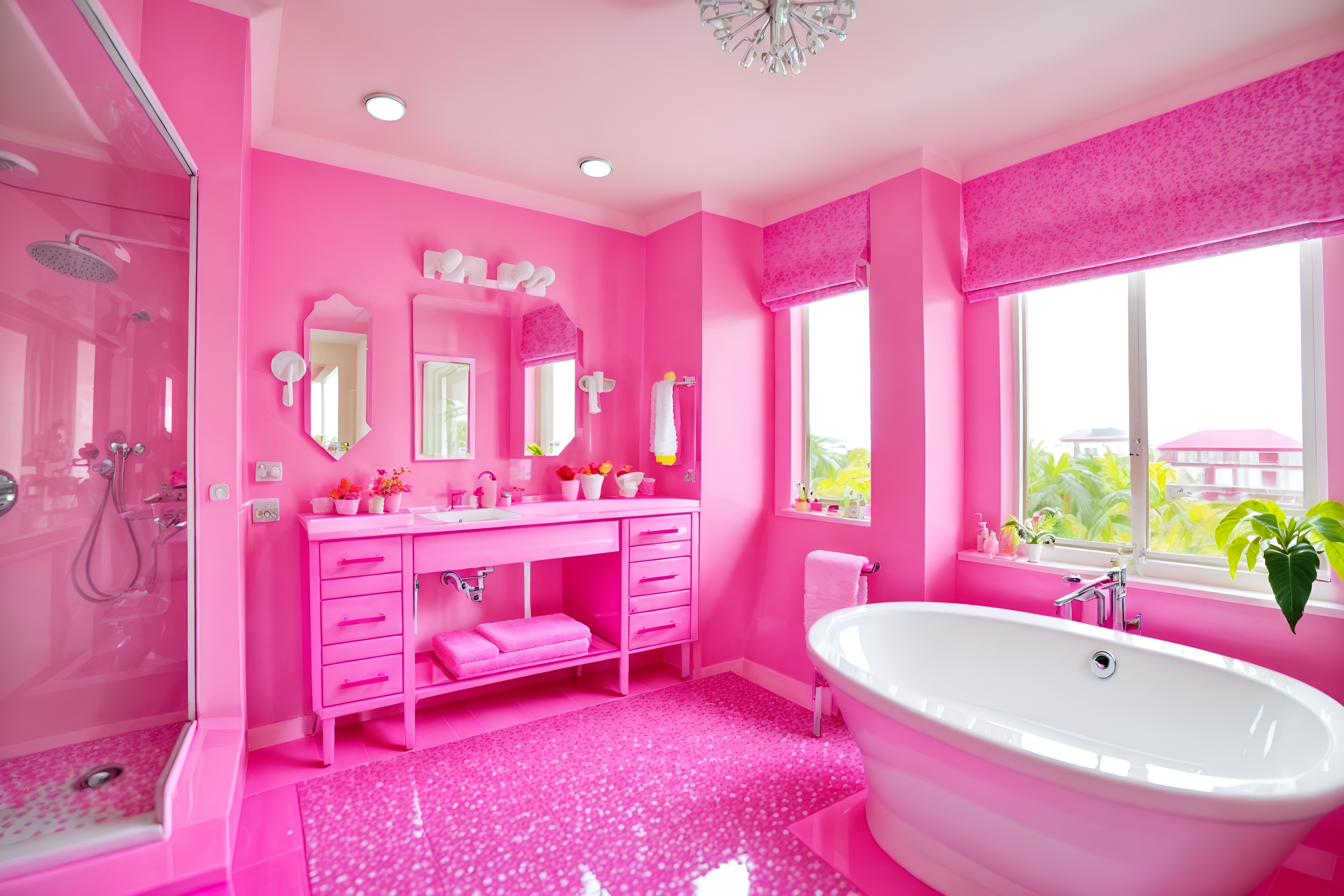photo from pinterest of hot pink-style interior designed (hotel bathroom interior) with bathroom sink with faucet and plant and shower and bathtub and mirror and bath rail and toilet seat and waste basket. . with hot pink barbie colors and barbie chairs and barbie bold rosy hues like fuchsia and magenta and barbie sofa and barbie style interior and barbie glitter and sparkle and barbie plastic interior and hot pink barbie walls. . cinematic photo, highly detailed, cinematic lighting, ultra-detailed, ultrarealistic, photorealism, 8k. trending on pinterest. hot pink interior design style. masterpiece, cinematic light, ultrarealistic+, photorealistic+, 8k, raw photo, realistic, sharp focus on eyes, (symmetrical eyes), (intact eyes), hyperrealistic, highest quality, best quality, , highly detailed, masterpiece, best quality, extremely detailed 8k wallpaper, masterpiece, best quality, ultra-detailed, best shadow, detailed background, detailed face, detailed eyes, high contrast, best illumination, detailed face, dulux, caustic, dynamic angle, detailed glow. dramatic lighting. highly detailed, insanely detailed hair, symmetrical, intricate details, professionally retouched, 8k high definition. strong bokeh. award winning photo.