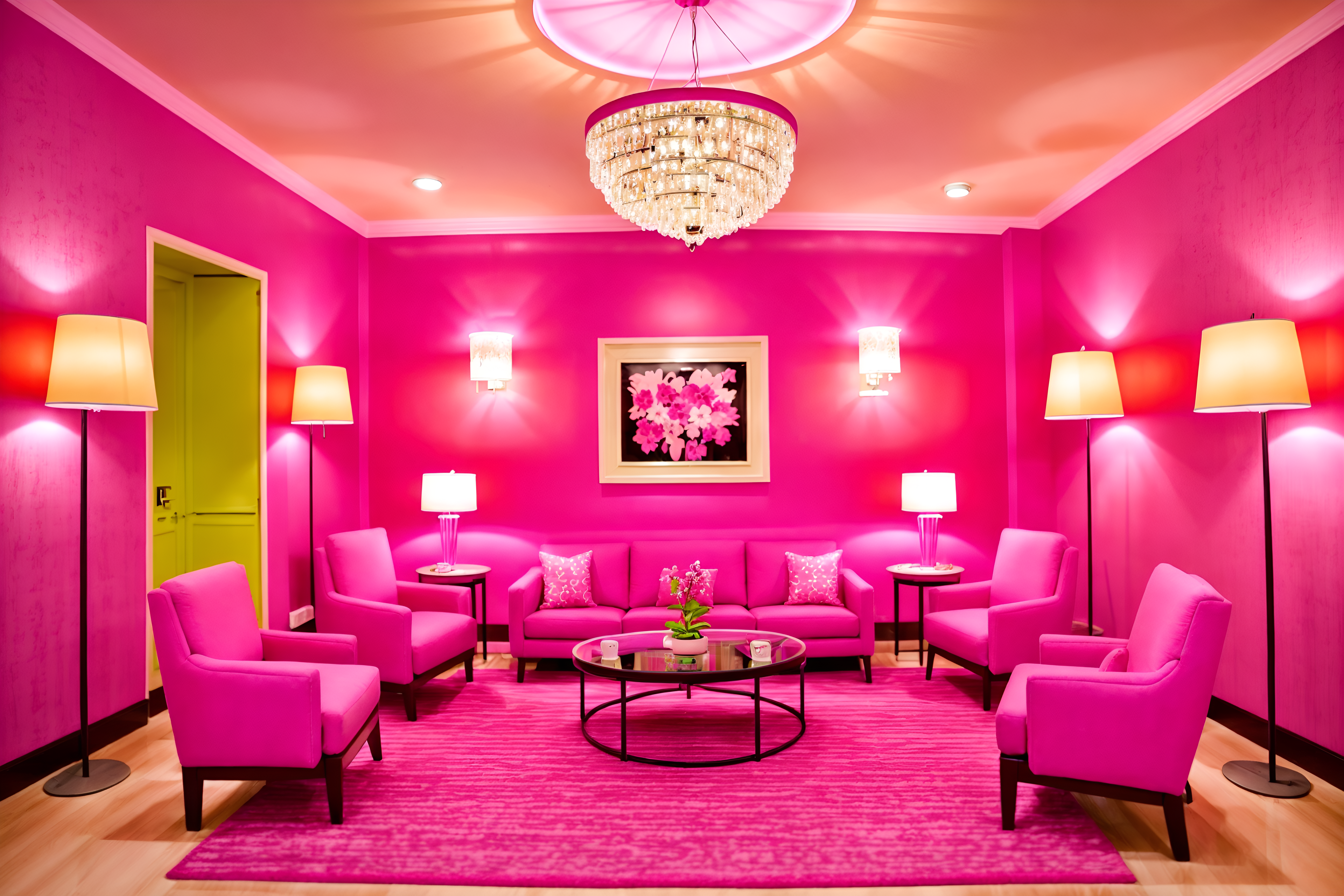 photo from pinterest of hot pink-style interior designed (hotel lobby interior) with hanging lamps and furniture and coffee tables and lounge chairs and rug and check in desk and sofas and plant. . with barbie chairs and barbie bold rosy hues like fuchsia and magenta and barbie glitter and sparkle and hot pink barbie walls and barbie plastic interior and barbie sofa and hot pink barbie colors and barbie style interior. . cinematic photo, highly detailed, cinematic lighting, ultra-detailed, ultrarealistic, photorealism, 8k. trending on pinterest. hot pink interior design style. masterpiece, cinematic light, ultrarealistic+, photorealistic+, 8k, raw photo, realistic, sharp focus on eyes, (symmetrical eyes), (intact eyes), hyperrealistic, highest quality, best quality, , highly detailed, masterpiece, best quality, extremely detailed 8k wallpaper, masterpiece, best quality, ultra-detailed, best shadow, detailed background, detailed face, detailed eyes, high contrast, best illumination, detailed face, dulux, caustic, dynamic angle, detailed glow. dramatic lighting. highly detailed, insanely detailed hair, symmetrical, intricate details, professionally retouched, 8k high definition. strong bokeh. award winning photo.