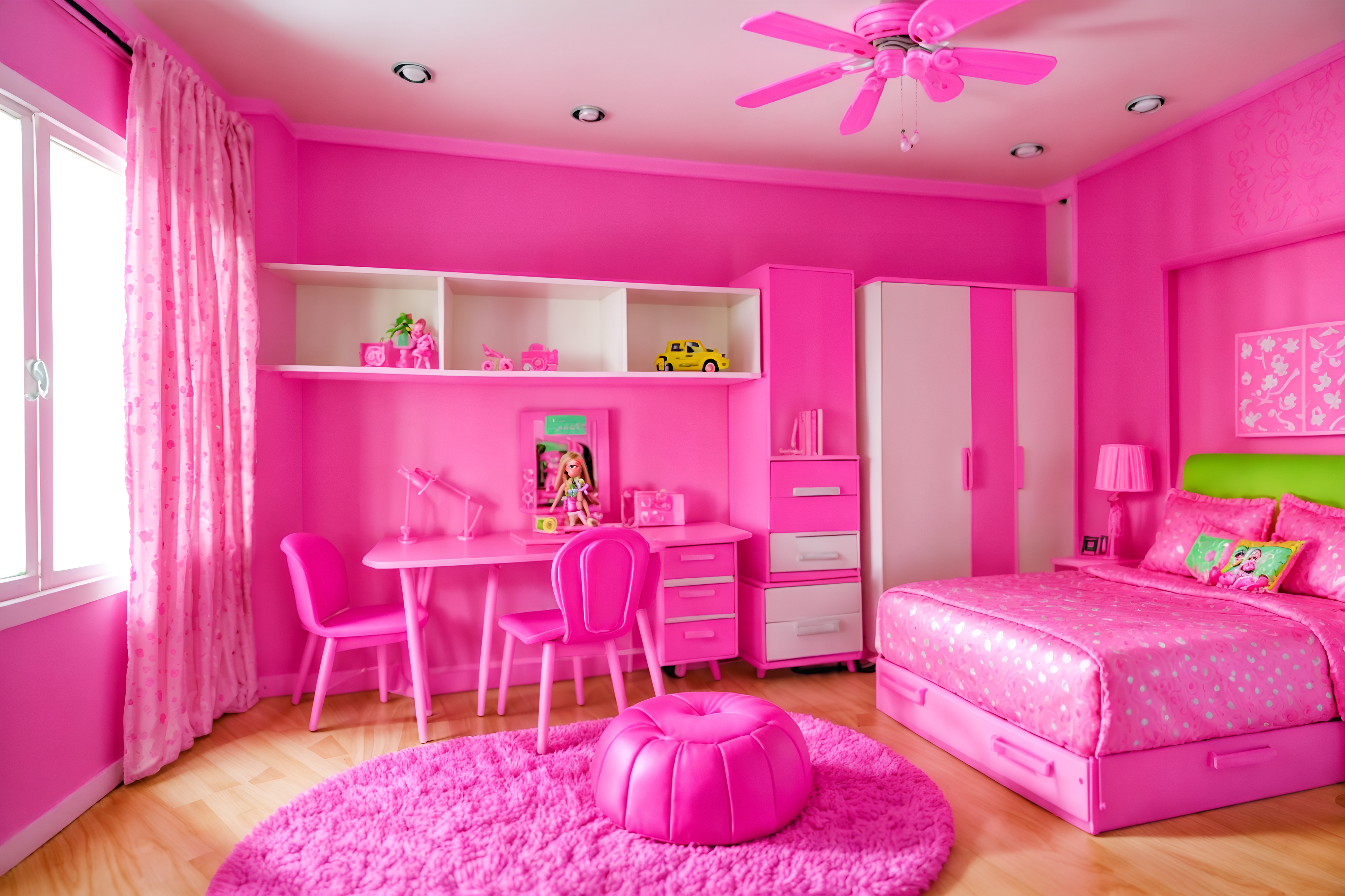 photo from pinterest of hot pink-style interior designed (kids room interior) with accent chair and plant and dresser closet and bedside table or night stand and storage bench or ottoman and kids desk and night light and headboard. . with barbie plastic interior and barbie sofa and barbie chairs and hot pink barbie colors and barbie bold rosy hues like fuchsia and magenta and barbie style interior and barbie glitter and sparkle and hot pink barbie walls. . cinematic photo, highly detailed, cinematic lighting, ultra-detailed, ultrarealistic, photorealism, 8k. trending on pinterest. hot pink interior design style. masterpiece, cinematic light, ultrarealistic+, photorealistic+, 8k, raw photo, realistic, sharp focus on eyes, (symmetrical eyes), (intact eyes), hyperrealistic, highest quality, best quality, , highly detailed, masterpiece, best quality, extremely detailed 8k wallpaper, masterpiece, best quality, ultra-detailed, best shadow, detailed background, detailed face, detailed eyes, high contrast, best illumination, detailed face, dulux, caustic, dynamic angle, detailed glow. dramatic lighting. highly detailed, insanely detailed hair, symmetrical, intricate details, professionally retouched, 8k high definition. strong bokeh. award winning photo.
