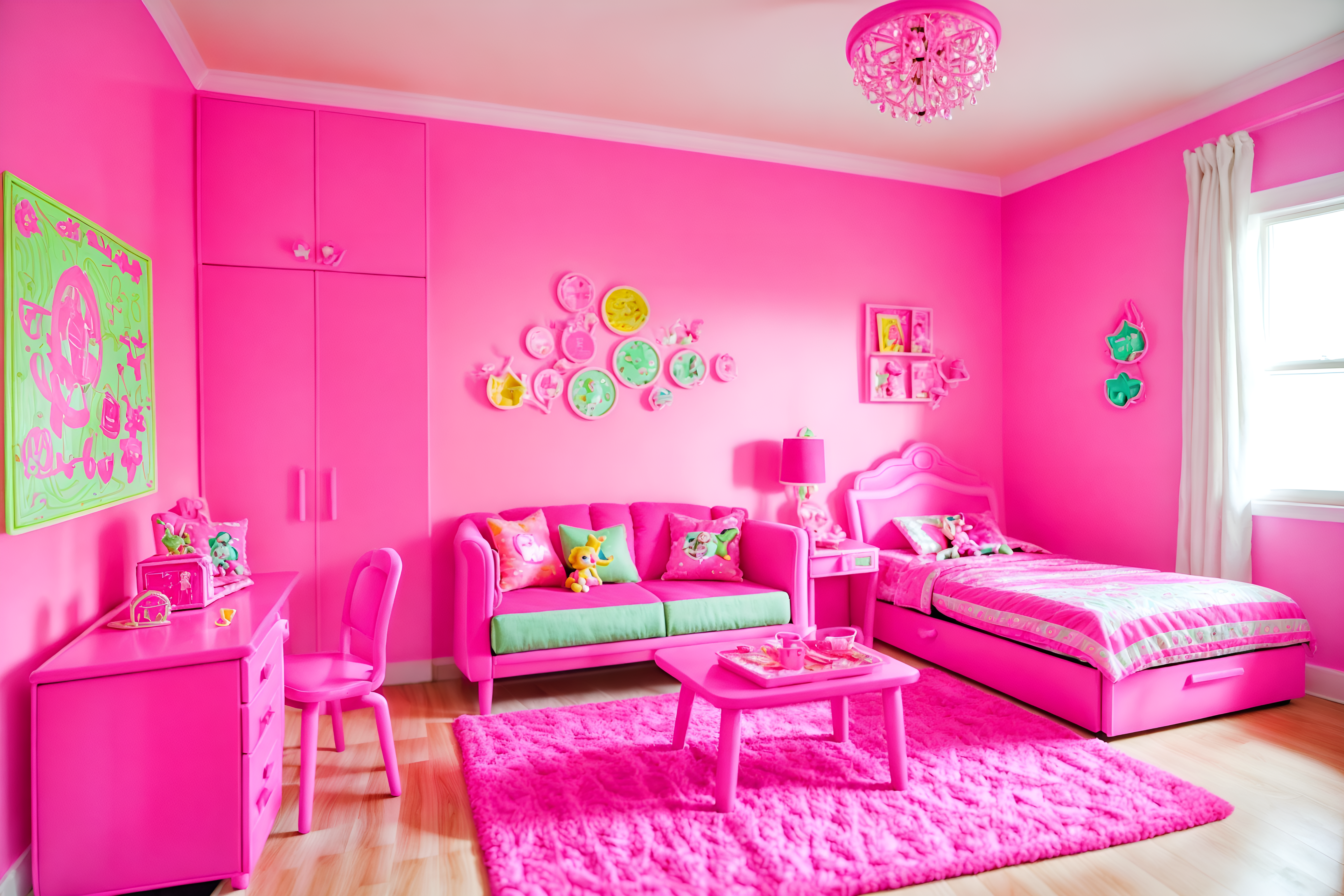 photo from pinterest of hot pink-style interior designed (kids room interior) with accent chair and plant and dresser closet and bedside table or night stand and storage bench or ottoman and kids desk and night light and headboard. . with barbie plastic interior and barbie sofa and barbie chairs and hot pink barbie colors and barbie bold rosy hues like fuchsia and magenta and barbie style interior and barbie glitter and sparkle and hot pink barbie walls. . cinematic photo, highly detailed, cinematic lighting, ultra-detailed, ultrarealistic, photorealism, 8k. trending on pinterest. hot pink interior design style. masterpiece, cinematic light, ultrarealistic+, photorealistic+, 8k, raw photo, realistic, sharp focus on eyes, (symmetrical eyes), (intact eyes), hyperrealistic, highest quality, best quality, , highly detailed, masterpiece, best quality, extremely detailed 8k wallpaper, masterpiece, best quality, ultra-detailed, best shadow, detailed background, detailed face, detailed eyes, high contrast, best illumination, detailed face, dulux, caustic, dynamic angle, detailed glow. dramatic lighting. highly detailed, insanely detailed hair, symmetrical, intricate details, professionally retouched, 8k high definition. strong bokeh. award winning photo.