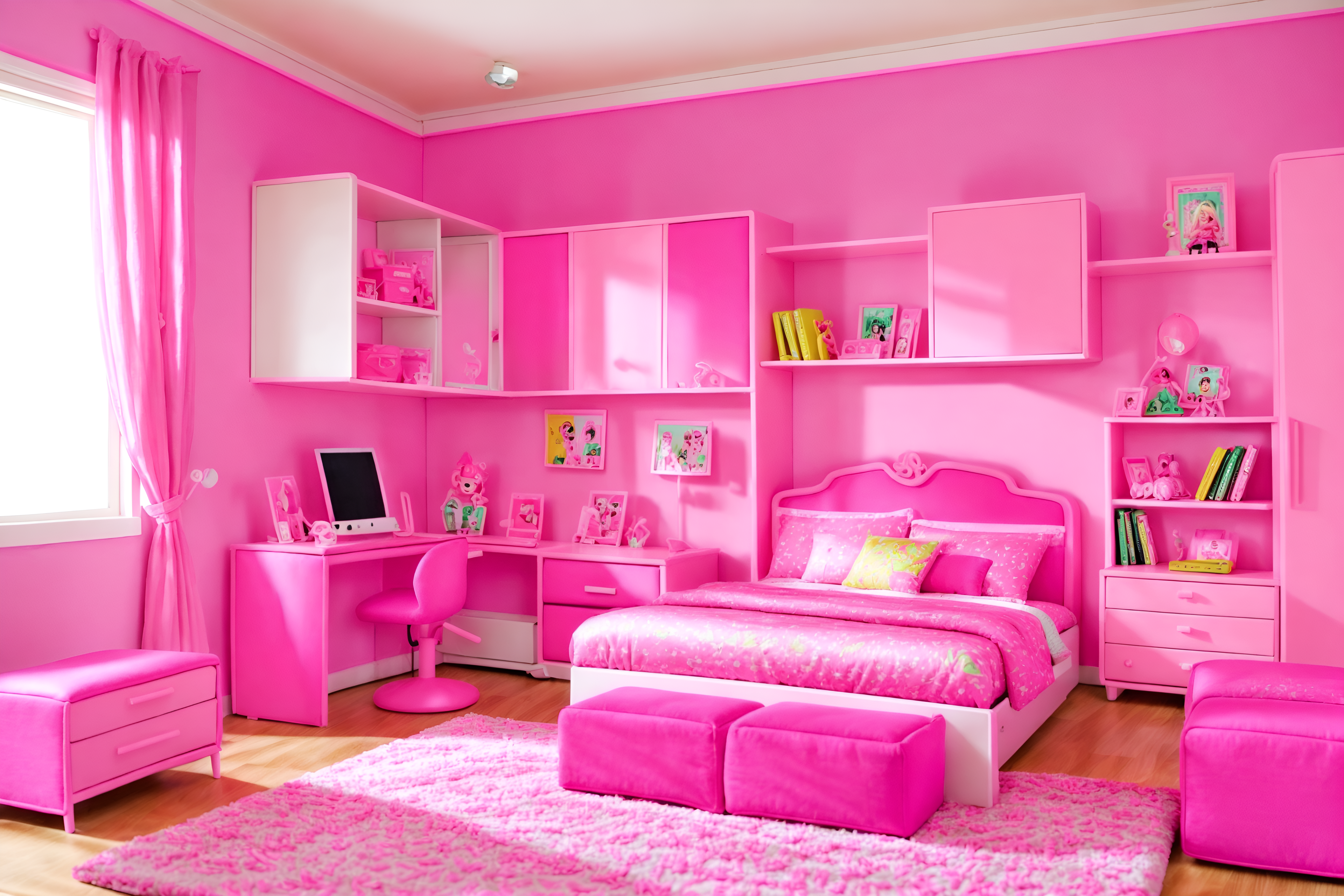 photo from pinterest of hot pink-style interior designed (kids room interior) with accent chair and plant and dresser closet and bedside table or night stand and storage bench or ottoman and kids desk and night light and headboard. . with barbie plastic interior and barbie sofa and barbie chairs and hot pink barbie colors and barbie bold rosy hues like fuchsia and magenta and barbie style interior and barbie glitter and sparkle and hot pink barbie walls. . cinematic photo, highly detailed, cinematic lighting, ultra-detailed, ultrarealistic, photorealism, 8k. trending on pinterest. hot pink interior design style. masterpiece, cinematic light, ultrarealistic+, photorealistic+, 8k, raw photo, realistic, sharp focus on eyes, (symmetrical eyes), (intact eyes), hyperrealistic, highest quality, best quality, , highly detailed, masterpiece, best quality, extremely detailed 8k wallpaper, masterpiece, best quality, ultra-detailed, best shadow, detailed background, detailed face, detailed eyes, high contrast, best illumination, detailed face, dulux, caustic, dynamic angle, detailed glow. dramatic lighting. highly detailed, insanely detailed hair, symmetrical, intricate details, professionally retouched, 8k high definition. strong bokeh. award winning photo.
