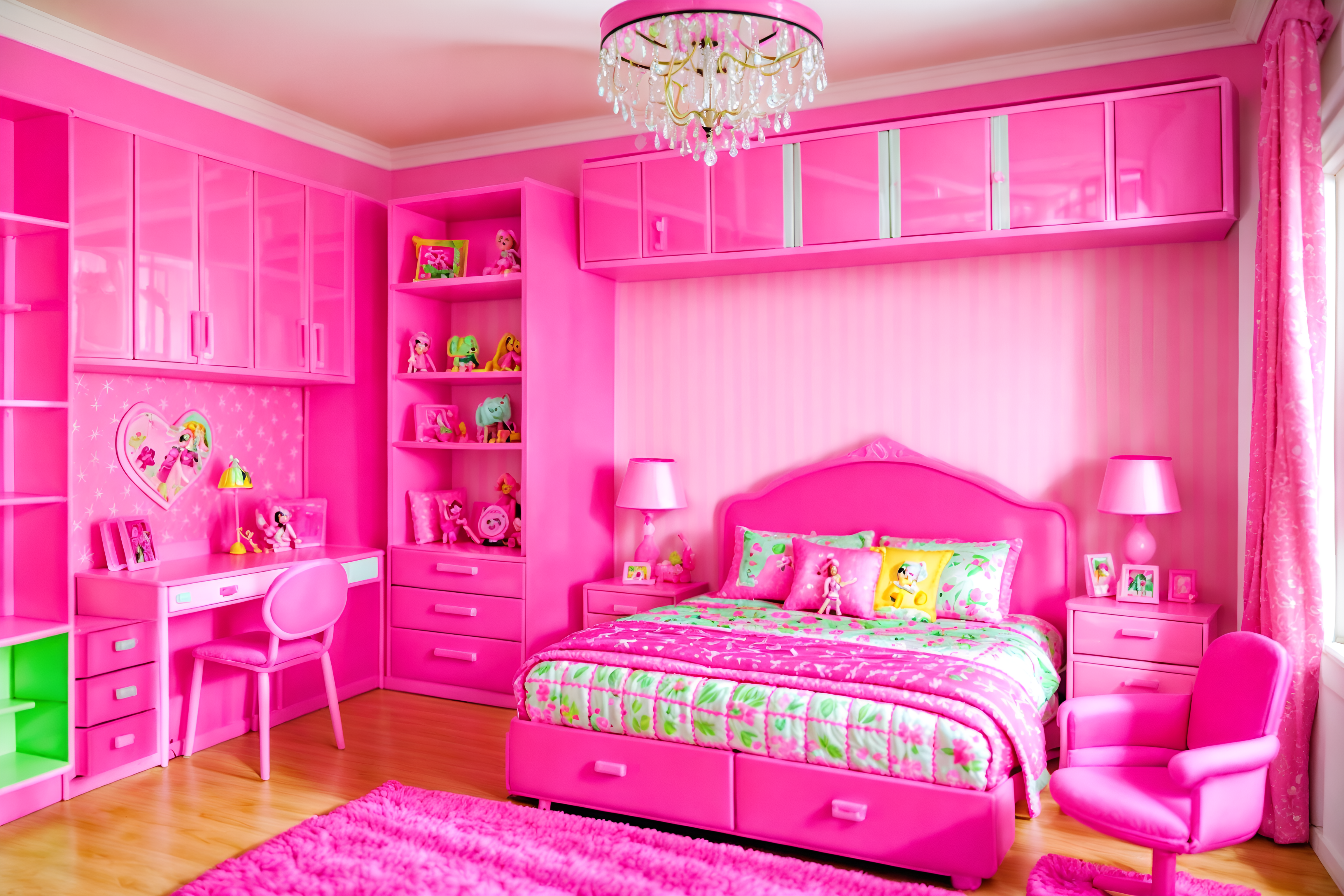 photo from pinterest of hot pink-style interior designed (kids room interior) with accent chair and plant and dresser closet and bedside table or night stand and storage bench or ottoman and kids desk and night light and headboard. . with barbie plastic interior and barbie sofa and barbie chairs and hot pink barbie colors and barbie bold rosy hues like fuchsia and magenta and barbie style interior and barbie glitter and sparkle and hot pink barbie walls. . cinematic photo, highly detailed, cinematic lighting, ultra-detailed, ultrarealistic, photorealism, 8k. trending on pinterest. hot pink interior design style. masterpiece, cinematic light, ultrarealistic+, photorealistic+, 8k, raw photo, realistic, sharp focus on eyes, (symmetrical eyes), (intact eyes), hyperrealistic, highest quality, best quality, , highly detailed, masterpiece, best quality, extremely detailed 8k wallpaper, masterpiece, best quality, ultra-detailed, best shadow, detailed background, detailed face, detailed eyes, high contrast, best illumination, detailed face, dulux, caustic, dynamic angle, detailed glow. dramatic lighting. highly detailed, insanely detailed hair, symmetrical, intricate details, professionally retouched, 8k high definition. strong bokeh. award winning photo.