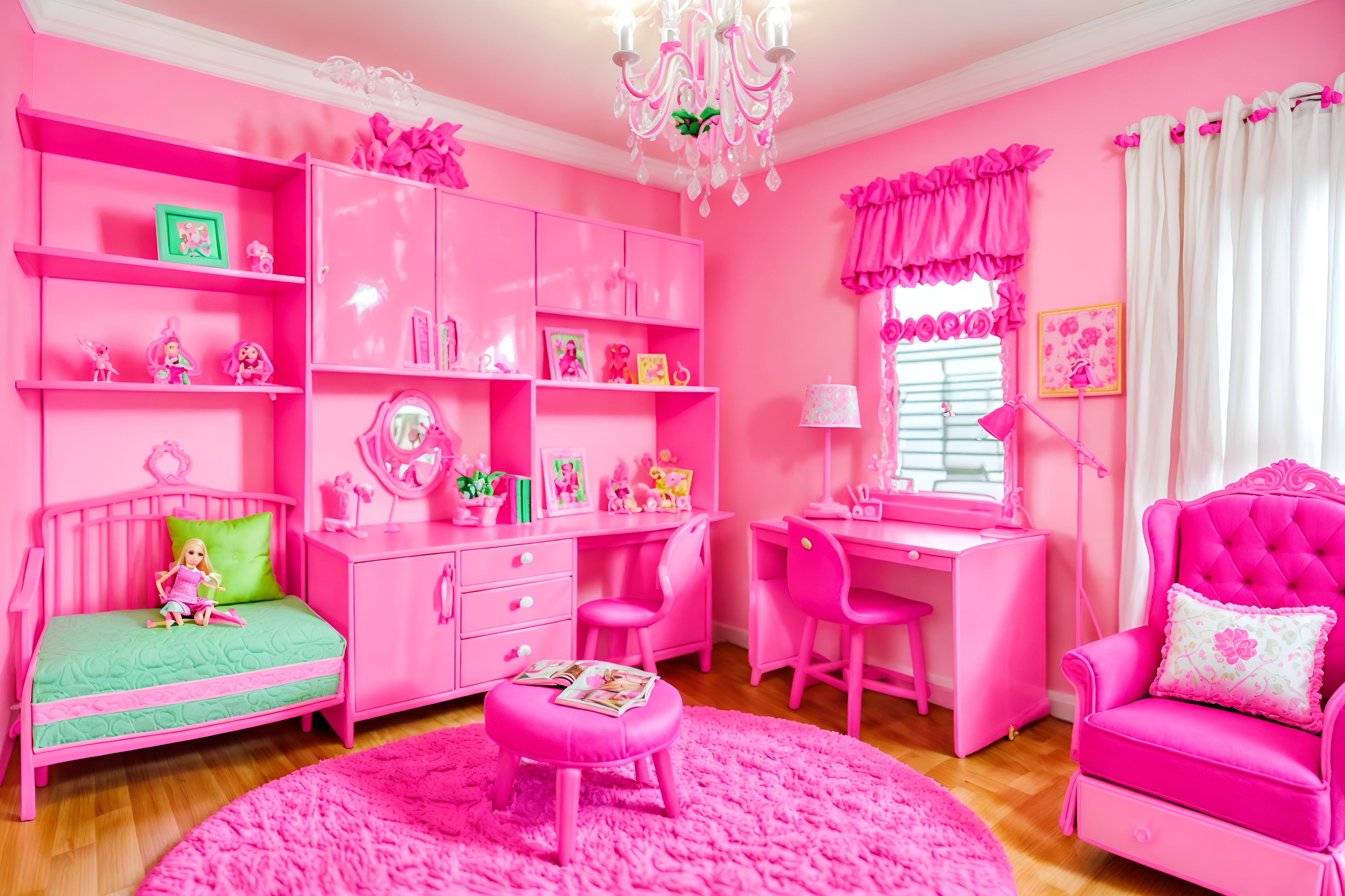 photo from pinterest of hot pink-style interior designed (kids room interior) with accent chair and plant and dresser closet and bedside table or night stand and storage bench or ottoman and kids desk and night light and headboard. . with barbie plastic interior and barbie sofa and barbie chairs and hot pink barbie colors and barbie bold rosy hues like fuchsia and magenta and barbie style interior and barbie glitter and sparkle and hot pink barbie walls. . cinematic photo, highly detailed, cinematic lighting, ultra-detailed, ultrarealistic, photorealism, 8k. trending on pinterest. hot pink interior design style. masterpiece, cinematic light, ultrarealistic+, photorealistic+, 8k, raw photo, realistic, sharp focus on eyes, (symmetrical eyes), (intact eyes), hyperrealistic, highest quality, best quality, , highly detailed, masterpiece, best quality, extremely detailed 8k wallpaper, masterpiece, best quality, ultra-detailed, best shadow, detailed background, detailed face, detailed eyes, high contrast, best illumination, detailed face, dulux, caustic, dynamic angle, detailed glow. dramatic lighting. highly detailed, insanely detailed hair, symmetrical, intricate details, professionally retouched, 8k high definition. strong bokeh. award winning photo.
